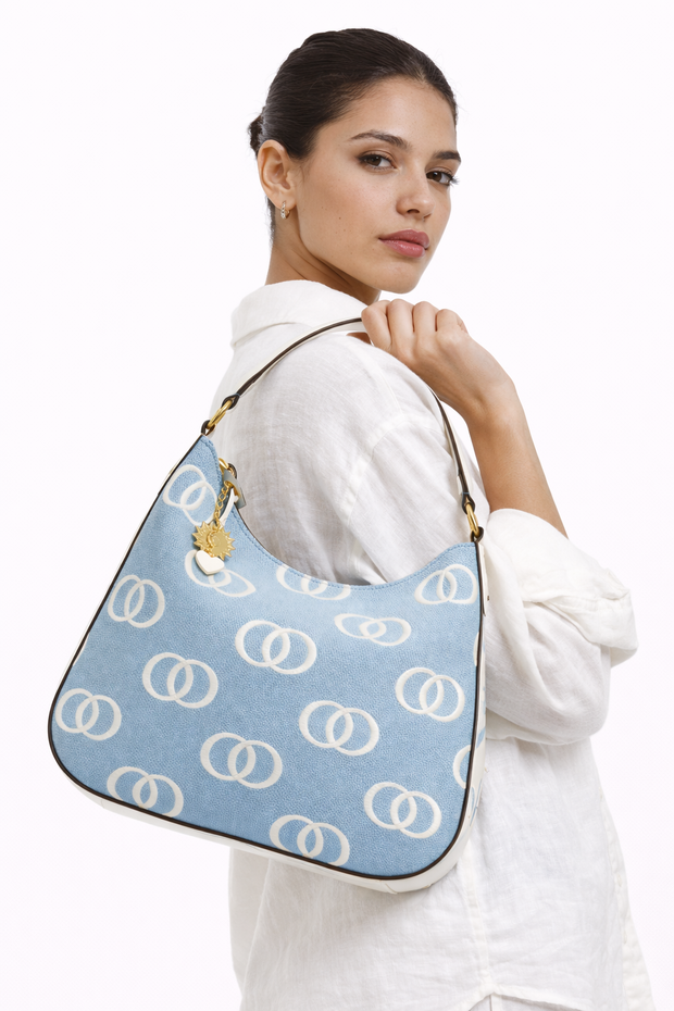 This collection is designed to make you feel completely unburdened without ever losing your anchor. The bold, gold Interlocked O's rest heavily at the center, securing your narrative, while the Céleste silk whispers that the sky is yours.