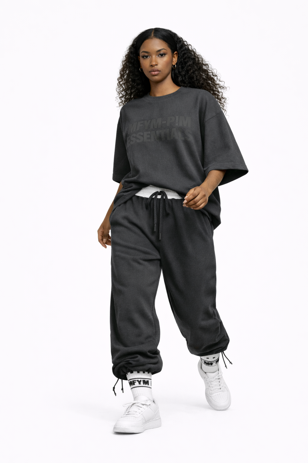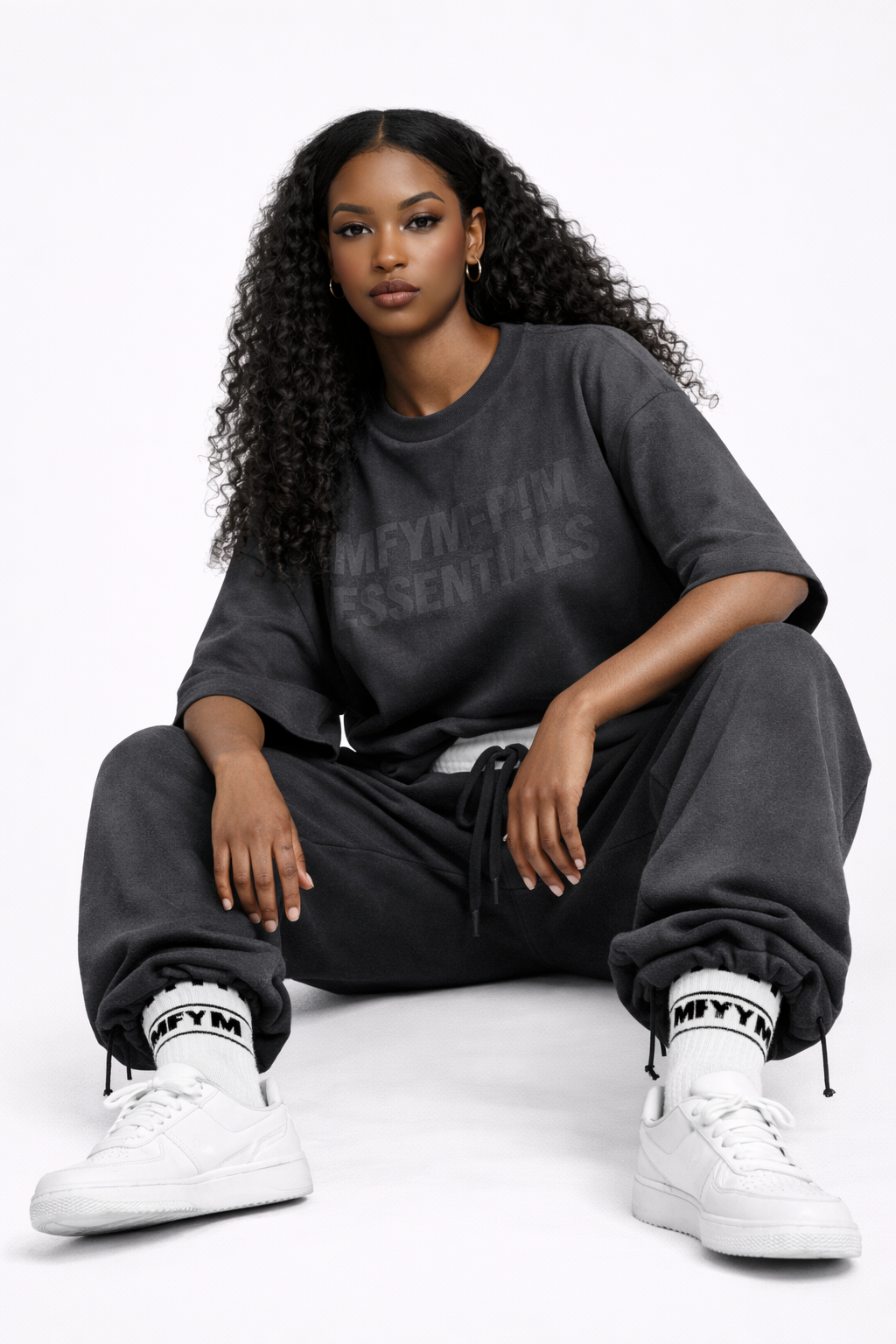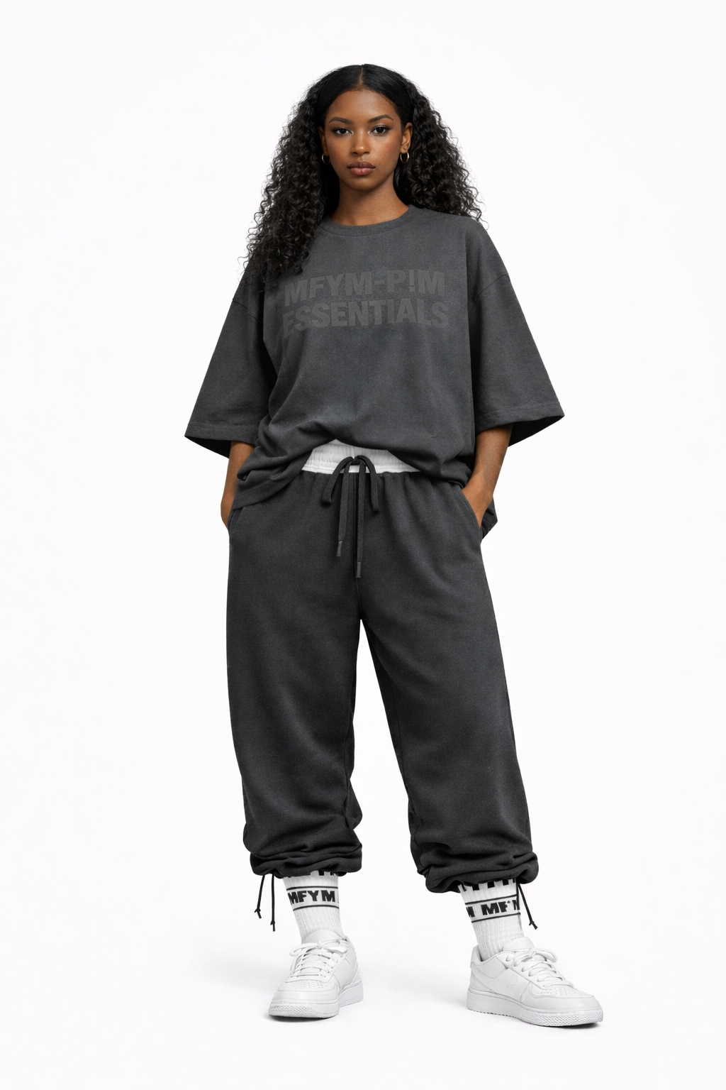 Authority in the shadows. The MFYM-P|M Vintage Stealth Tee applies our most discreet graphic treatment to our most character-rich fabric. Expertly cut from our signature heavyweight cotton jersey, the garment undergoes a rigorous wash process to achieve a deep, vintage charcoal hue with a soft, lived-in texture. The chest features the definitive typographic stack—the hybrid 'MFYM-P!M' acronym above 'ESSENTIALS'—executed in a tonal dark grey print that sits barely visible against the charcoal base. This 'ghost' effect creates a graphic that is felt more than seen, rewarding closer inspection with its precision edges and industrial layout. With a relaxed drop-shoulder silhouette and a structured crew neck, it is the ultimate uniform for the understated insider.