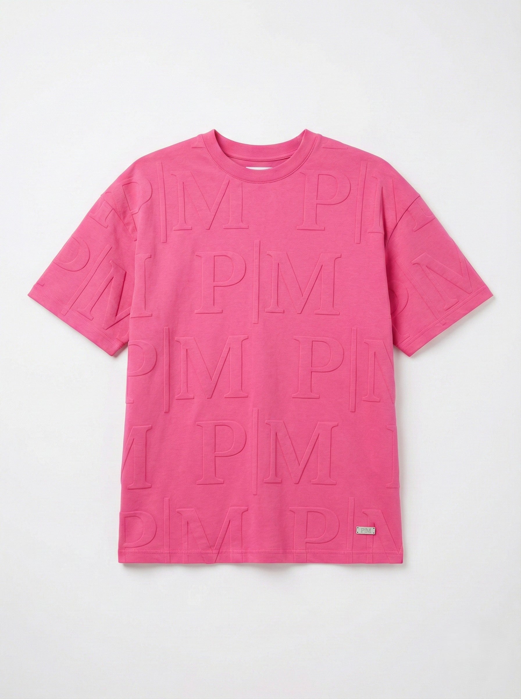 A tactile masterpiece of modern branding. The PM Sculpted Icon Tee transforms the logo into a structural element. Crafted from ultra-heavyweight, premium cotton jersey in a vivid fuchsia pink, this piece is defined by its oversized 'PM' monogram, embossed directly into the fabric to create a deep, 3D relief effect. The play of light and shadow across the raised lettering adds architectural depth to the silhouette. Cut for a relaxed, boxy fit and finished with a signature metal logo plate at the hem, it is a garment designed to be felt as much as seen.