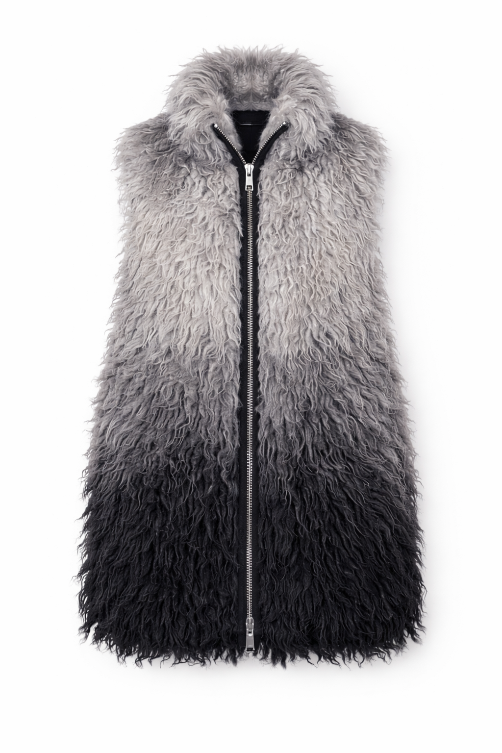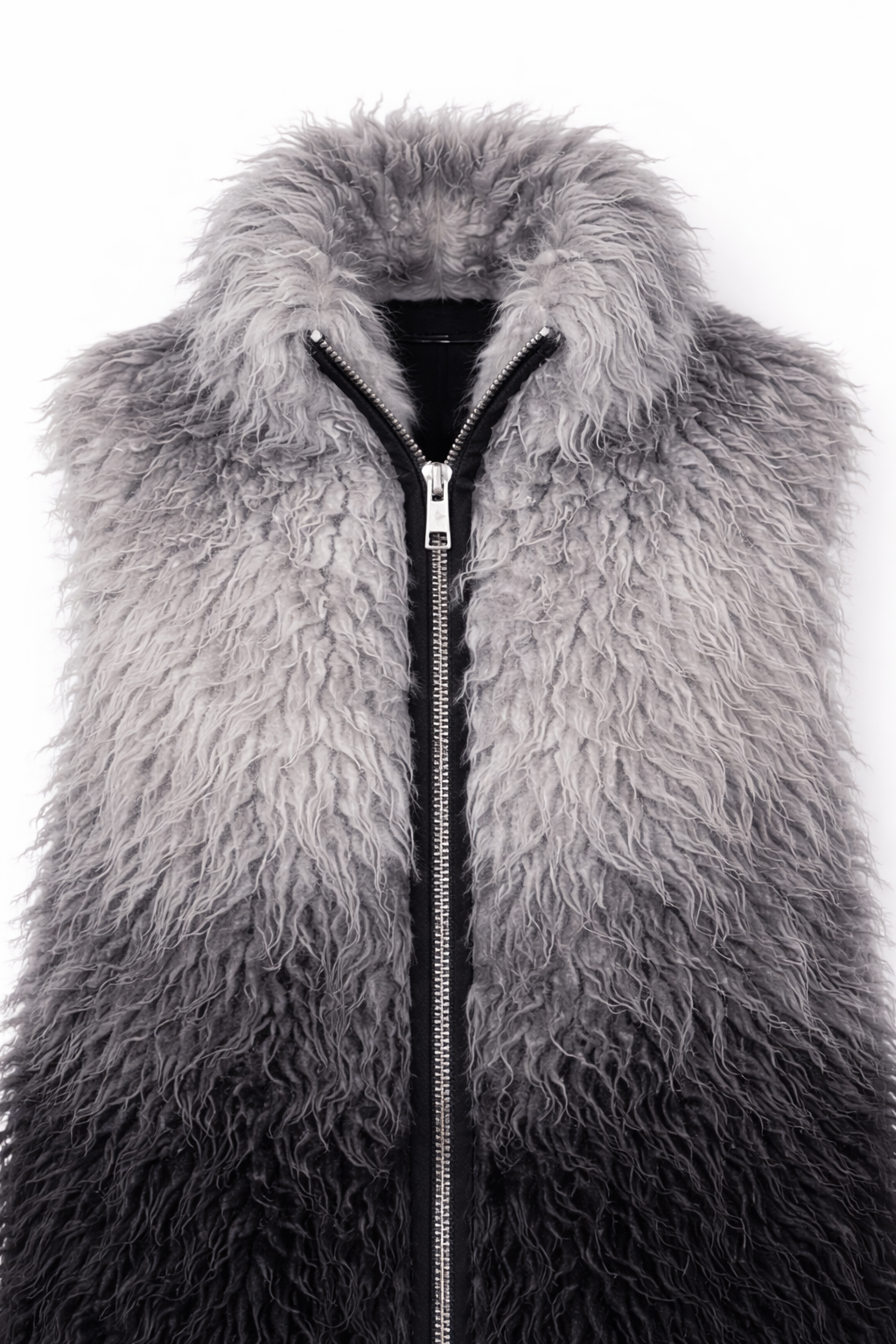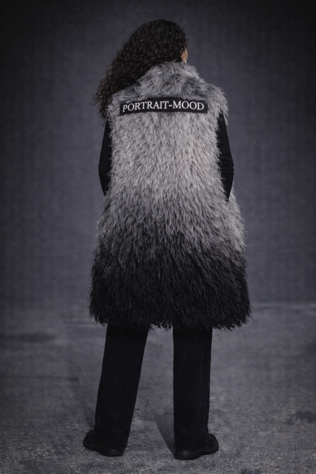 The spectrum of shadow. The P|M 'Eclipse' Ombre Fur Vest captures the transition from light to dark in a single, kinetic garment. Constructed from the house’s most voluminous high-pile eco-fur, the fiber features a dramatic, artisanal gradient that fades seamlessly from a pristine 'Silver' grey at the collar to a deep, ink-black 'Noir' at the hem. The silhouette is sleeveless and long-line, designed to add massive textural volume to the core while leaving the arms free for movement. The back reveals the garment’s signature: a structured black rectangular patch spans the shoulders, embroidered with 'PORTRAIT-MOOD' in stark white capital letters—a graphic interruption in the wild texture. Secured with a heavy silver center-front zipper, it is a piece that feels alive."