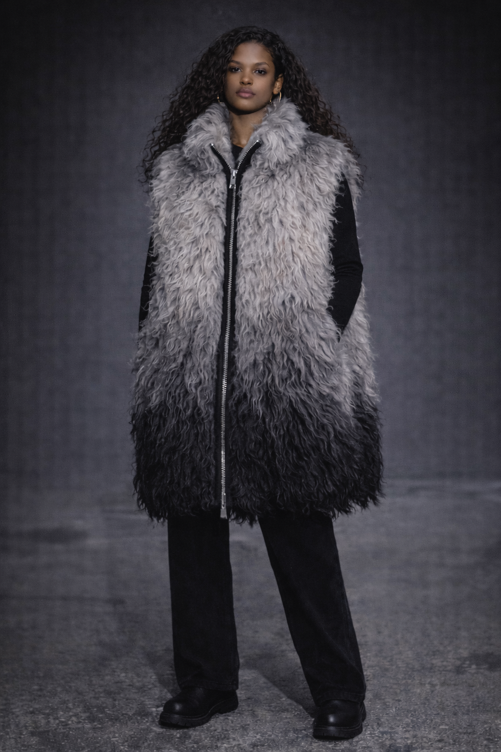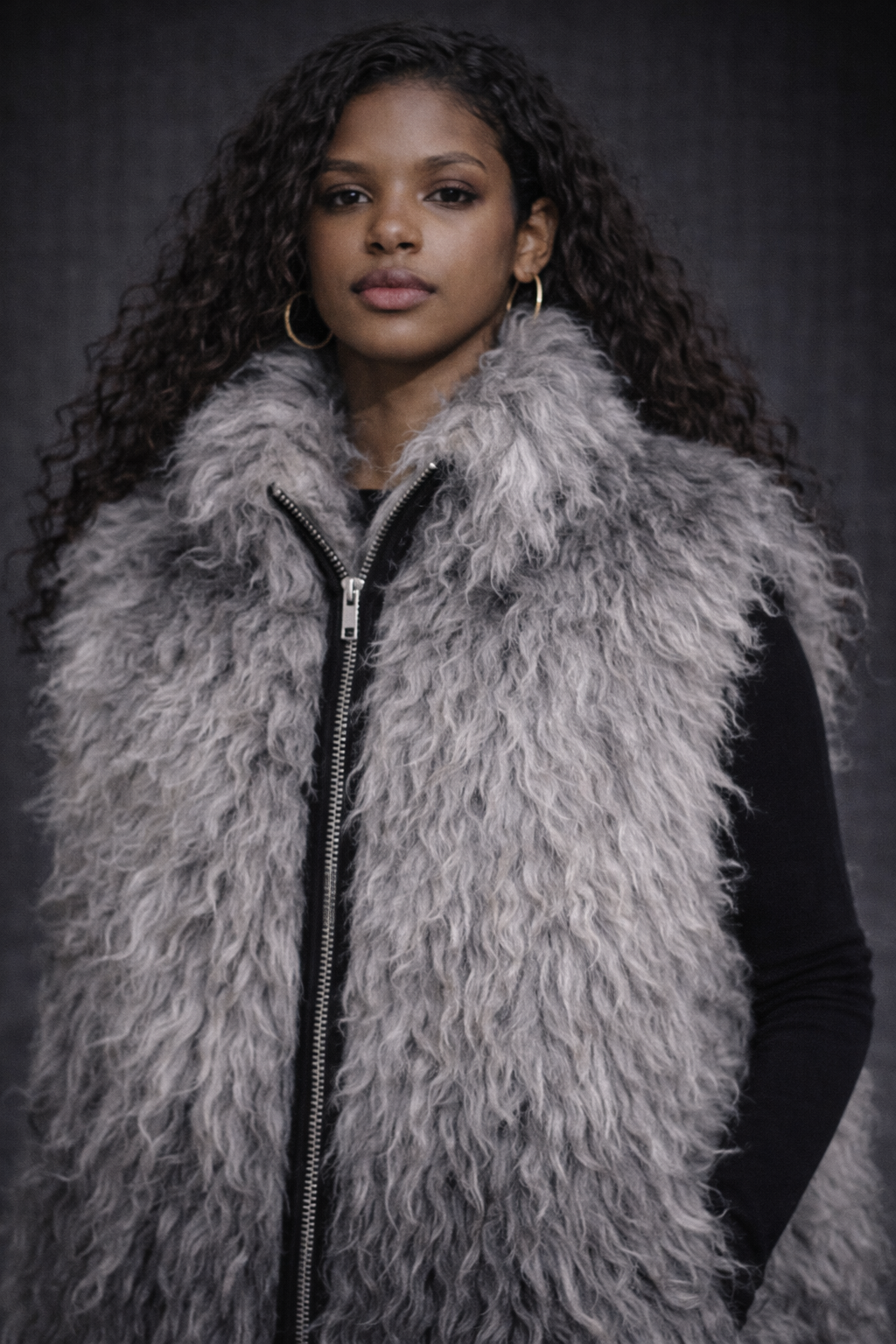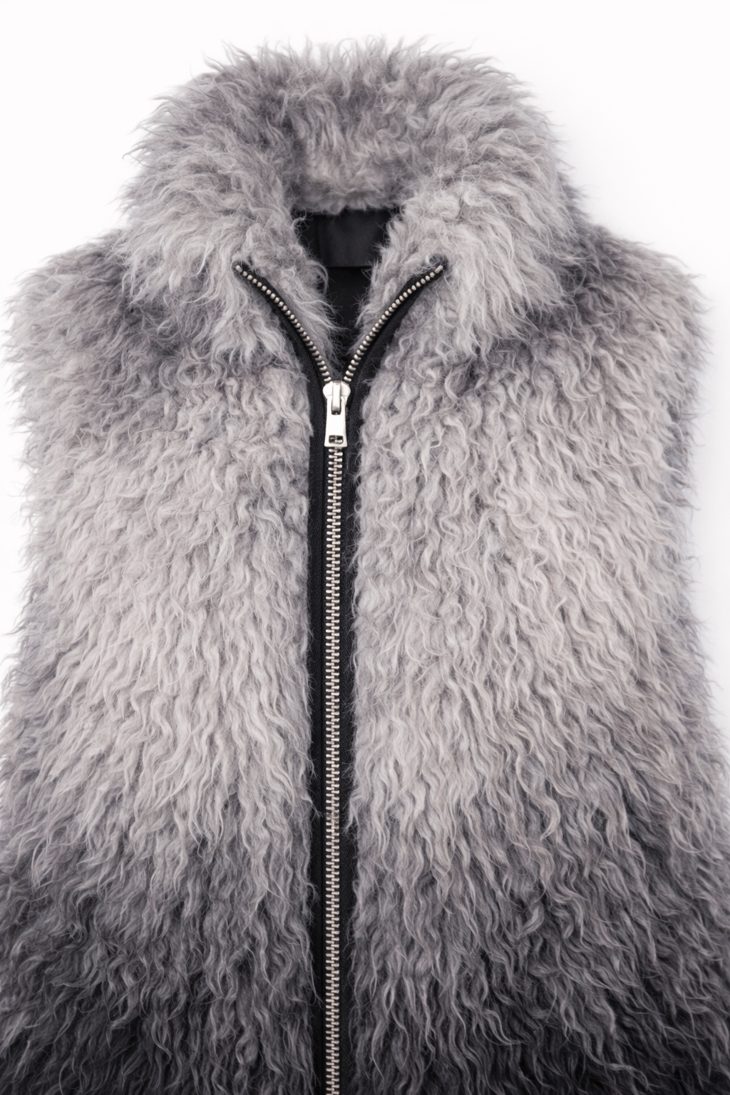 The spectrum of shadow. The P|M 'Eclipse' Ombre Fur Vest captures the transition from light to dark in a single, kinetic garment. Constructed from the house’s most voluminous high-pile eco-fur, the fiber features a dramatic, artisanal gradient that fades seamlessly from a pristine 'Silver' grey at the collar to a deep, ink-black 'Noir' at the hem. The silhouette is sleeveless and long-line, designed to add massive textural volume to the core while leaving the arms free for movement. The back reveals the garment’s signature: a structured black rectangular patch spans the shoulders, embroidered with 'PORTRAIT-MOOD' in stark white capital letters—a graphic interruption in the wild texture. Secured with a heavy silver center-front zipper, it is a piece that feels alive."