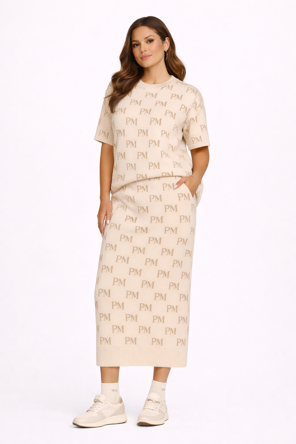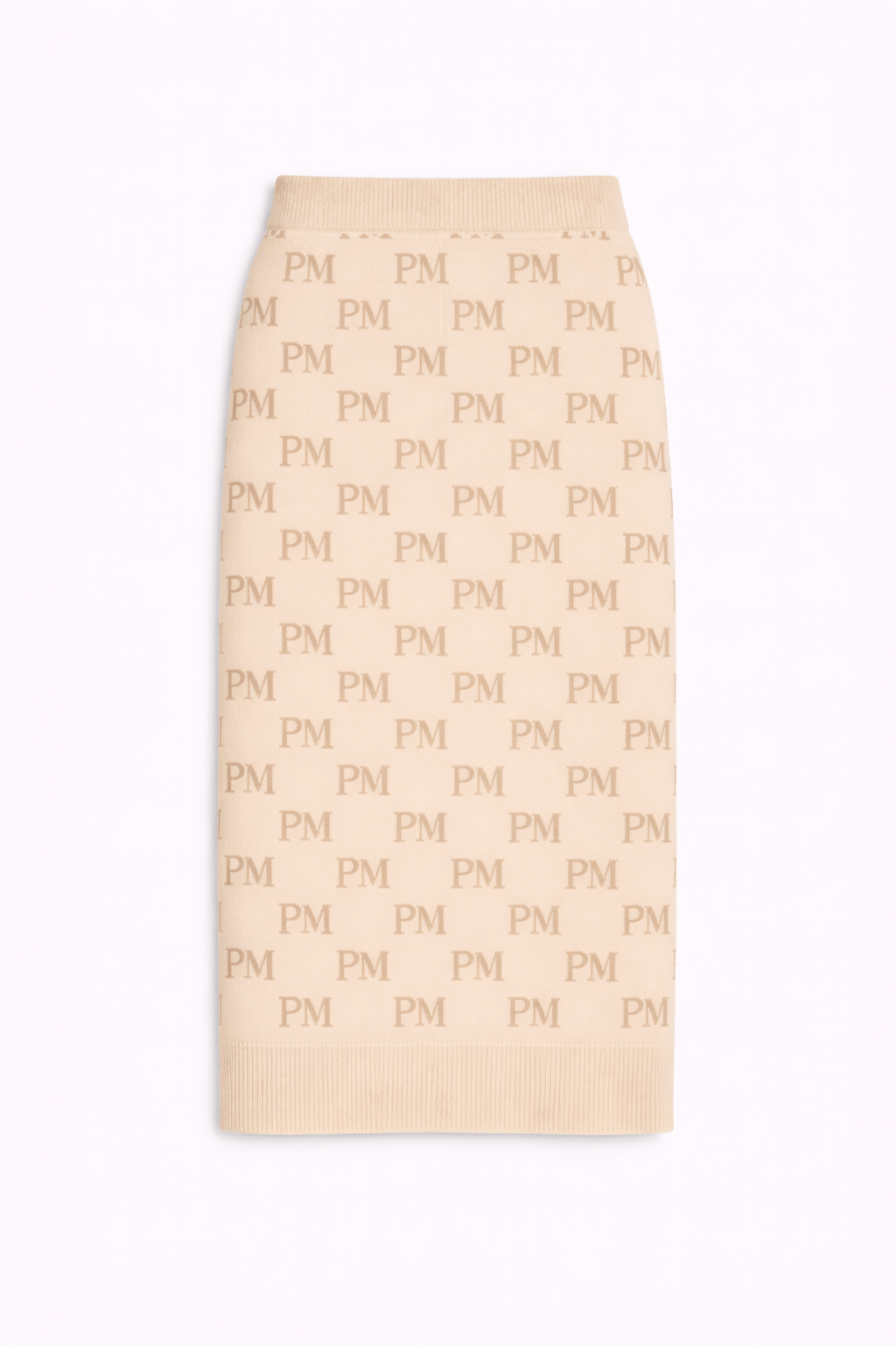 Sculptural elegance in motion. The PM Sandstone Monogram Knit Column Skirt defines the modern silhouette with architectural grace. Expertly knitted from a premium, heavyweight wool-blend in a soft sandstone cream, this piece features our signature 'PM' monogram engineered in warm taupe, creating a sophisticated, all-over visual identity. The cut is precise—a streamlined column shape that elongates the frame while offering the forgiving stretch of luxury knitwear. Finished with a comfortable, substantial ribbed waistband and a structured hem, it is the ultimate foundation for a look of effortless authority.