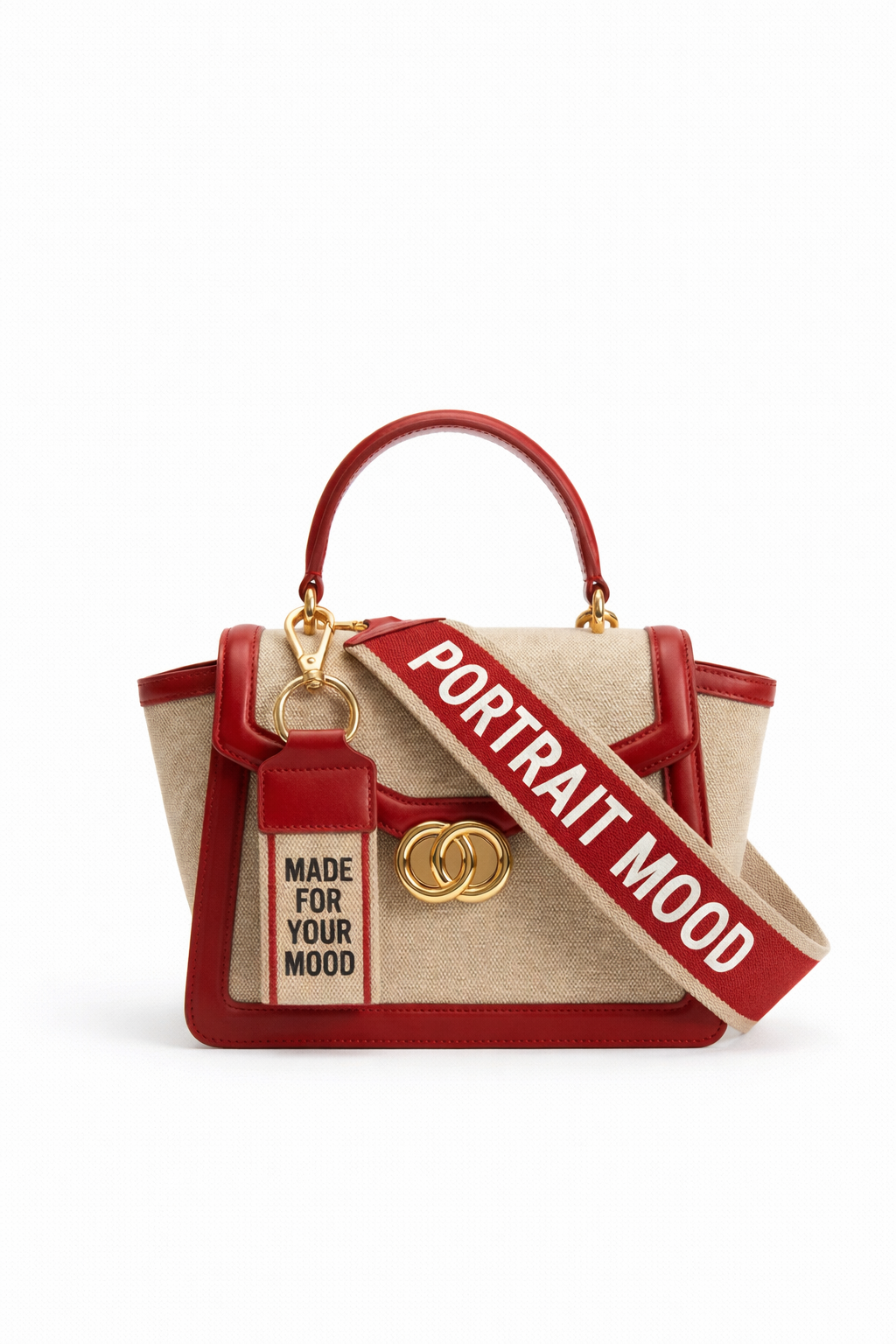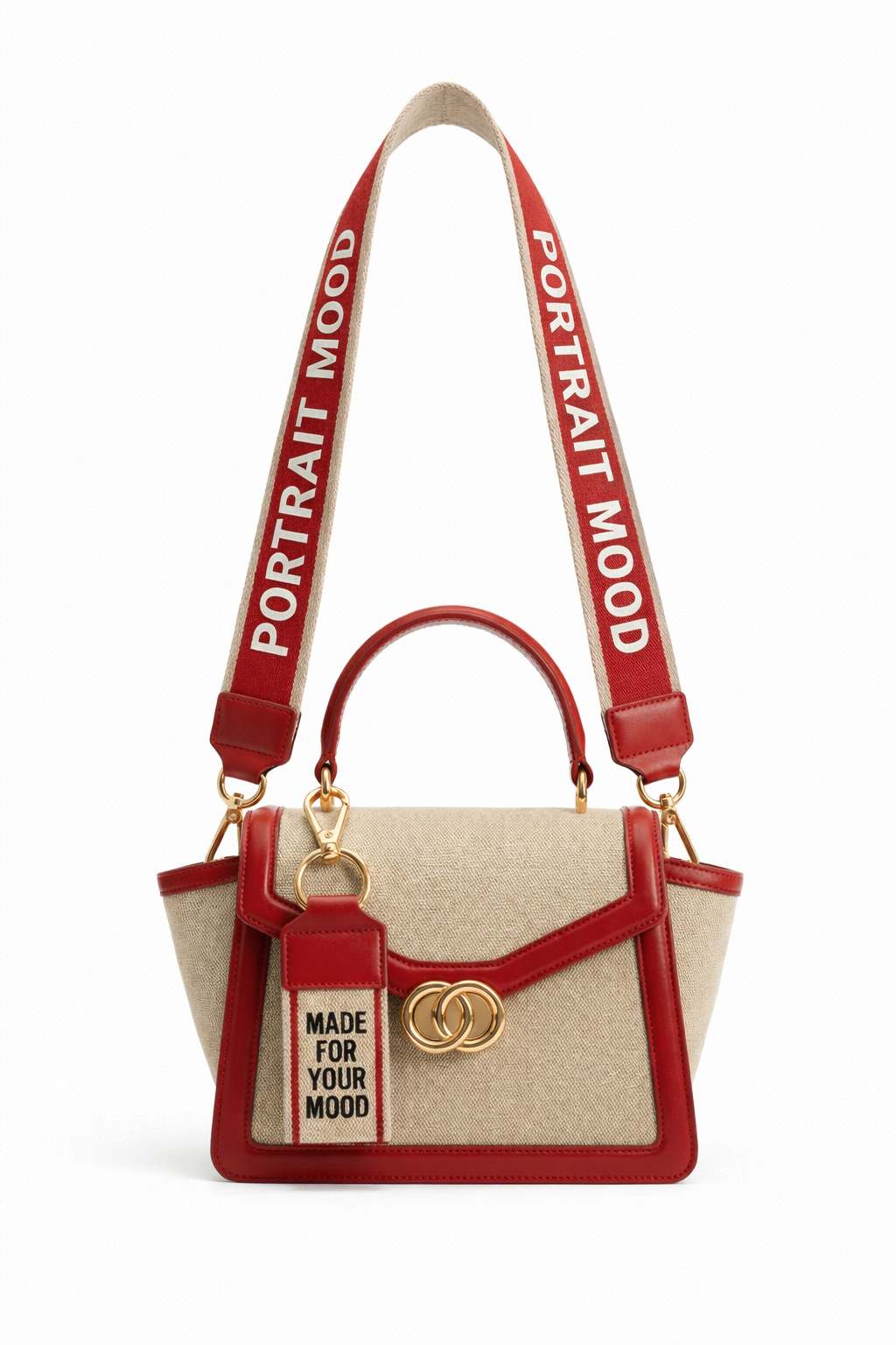 The statement piece. The P|M 'Manifesto' Winged Satchel is a declaration of intent, designed for the woman who wears her ambition on her sleeve. The body is a structured trapezoid crafted from the house’s signature textured 'Sand' canvas, rigidly framed by vibrant 'Scarlet' leather piping that outlines the flap and winged gussets. The focal point is the bold, detachable 'Mantra Tag' that hangs from the handle, vertically printed with 'MADE FOR YOUR MOOD' in block typography—a literal label for your state of mind. The wide, detachable webbing strap echoes this sentiment with 'PORTRAIT MOOD' woven in striking white-on-red typography, turning the bag into a banner of identity. Finished with a polished gold interlocking 'O' clasp and a single rolled top handle, it is a bag that speaks before you do."