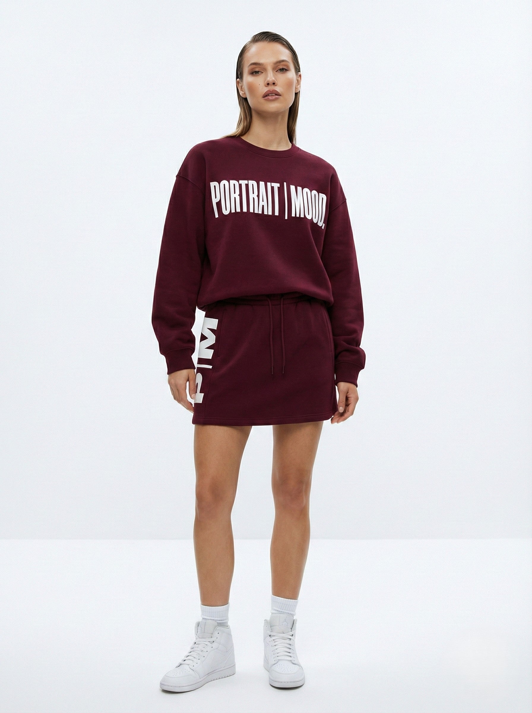 Made for the woman who owns her mood.This Burgundy Skirt Set pairs our iconic oversized sweatshirt with a bold mini-skirt... Read more