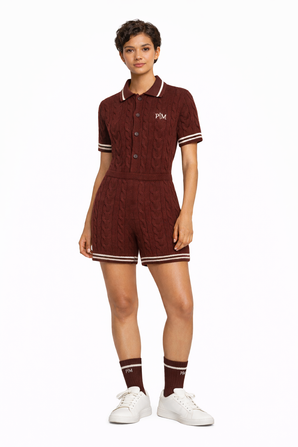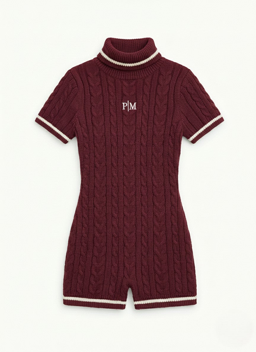 A study in rich, textural decadence. The PM Bordeaux Heritage Cable Playsuit infuses the retro-sport silhouette with a deep, intoxicating colorway. Expertly crafted from our signature heavyweight wool blend in a saturated bordeaux red, the body features a dimensional classic cable knit weave that offers both warmth and sculptural contouring. The design is sharpened by high-contrast cream tipping at the structured turtleneck, cuffs, and hem, evoking the timeless elegance of collegiate varsity wear. Anchored by the 'P|M' insignia embroidered in crisp white at the chest, it is a statement piece designed for those who command attention, on or off the slopes.