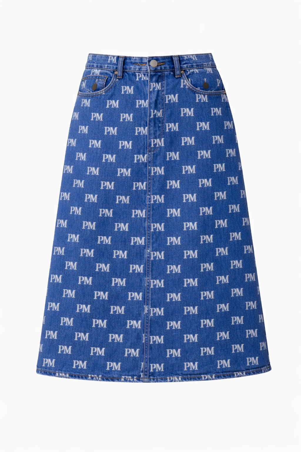 Heritage woven into a modern rhythm. The PM Signature Monogram Denim Midi translates the house's authoritative code into a silhouette of structured elegance. Expertly crafted from premium heavyweight rigid denim, the garment features a deep, authentic 'True Indigo' wash that provides a rich canvas for high-contrast identity. The design is defined by an all-over repeating 'PM' serif monogram, a relentless pattern that wraps the body in the brand's signature typography. Cut with a disciplined A-line profile that falls to a sophisticated midi length, it offers a stiff, architectural drape that holds its shape in motion. Finished with a central button placket and classic five-pocket styling, it is a statement piece that balances feminine length with the rugged durability of workwear.