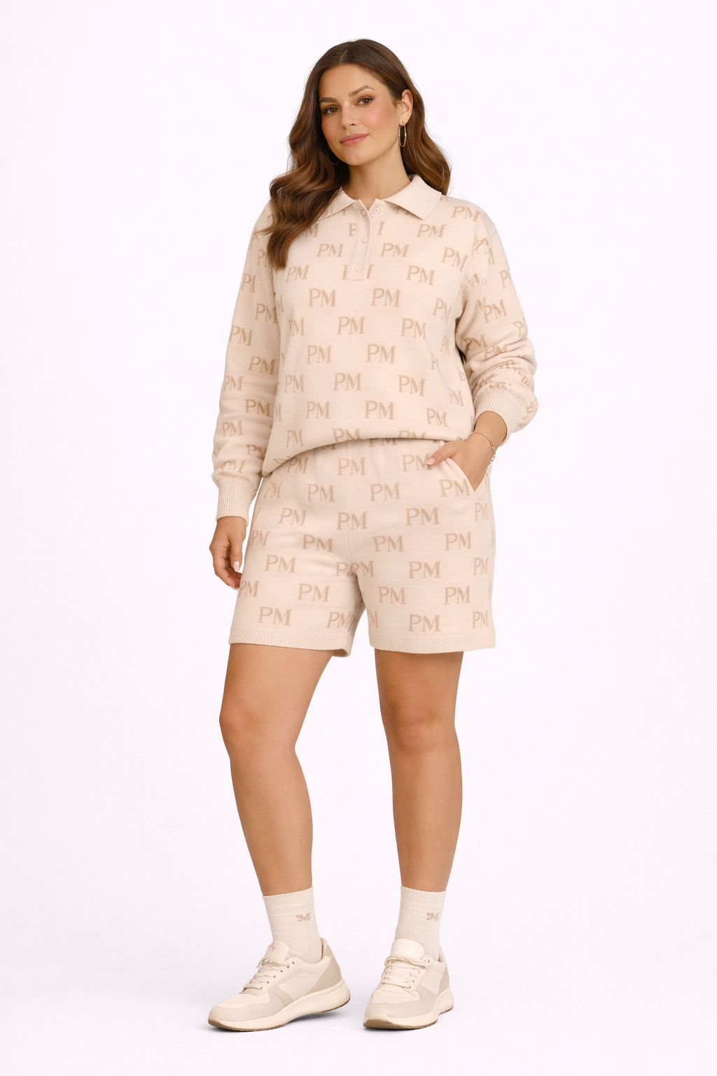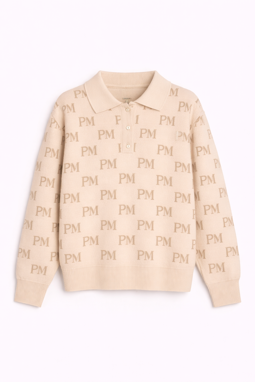 Heritage refinement, softened for the modern wardrobe. The PM Sandstone Long-Sleeve Knit Polo takes the structure of a sporting classic and reimagines it in decadent knitwear. Expertly crafted from our signature fine-gauge cotton-wool blend in a soft sandstone cream, this piece features the all-over 'PM' monogram engineered in warm taupe, creating a sophisticated visual texture. The silhouette is defined by a soft, structured collar and a classic three-button placket, flowing into relaxed long sleeves finished with substantial ribbed cuffs. It is a versatile essential that bridges the gap between weekend leisure and executive casual.