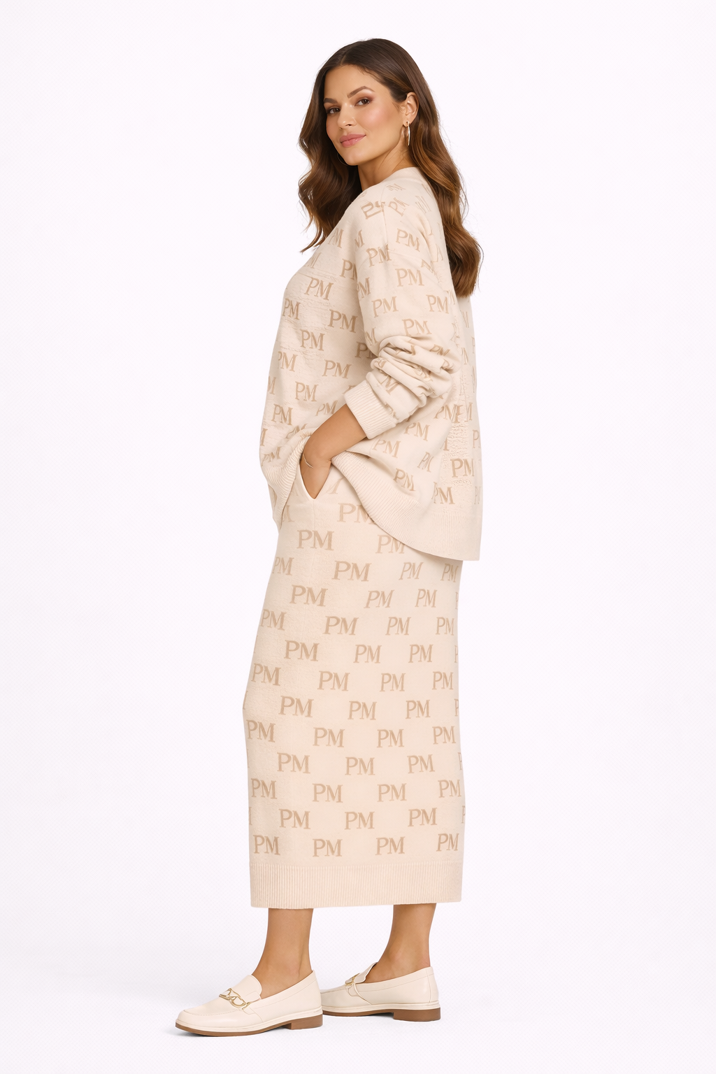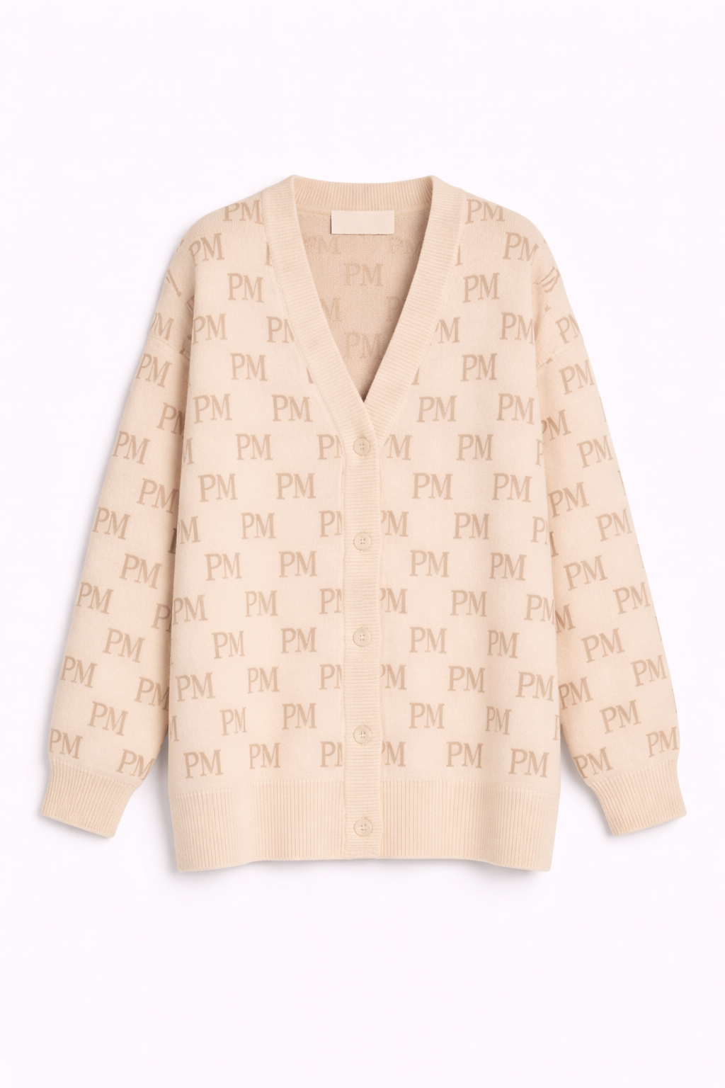 A masterclass in textural storytelling. The PM Sandstone Monogram V-Neck Cardigan transforms the traditional library staple into a piece of modern sculpture. Knitted from a decadent, heavyweight wool-blend in a soft sandstone cream, this piece features our signature 'PM' monogram engineered in warm taupe, creating a seamless, all-over visual identity. The relaxed, drop-shoulder silhouette is framed by a deep V-neckline and fastened with tonal buttons that blend perfectly into the design for a clean, uninterrupted finish. Finished with substantial ribbed cuffs and a wide hem, it offers a drape that is both nonchalant and precisely tailored.