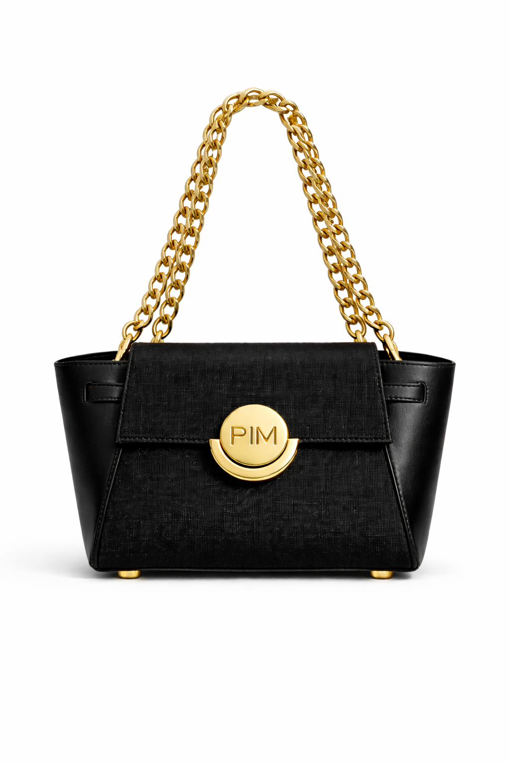 Where accessory meets jewelry. The P|M GRACE Chain Edition - Noir Mixed-Media transforms the house’s signature silhouette into an object of evening glamour. Expertly crafted from a midnight palette, the body features a dense, textured canvas core in absolute 'Noir', aggressively framed by smooth, structured leather wings that absorb the light. The defining innovation of this piece is the handle: the traditional leather arch is replaced by a substantial, jewelry-grade polished gold chain that drapes over the wrist like a bracelet. Anchored by the modern 'P|M' circular logo clasp in matching gold, it is designed to be the focal point of any room—a bag that doesn't just complete the outfit, but creates it."