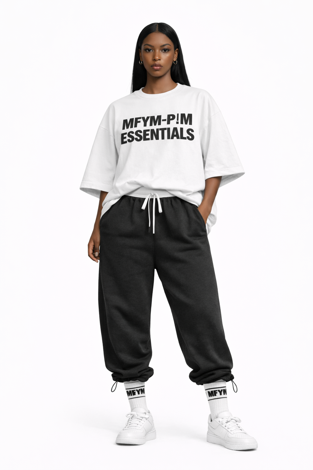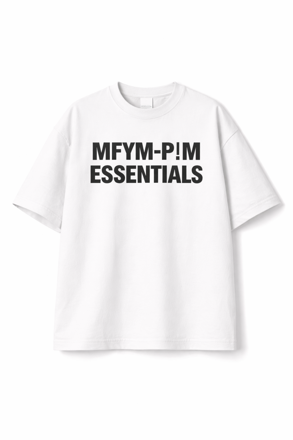 A declaration of identity in its purest form. The MFYM-P|M Graphic Tee strips back the noise to focus on the core codes of the house. Expertly cut from our signature heavyweight cotton jersey in brilliant optic white, the garment offers a structured, pristine canvas that demands attention. The chest features a stark, high-contrast typographic stack: the hybrid 'MFYM-P!M' acronym sits authoritatively above the 'ESSENTIALS' designation, executed in bold, industrial black block lettering that is impossible to ignore. With its relaxed drop-shoulder silhouette and precision ribbed crew neck, it is the ultimate clean slate for the modern wardrobe.