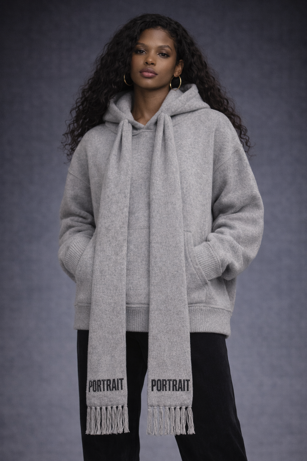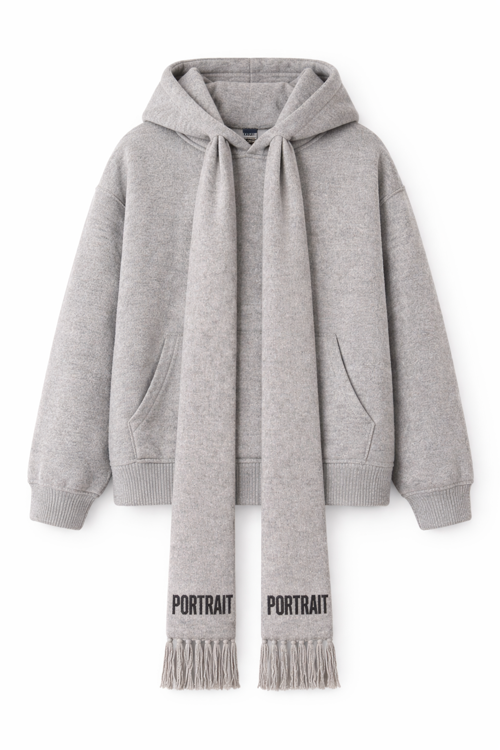The story is woven in. The P|M 'Narrative' Scarf-Integrated Wool Hoodie blurs the line between knitwear and outerwear. Crafted from a dense, felted wool-cashmere blend in a soft, heathered 'Dove Grey', this piece offers a structured warmth that stands apart from the standard cotton sweatshirt. The defining feature is the fully integrated scarf that extends seamlessly from the neckline, draping down the front like a stole. Each end of the scarf is anchored by the house name 'PORTRAIT', intarsia-knitted in bold black, and finished with thick, artisanal tassels that add movement to every step. Cut with a relaxed, boxy fit and deep kangaroo pockets, it is the ultimate travel companion for the woman who values comfort as much as composition."