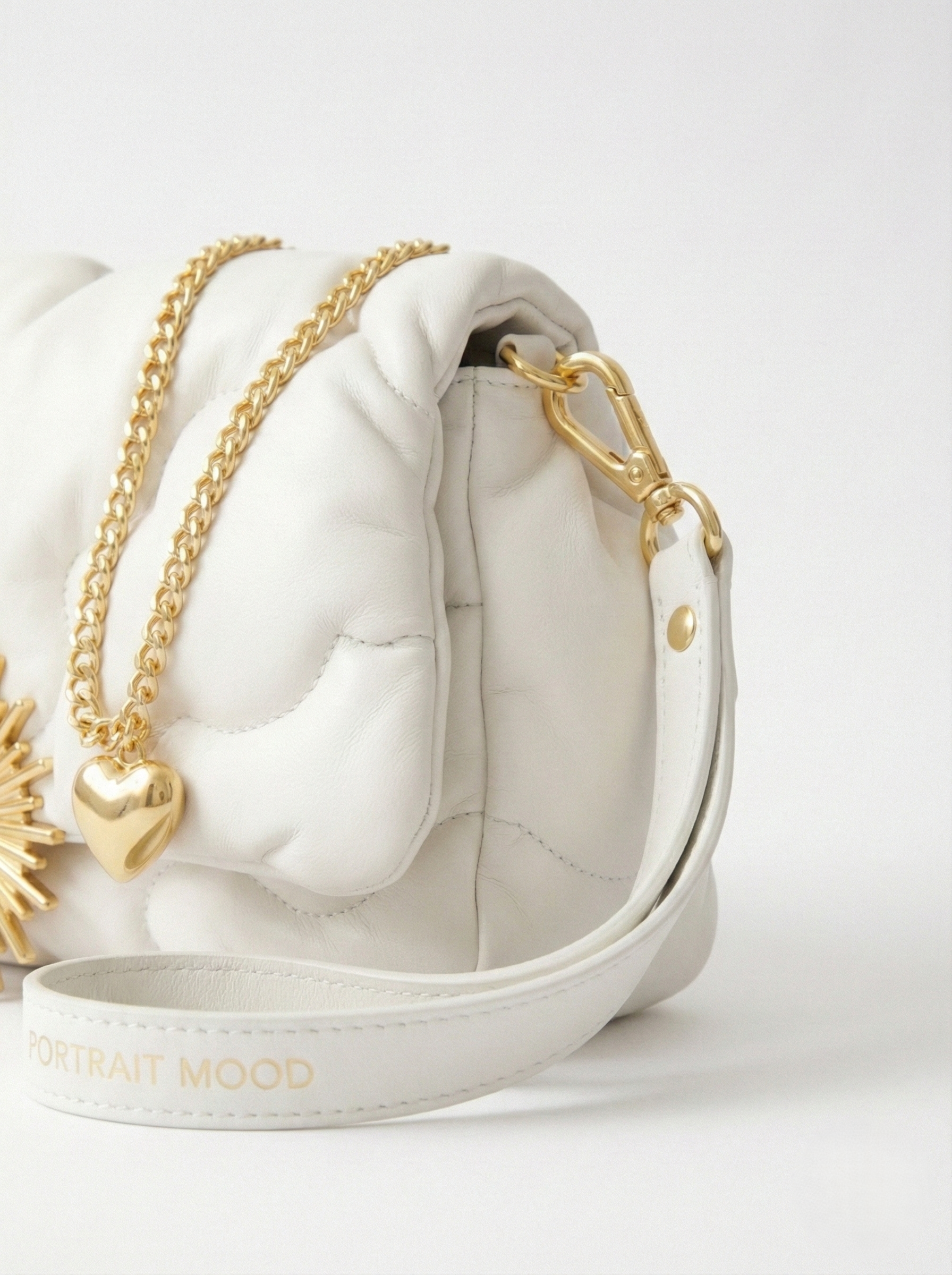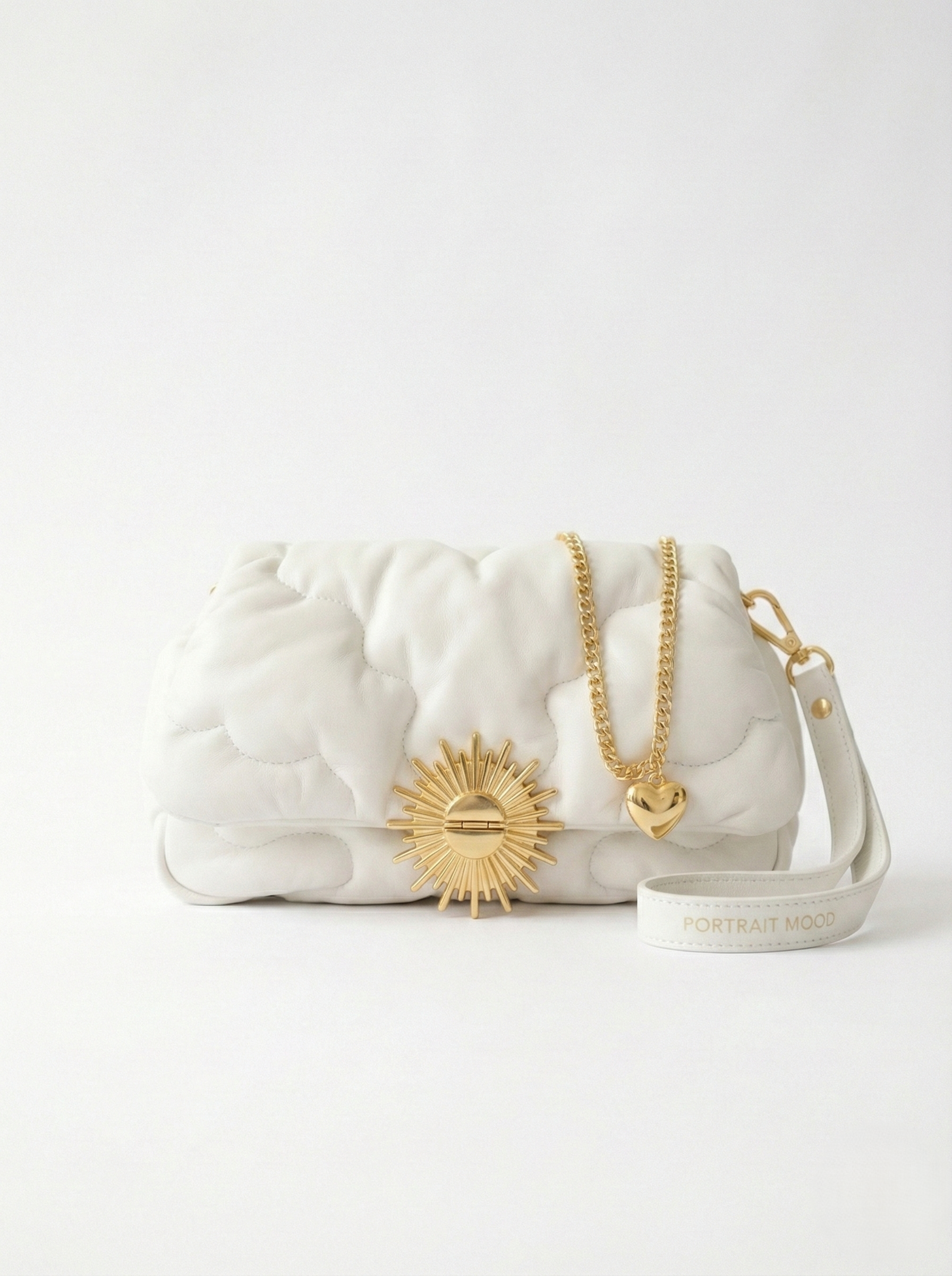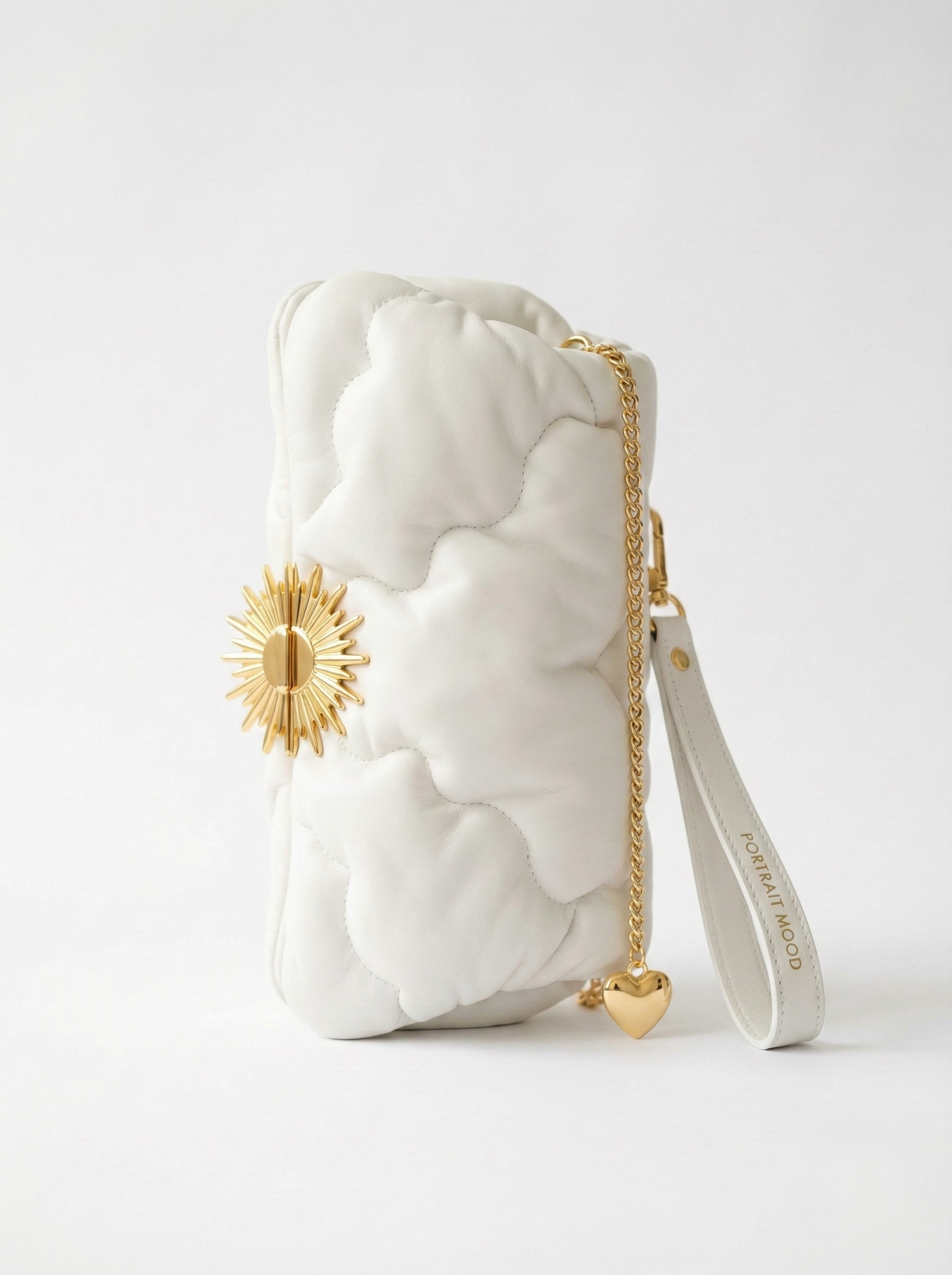 A piece of the sky you can hold. The P|M Petit Nuage (Little Cloud) is the physical manifestation of a dream that refuses to fall. Sculpted from ultra-soft Italian Nappa Lambskin in pristine Cloud White, the leather is not merely stitched; it is gathered and quilted in organic, billowing waves that mimic the formation of a cumulus cloud at 30,000 feet. The bag is sealed by the collection’s source of power: a massive 24k Gold-Plated Sunburst Clasp that radiates light from the center, locking the cloud in place. Yet, it remains grounded: a delicate gold chain suspends a solid Gold Heart Charm, a reminder of the human connection below. Carried by a wide leather wristlet embossed with PORTRAIT MOOD in gold foil, it is the ultimate accessory for the woman who carries her own atmosphere.
