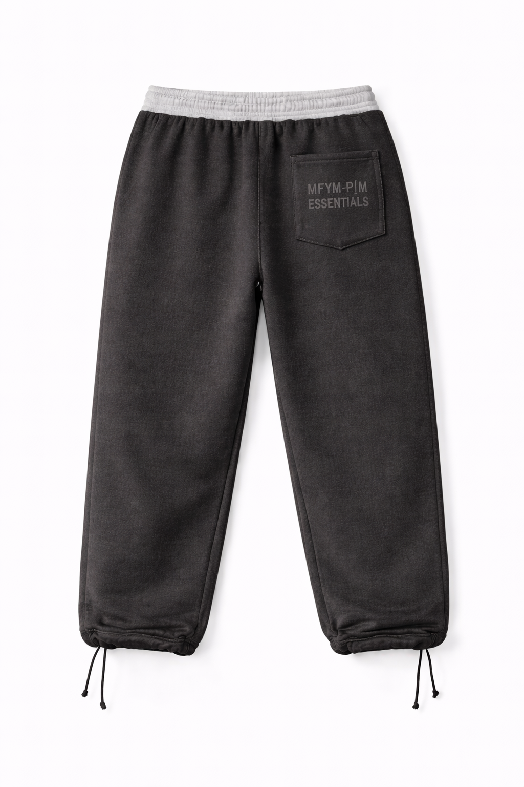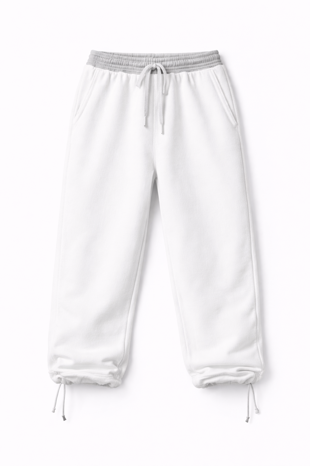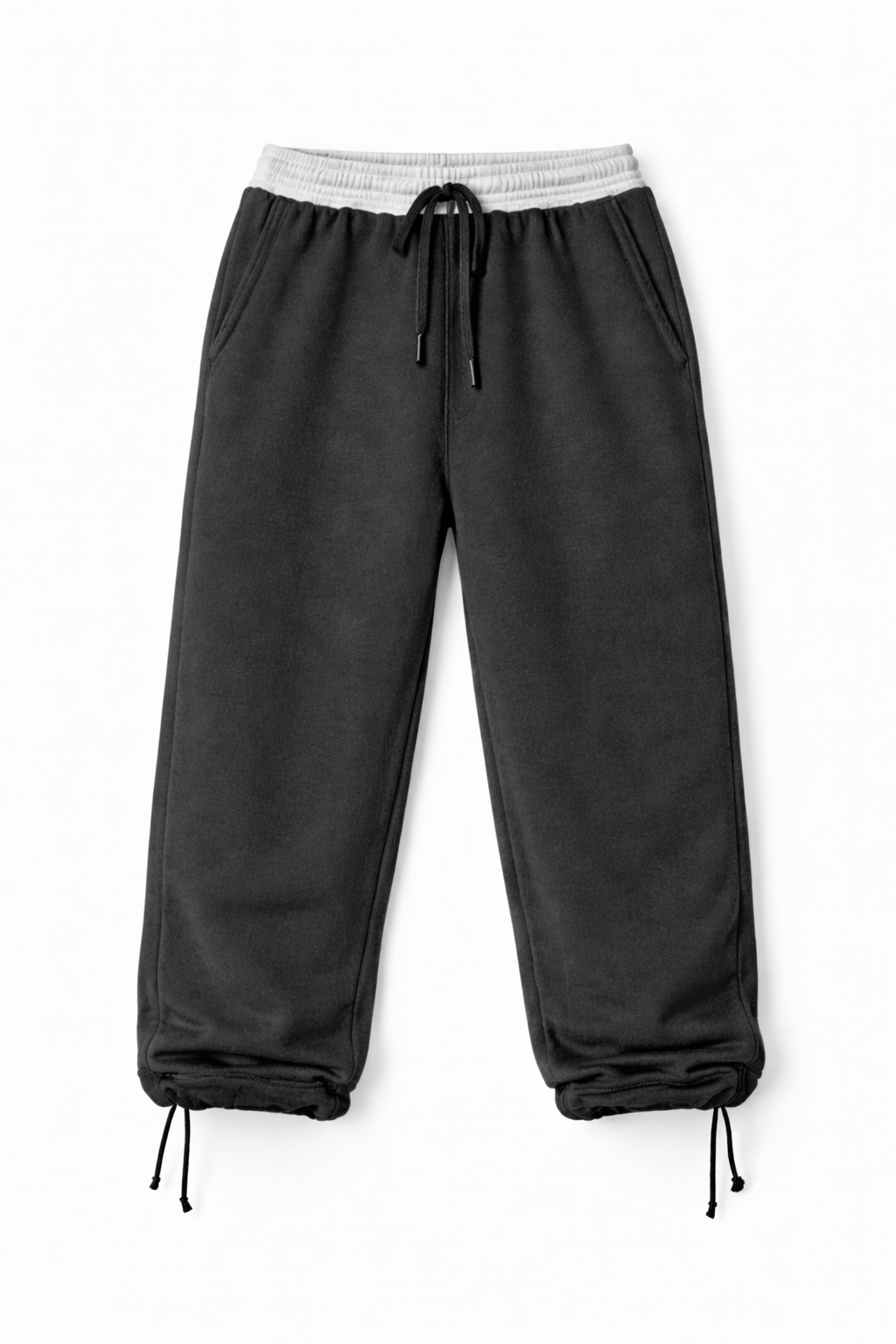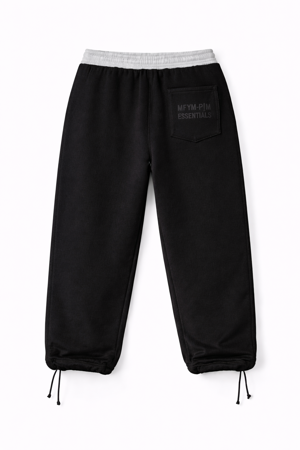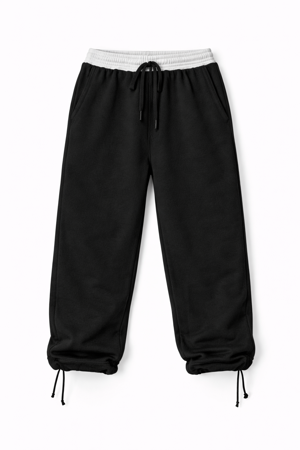 The evolution of the silhouette, engineered for adaptability. The PM Noir Contrast Toggle Pant merges the comfort of our heavyweight fleece with technical architectural details. Expertly cut from our signature cotton in deep noir, the design is defined by a bold, contrasting white elasticated waistband that creates a sharp graphic horizon against the dark body. Distinct from our standard joggers, the ankles feature an integrated bungee-cord toggle system, allowing the wearer to instantly transform the profile from a relaxed open hem to a tightly cinched, voluminous stack. Finished with black drawstrings and matte hardware, it is a garment that offers a fully customized fit for the modern environment.