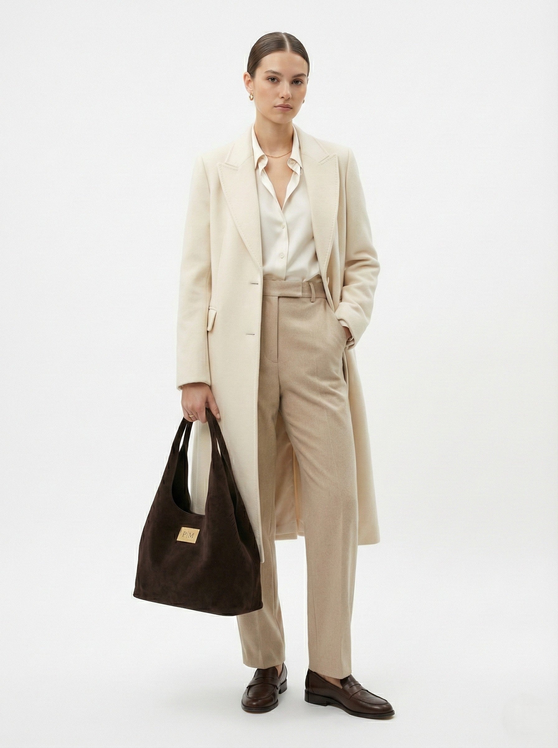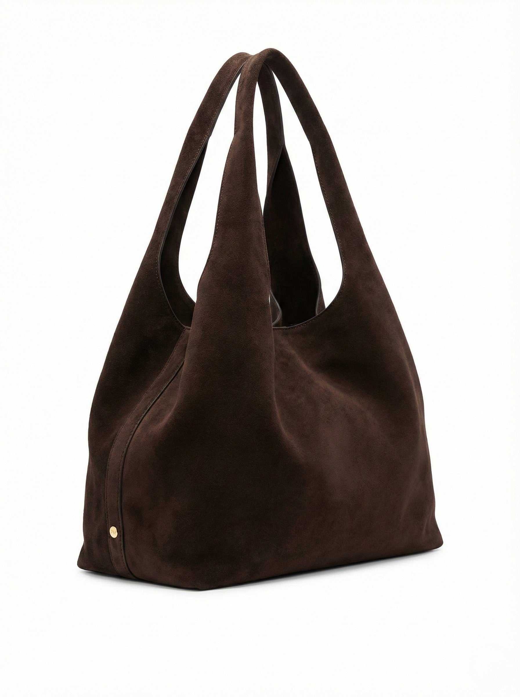 A masterpiece of soft structure. The PM Espresso Suede Hobo redefines the daily carry with a touch of decadent texture. Crafted from premium, velvety suede in a deep espresso hue, this bag offers a slouchy yet sophisticated silhouette that molds naturally to the body. The minimalist design is anchored by a substantial, brushed gold-tone 'P|M' logo plate, creating a warm, metallic contrast against the matte leather surface. With a seamless integrated shoulder strap and a spacious interior, it is the ultimate expression of understated, tactile luxury.