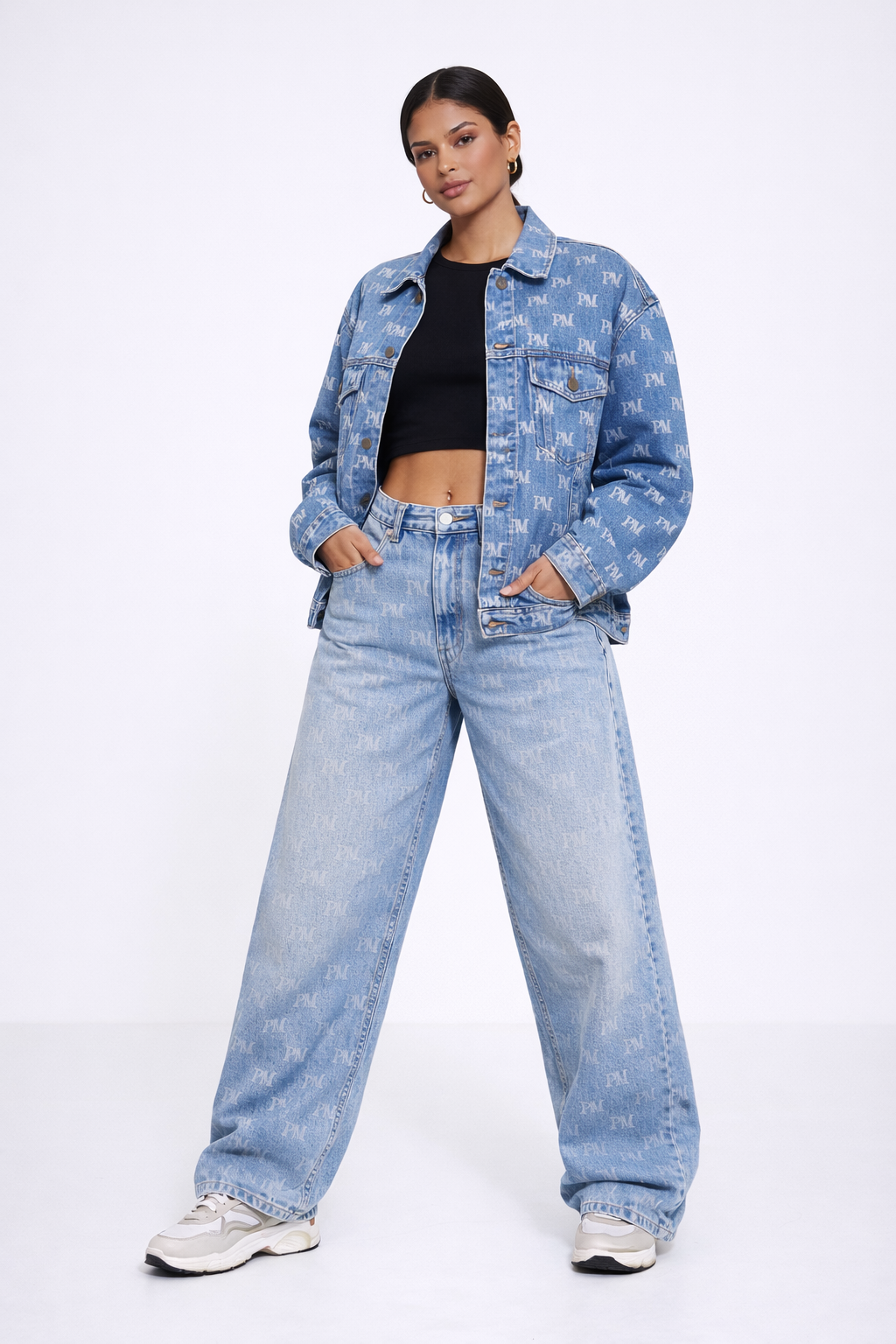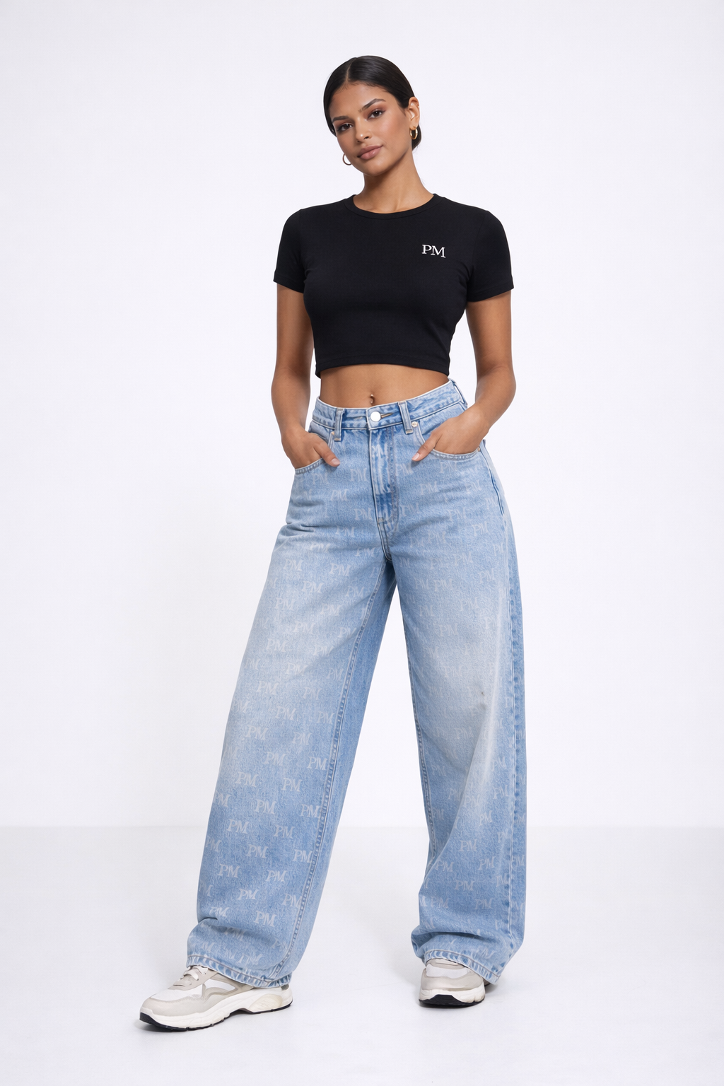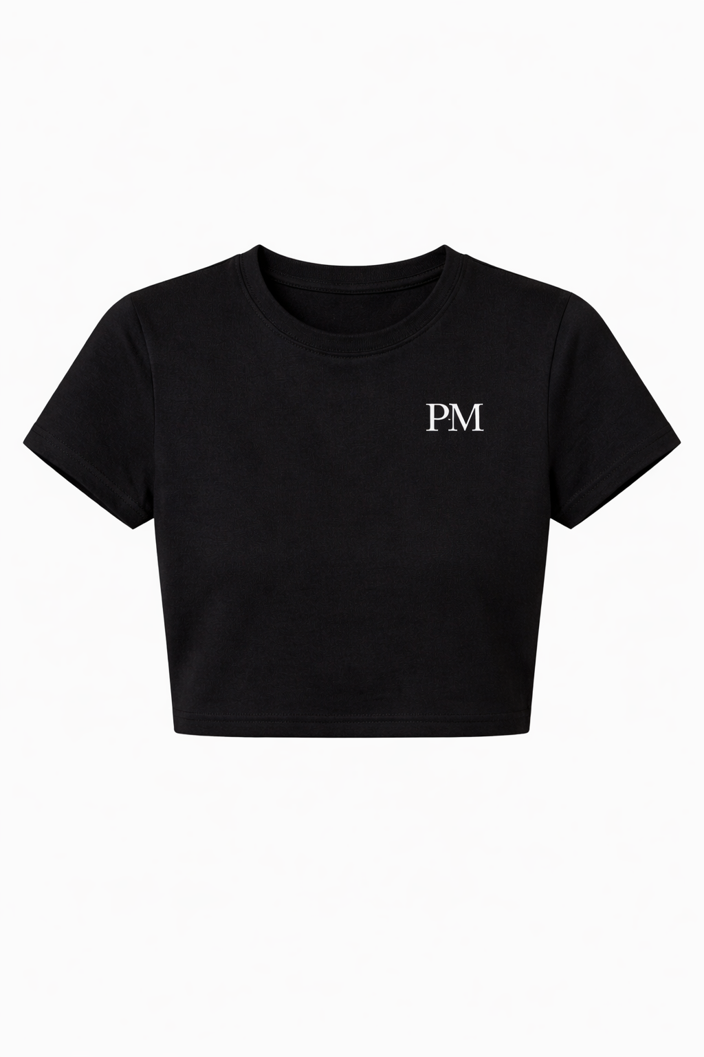 The art of restraint. The PM Minimalist Identity Crop proves that the loudest statement is often the quietest. Expertly crafted from our signature premium cotton jersey in deep, liquid noir, the garment offers a smooth, cool-touch finish that feels like a second skin. The silhouette is engineered with a precise cropped hemline designed to hit exactly at the narrowest part of the waist, creating a flattering, architectural break between top and bottom. The design is stripped of excess, focusing entirely on the classic 'PM' serif monogram printed in stark white on the left chest—a subtle yet undeniable seal of membership to the house. Finished with a structured crew neck and fitted sleeves, it is the ultimate foundational layer for the modern uniform.