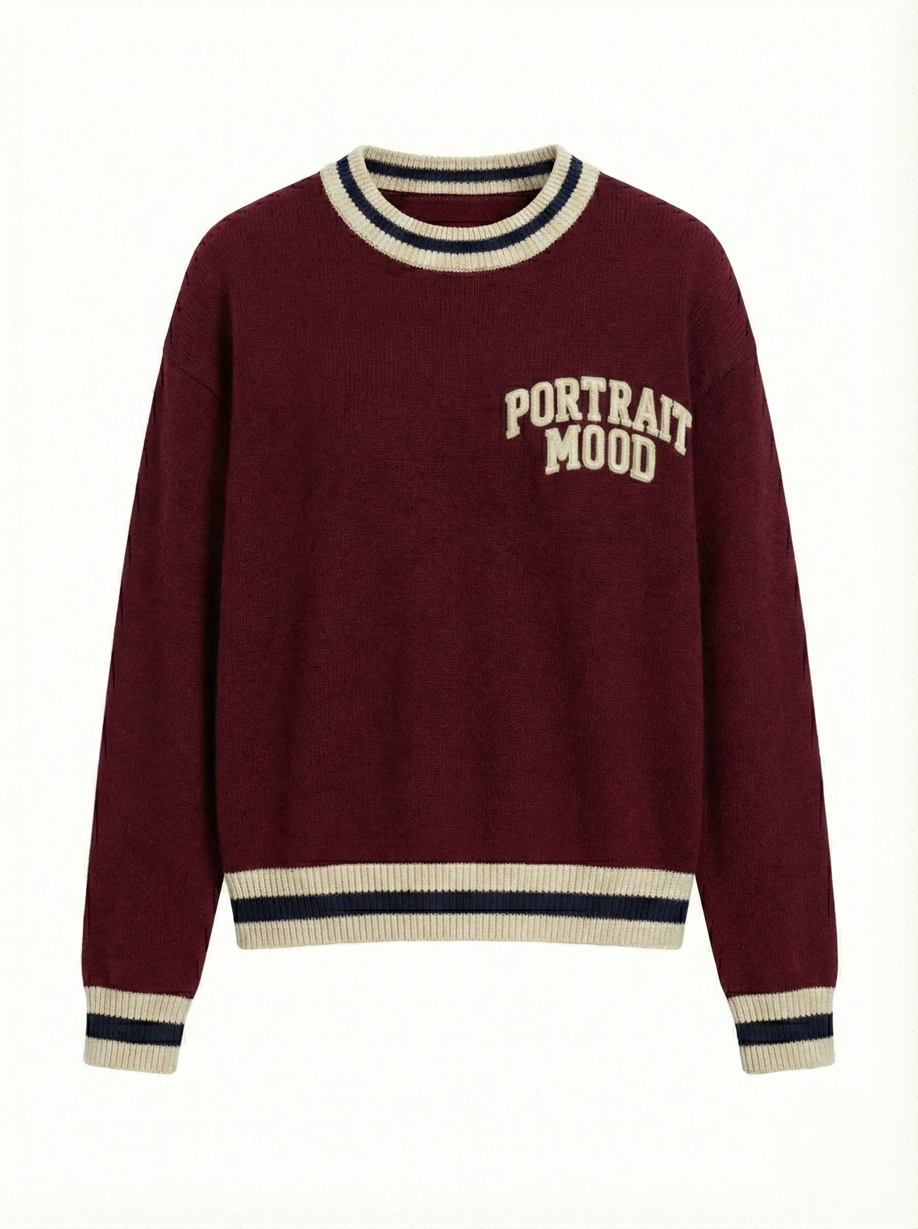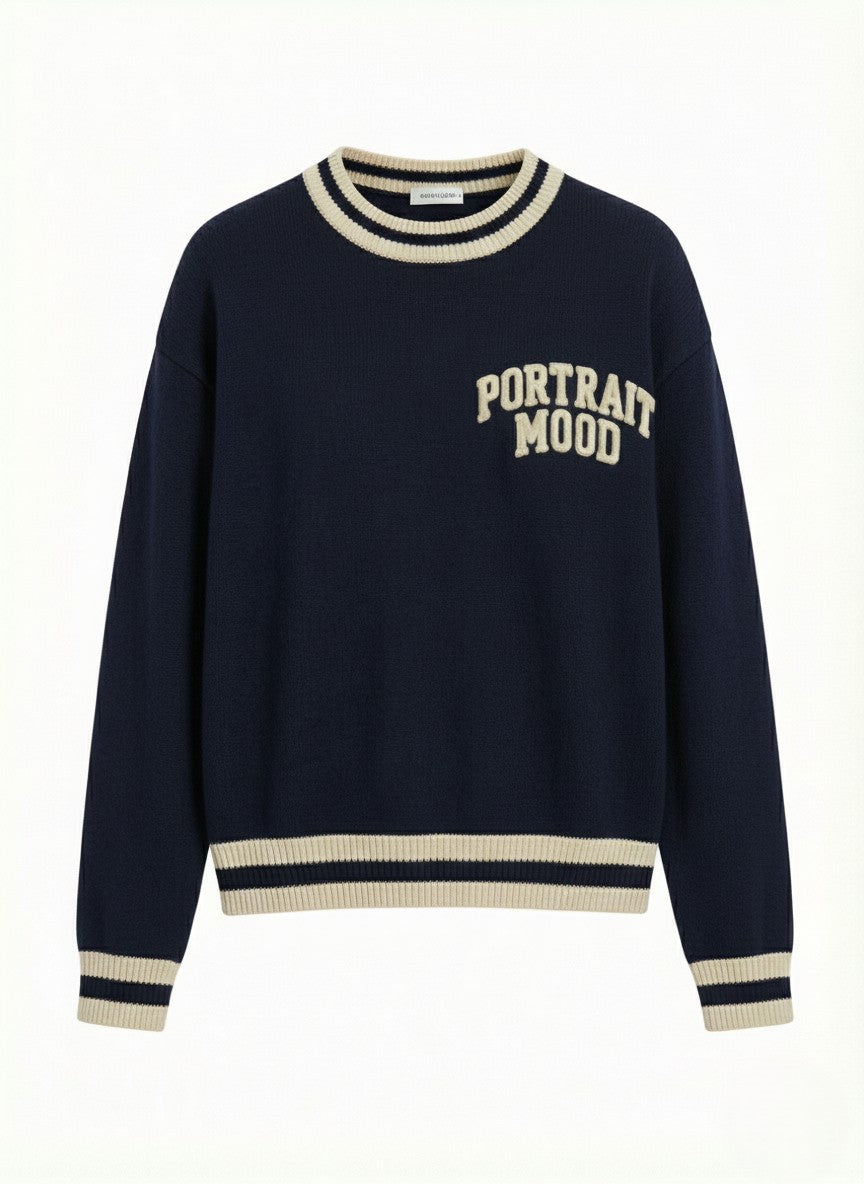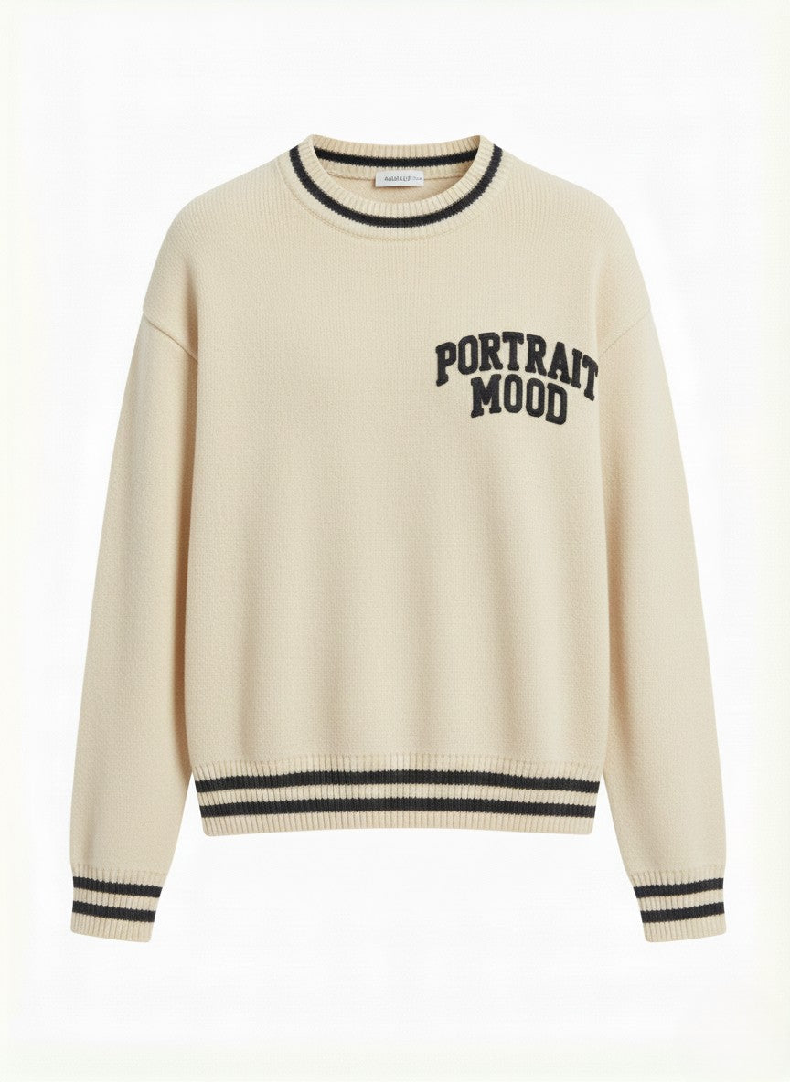 The uniform of the modern intellectual. The Portrait Mood Varsity Crew channels the nostalgia of Ivy League athletics through the lens of contemporary luxury. Crafted from a substantial, heavyweight wool blend in a rich cream, this piece features the 'PORTRAIT MOOD' slogan engineered in bold, collegiate typography across the chest. The silhouette is relaxed and enveloping, featuring dropped shoulders and framed by sharp, high-contrast navy striping at the ribbed crew neck, cuffs, and hem that adds a graphic, architectural finish. It is a garment that speaks volumes—timeless, spirited, and undeniably premium.