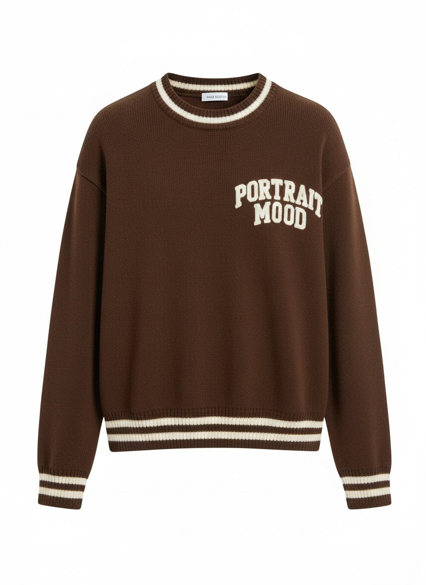 • Design: Prominent "PORTRAIT MOOD" varsity-style intarsia lettering.