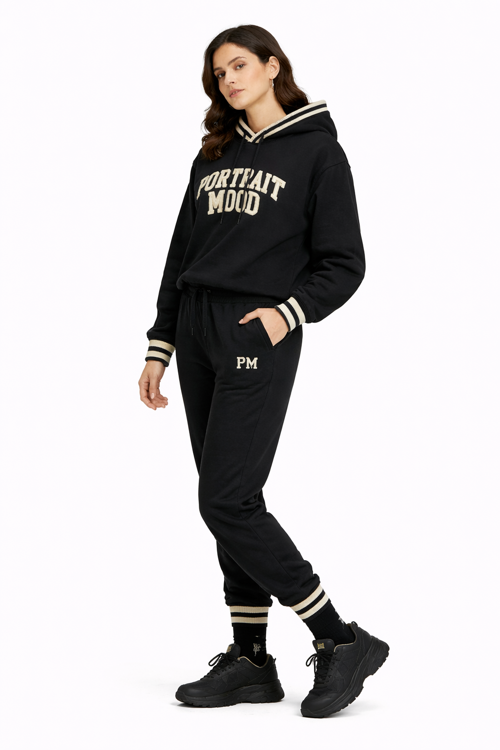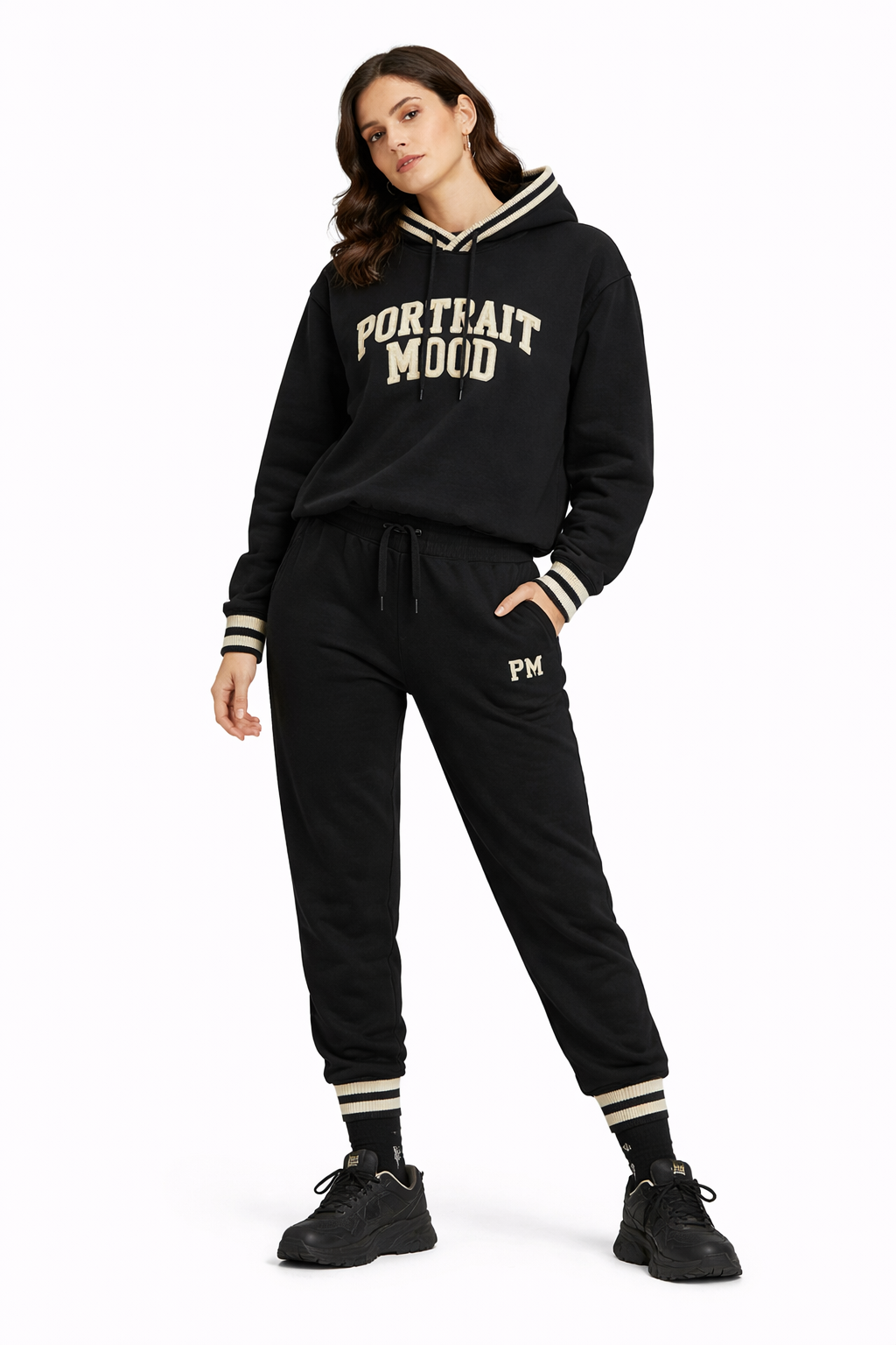 Branding: Prominent "PORTRAIT MOOD" varsity appliqué lettering in Cream.