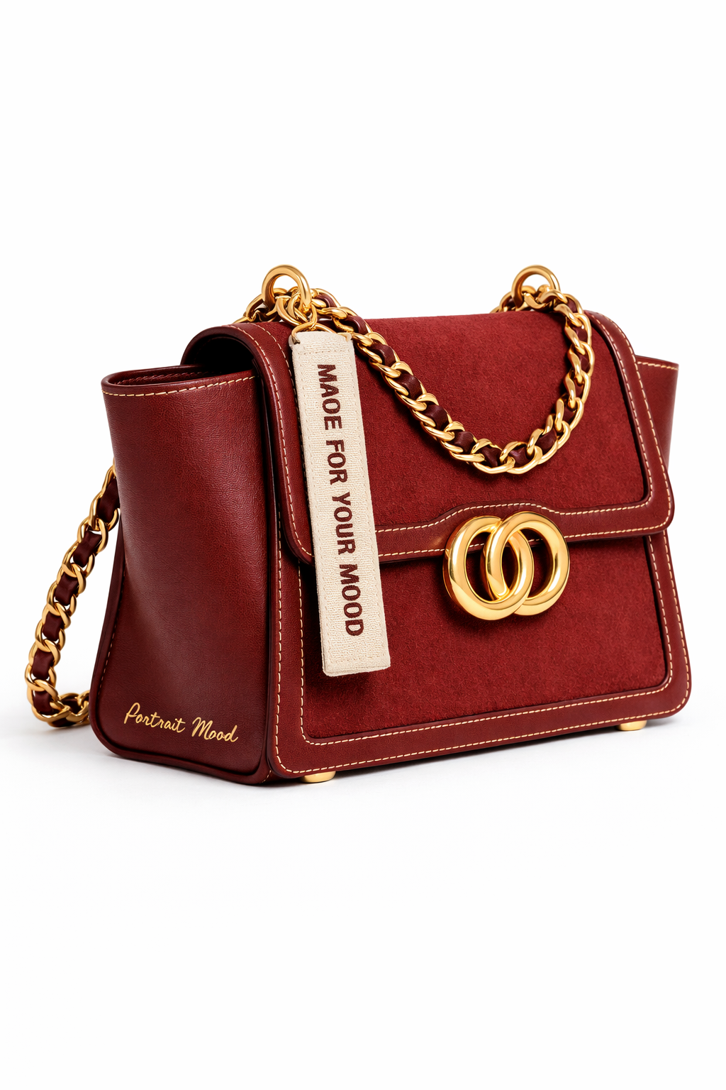 The luxury of touch. The P|M GRACE Chain Shoulder Bag - Vintage Mahogany Suede elevates the collection into a realm of rich, sensory experience. Expertly crafted from a mixed-media palette, the body features a sumptuous, velvet-finish suede core in deep 'Vintage Mahogany', framed by structured, smooth leather borders with artisanal contrast stitching. This iteration trades the standard clasp for the house’s jewelry evolution: a set of polished interlocking gold rings, symbolizing infinite connection, which gleam against the matte red background. The bag is suspended from heavy, jewelry-grade gold chain straps that drape elegantly over the shoulder, finished with a raw canvas tag printed with the manifesto 'MADE FOR YOUR MOOD'—a gritty, modern counterpoint to the bag’s opulence. It is a piece that feels as expensive as it looks.