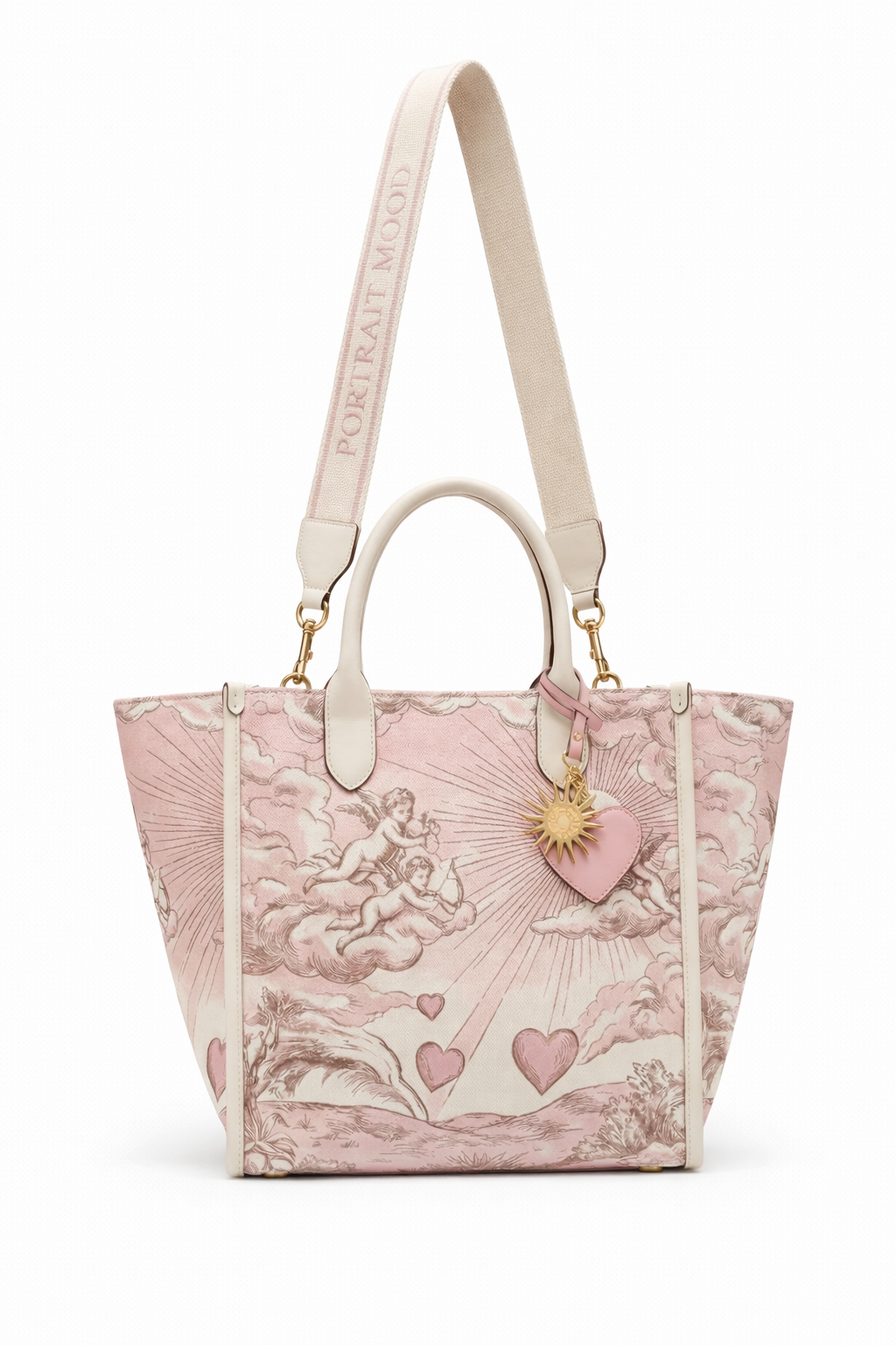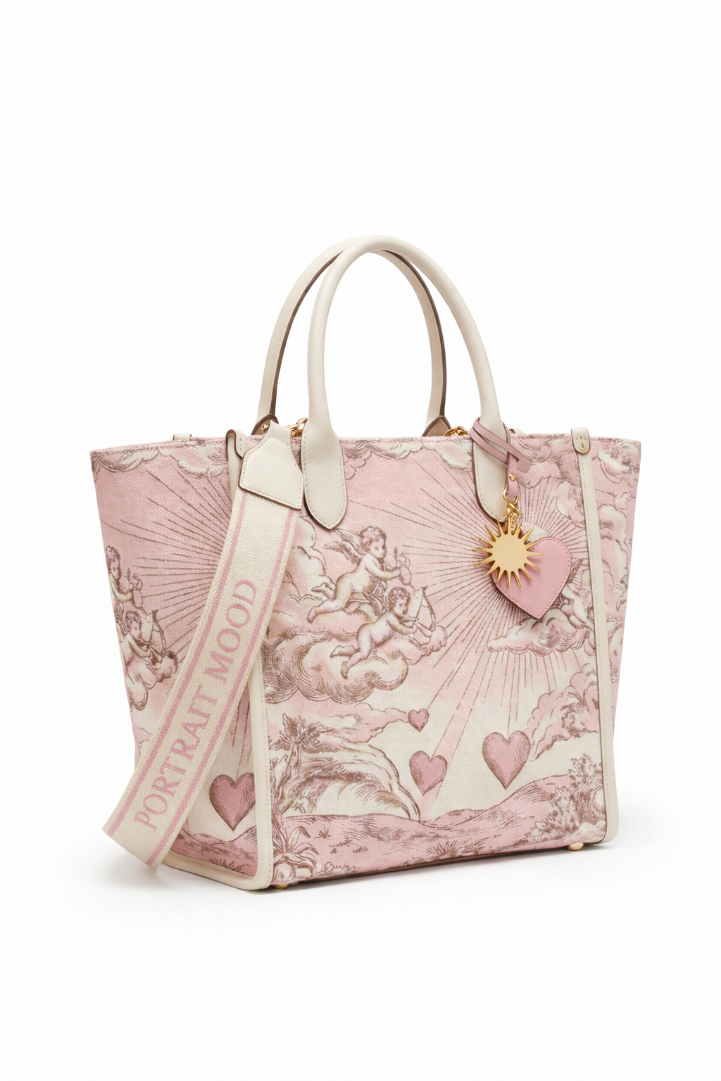 The architecture of romance. The P|M Amour Grand Shopper reimagines the ether as a space of classical love. The expansive, trapezoidal body is crafted from the house’s Rose Pink Canvas, serving as the backdrop for the exclusive 'Amour Toile': a Renaissance-inspired scene where cherubs float among 'Nuages' (clouds), aiming arrows of light through radiant sunbursts and falling hearts. The structure is framed by smooth Cloud White Premium Calfskin, which defines the rolled top handles and the rigid piping, ensuring the bag retains its statuesque form. The narrative is sealed by the hardware: a 24k Gold-Plated Sunburst and a Pink Leather Heart charm dangle from the handle, capturing the warmth of a first love. Worn with the wide, adjustable strap embroidered with 'PORTRAIT MOOD' in matching rose thread, it is a declaration of affection carried on the shoulder.