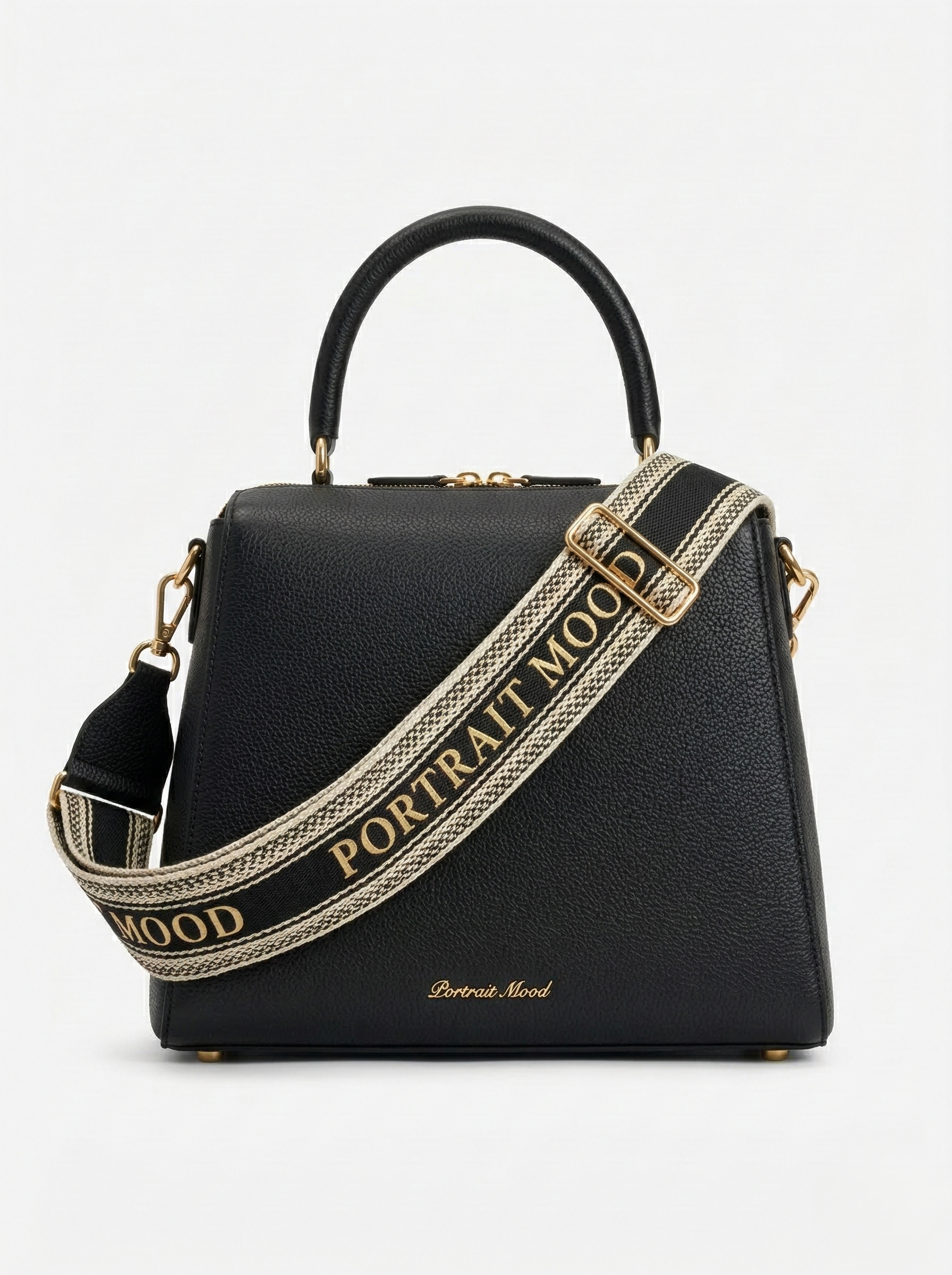 A study in flawless geometry and absolute purity. The P M Ascendant Top Handle Satchel in Obsidian is designed for the woman whose presence requires no introduction. The rigid trapezoidal silhouette is meticulously crafted from highly durable textured black pebbled calfskin offering a strikingly clean and deeply tactile canvas. The front face remains elegantly unadorned save for the classic Portrait Mood signature applied in delicate gold metal lettering at the base. The carriage effortlessly bridges the gap between heritage elegance and modern attitude. It features a stout rolled leather top handle for poised formal carry alongside a striking wide webbing strap designed for bold crossbody wear. This heavy duty strap serves as a wearable manifesto bearing the brand name PORTRAIT MOOD in prominent gold typography framed by a geometric woven border. Secured by a smooth double zip top closure and protected by gleaming gold base feet it is an uncompromising symbol of modern authority.