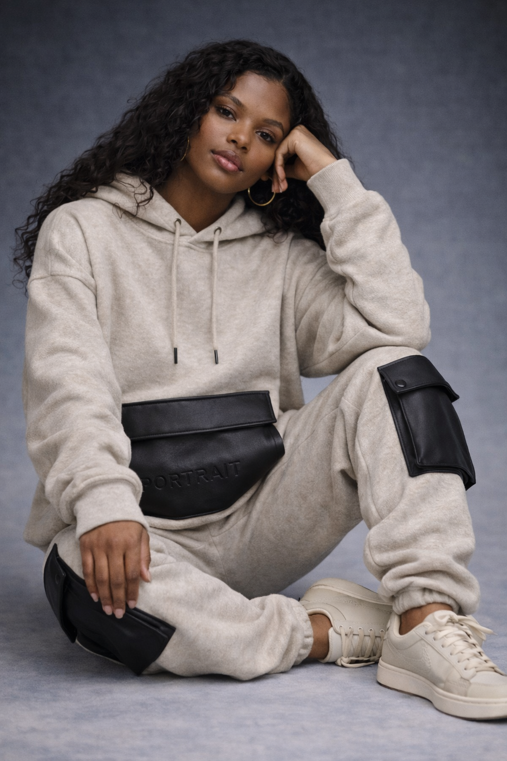 Utility, refined. The P|M 'Atelier' Leather-Pocket Jogger - Oatmeal Edition is a study in material contrast, designed for the modern pragmatist. Cut from heavyweight, loopback French terry in a soft, heathered 'Oatmeal' beige, the base garment offers supreme comfort and a relaxed, effortless drape. The design is interrupted by two large, structured cargo pockets crafted from smooth 'Noir' vegan leather, placed symmetrically on the thighs. These architectural additions transform a simple lounge piece into a functional statement, offering secure storage with snap-button flap closures. Finished with a gathered elastic waistband and cuffs, it is the perfect fusion of soft luxury and hard utility."