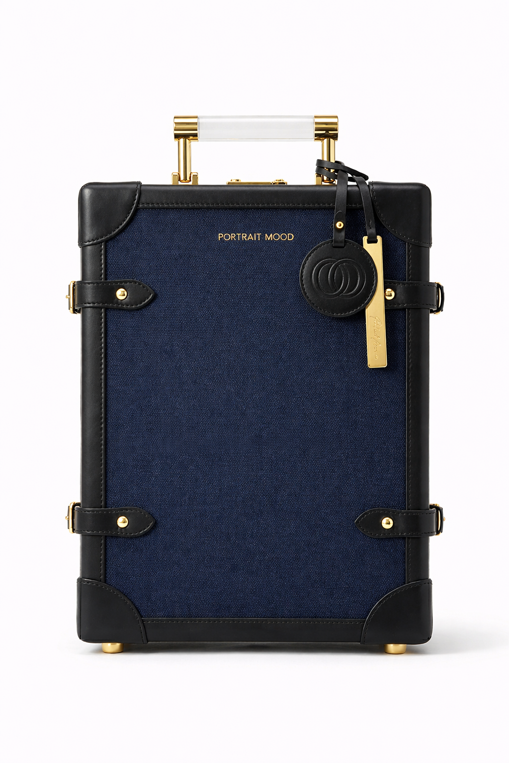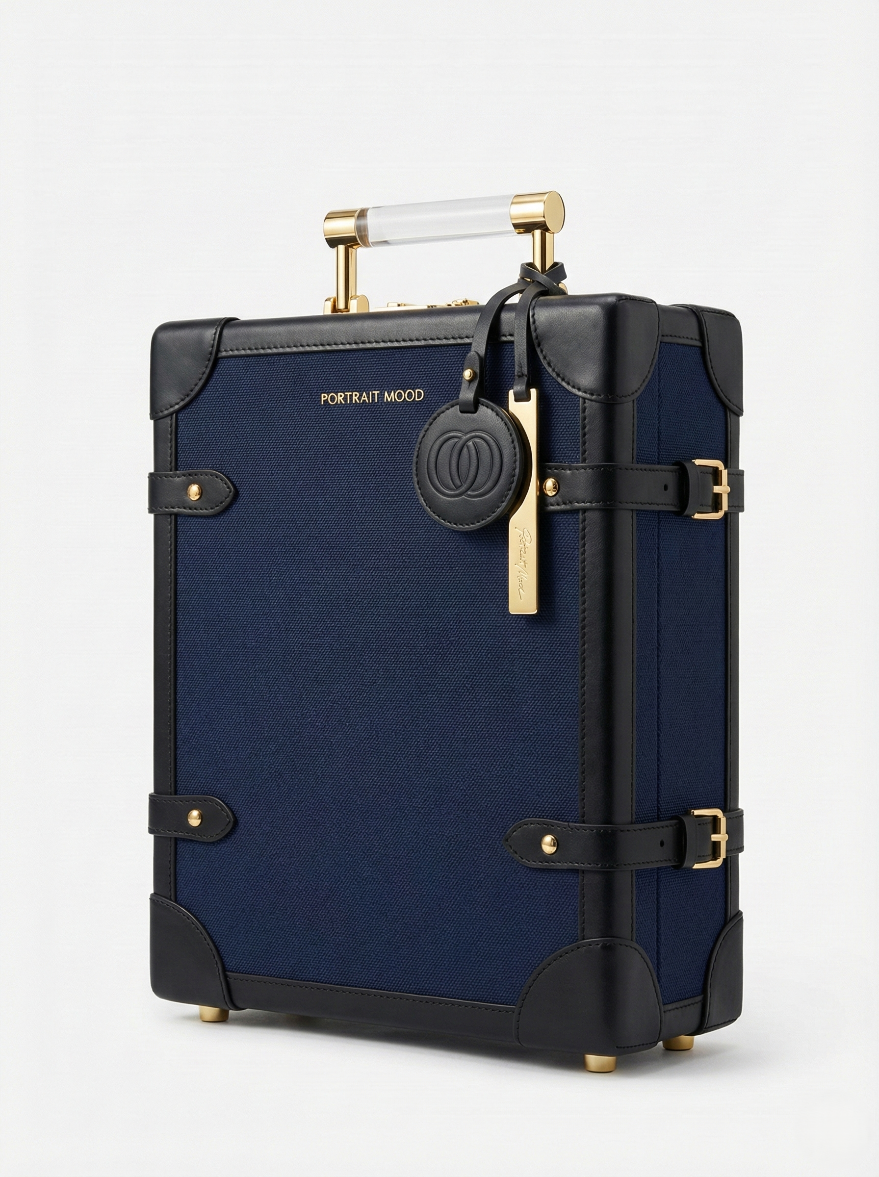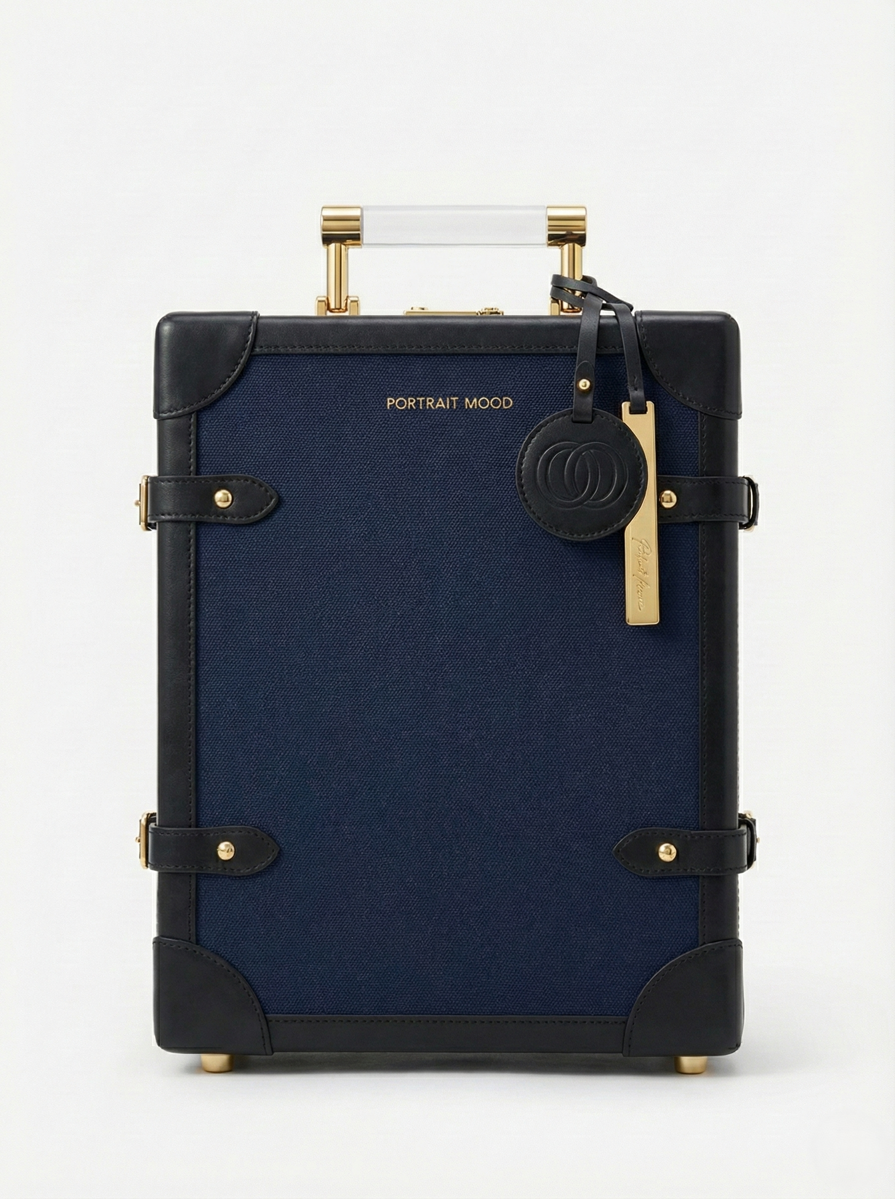 The portable vault. The P|M 'Diplomat' Canvas Vanity Trunk is a fusion of heritage craftsmanship and modern transparency. The vertical body is constructed from the house’s heavy-gauge, water-resistant canvas in a deep 'Midnight Navy', built over a rigid frame to protect its contents with absolute authority. This textile core is armored with smooth 'Noir' leather reinforced corners and side straps, each secured with polished gold rivets and buckles—details borrowed from the golden age of rail travel. The design is modernized by the handle: a bar of crystal-clear, architectural acrylic held by gold mounts, offering a futuristic touch to the vintage silhouette. Stamped with 'PORTRAIT MOOD' in gold foil and adorned with the signature 'Interlocked O's' leather charm and gold mantra bar, it is a piece for those who carry their treasures in hand."