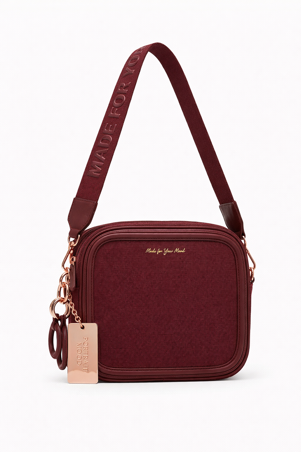 The lens of the auteur. The P|M 'Focus' Camera Bag transforms a utilitarian staple into an object of desire. The body is a perfectly proportioned square, constructed from the house’s signature heavy-gauge canvas in a deep, intoxicating 'Burgundy', framed by matching leather piping that maintains the rigid structure. The hardware is the jewel in the crown: every zipper, clip, and charm is finished in luminous 'Rose Gold', warming the deep red tones of the canvas with a sunset glow. The branding is executed with monochromatic sophistication: the front face features 'Made for Your Mood' in delicate gold script, while the wide webbing strap displays 'PORTRAIT MOOD' on one side and the mantra 'MADE FOR YOUR MOOD' on the reverse in tonal, copper-hued typography. Finished with a heavy, rose-gold metal tag engraved with the vertical logo and a signature chain link charm, it is the ultimate accessory for capturing the moment."