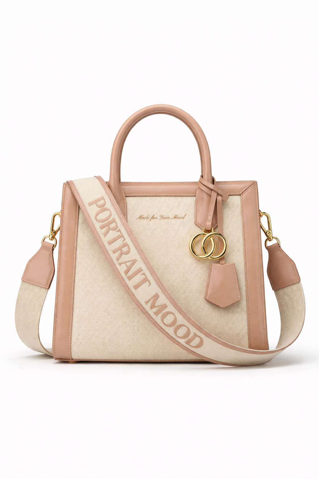The art of framing. The P|M 'Gallery' Frame Tote treats personal style as a curated exhibition. The body is constructed from the house’s signature textured 'Sand' canvas, but it is the perimeter that defines the piece: a rigid, architectural frame of polished 'Blush' leather outlines the square silhouette, creating a window-like effect that feels both modern and timeless. The branding is a study in elegant duality: the canvas center whispers the mantra 'Made for Your Mood' in delicate gold script, floating in the negative space. In contrast, the wide, detachable webbing strap features 'PORTRAIT MOOD' embroidered in large, blush-toned serif typography, turning the functional element into a graphic banner. Finished with rolled top handles, gold-tone hardware, and a signature interlocking-ring charm, it is a bag designed to hold a masterpiece: your daily life."