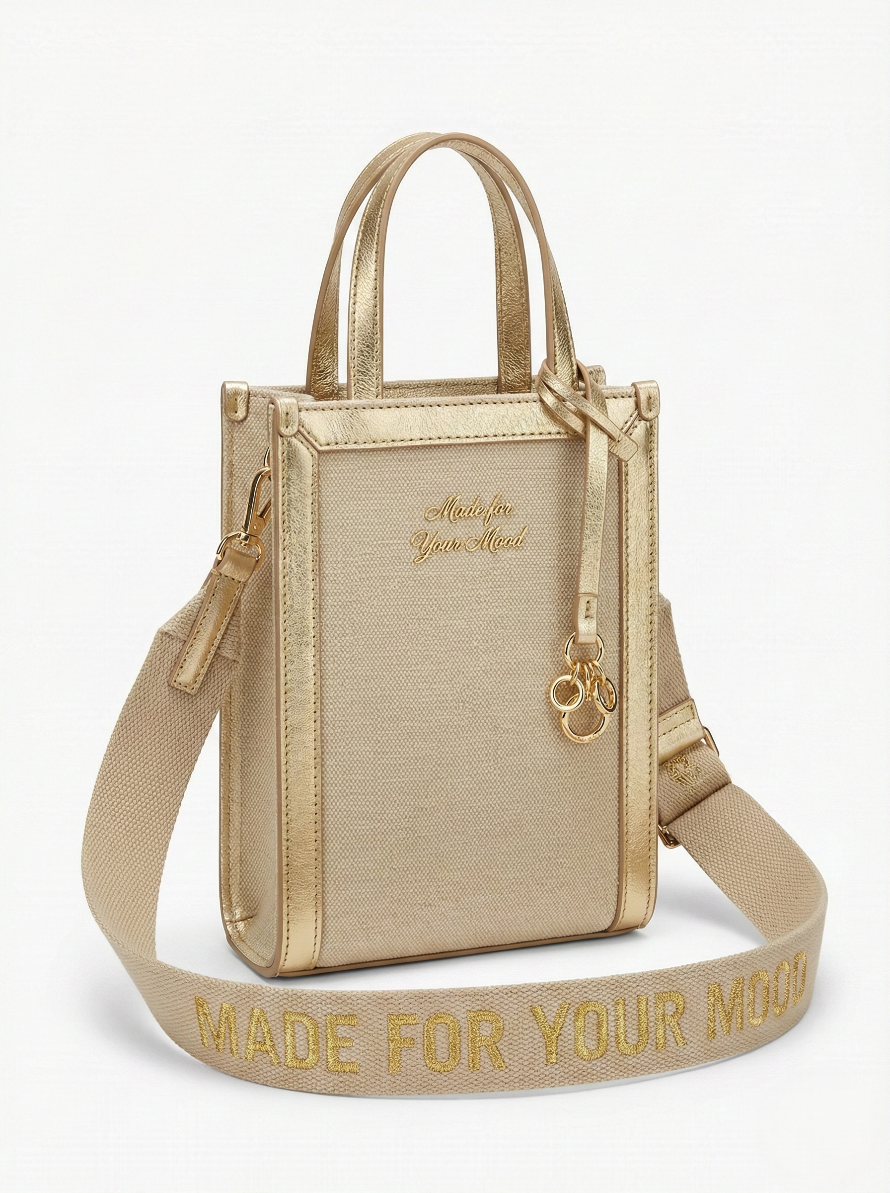 The Midas touch for the modern age. The P|M 'Gilded' Vertical Mini Tote proves that the most powerful statements often come in the smallest packages. The body is a rigid, vertical rectangle constructed from the house’s signature textured 'Sand' canvas, but it is the armor that defines it: a metallic 'Champagne Gold' leather frame encases the edges and forms the slender rolled handles, turning the bag into a piece of wearable jewelry. The branding is executed with radiant duality: the canvas face whispers the mantra 'Made for Your Mood' in raised gold script, catching the light only when you move. In bold contrast, the wide, detachable webbing strap features 'MADE FOR YOUR MOOD' embroidered in heavy metallic gold thread, transforming the bag into a banner of self-expression. Finished with a cluster of kinetic gold ring charms, it is the ultimate evening essential for the woman who lights up the room."