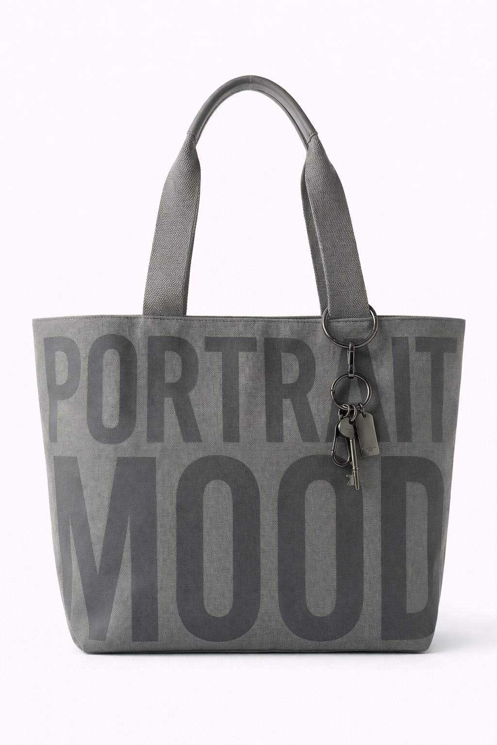 The utility of shadows. The P|M 'Shadow' Graphic Tote masters the art of understated dominance. The body is constructed from the house’s rugged, heavy-weight canvas in a monochromatic 'Charcoal' grey, designed to withstand the daily grind while maintaining a sharp, architectural form. The branding is massive yet tonal: 'PORTRAIT MOOD' is printed edge-to-edge in a slightly darker, matte charcoal ink, creating a phantom graphic that reveals itself only upon closer inspection. This stealth aesthetic is complemented by gunmetal hardware, including a skeleton key charm and ring tag that hang from the handle, symbolizing access to the unseen. Finished with durable webbing handles and a wide, adjustable shoulder strap featuring the 'MADE FOR YOUR MOOD' mantra in tonal print, it is the ultimate tool for the urban strategist."