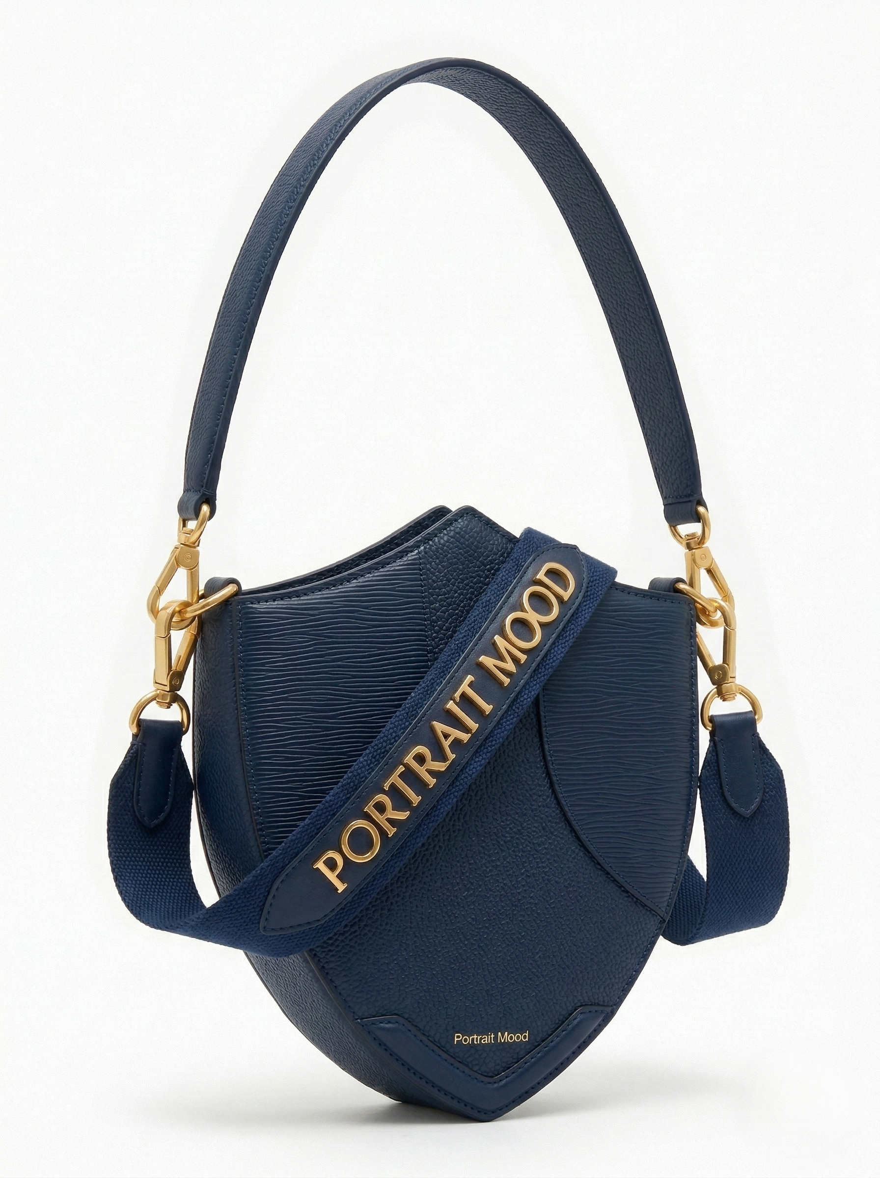 A masterclass in structural authority and versatile elegance. The P M Sovereign Shield Convertible Bag in Navy is an uncompromising architectural statement designed for high impact and adaptability. The rigid body features a radical crest silhouette crafted from highly durable navy calfskin showcasing a striking interplay of deep pebbled textures and sleek striated paneling. The carriage effortlessly merges formal elegance with dynamic urban utility. It features an elegant leather shoulder strap for refined wear and a wide adjustable webbing strap designed for bold crossbody styling. This heavy duty crossbody strap serves as a wearable manifesto bearing the brand name PORTRAIT MOOD in prominent custom cast gold metal lettering. Grounded by a delicate gold foil base signature and anchored by gleaming gold hardware, it is a formidable and fiercely protective daily companion.