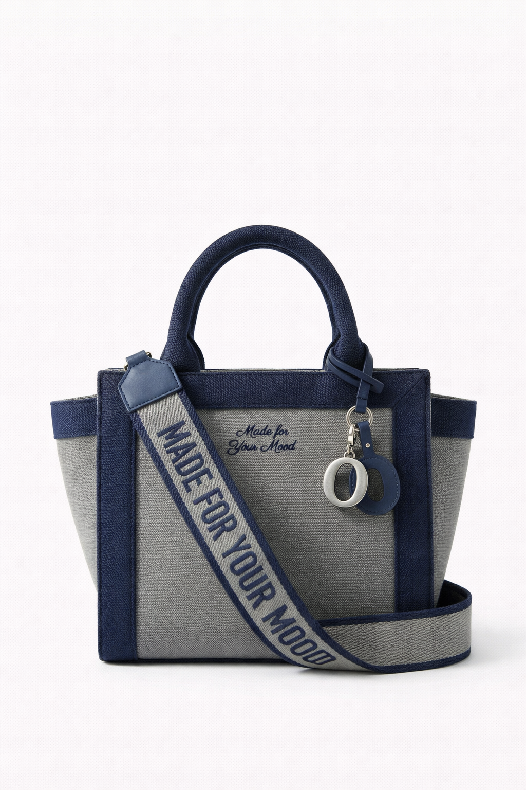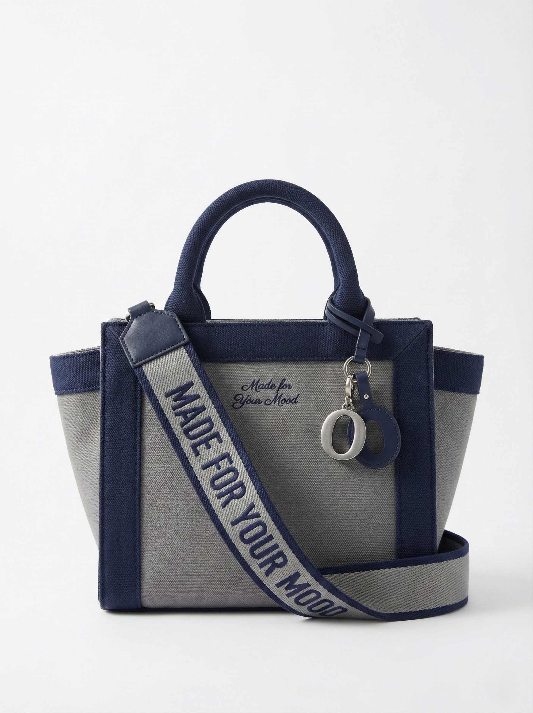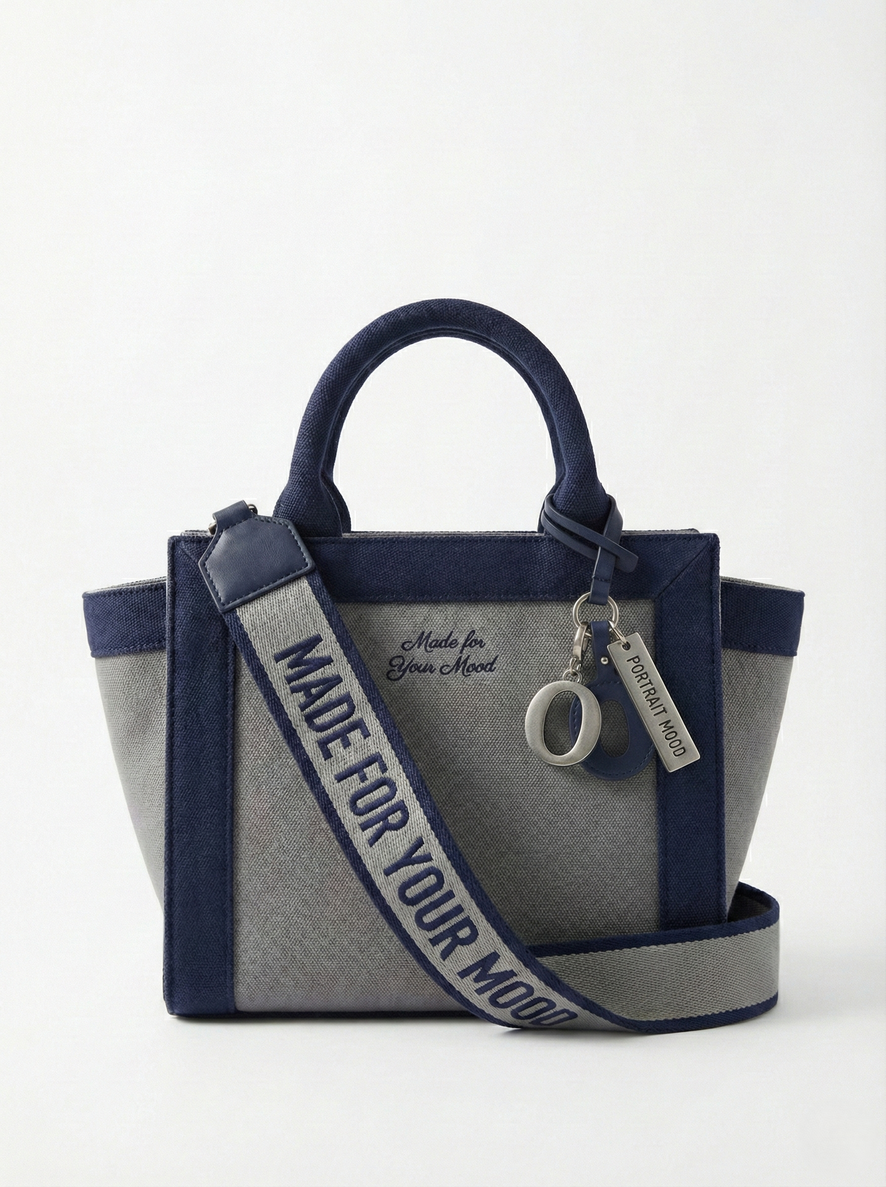 The discipline of contrast. The P|M 'Union' Two-Tone City Tote redefines the daily carry through a sharp, architectural lens. The body is a structured trapezoid crafted from textured 'Slate Grey' canvas, rigidly framed by deep 'Midnight Navy' canvas borders and rolled handles that define the silhouette with military precision. The branding plays a sophisticated game of scale: the front panel whispers the house mantra 'Made for Your Mood' in delicate navy script, offering a private note of intent. In bold opposition, the wide, detachable webbing strap shouts 'MADE FOR YOUR MOOD' in industrial navy typography against a grey ground, ensuring the message projects outward. Finished with polished silver hardware and a kinetic cluster of charms—including a metal 'PORTRAIT MOOD' bar and the signature 'O'—it is a tote that balances softness with strength."