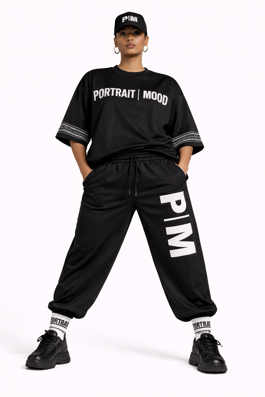 A definitive stamp of the inner circle. The PM Bold Monogram Jogger transforms the house code into a graphic pillar. Expertly cut from our signature heavyweight cotton fleece in deep, saturated noir, the garment offers a dense, reassuring weight that holds its tapered shape with architectural precision. The design is commanded by a massive, high-contrast 'P|M' split monogram printed in stark white on the left thigh, creating an immediate, vertical visual anchor. This piece balances graphic aggression with tailored restraint—featuring a clean elasticated waistband, premium metal-tipped drawstrings, and substantial gathered cuffs that ensure the silhouette sits perfectly over statement footwear.