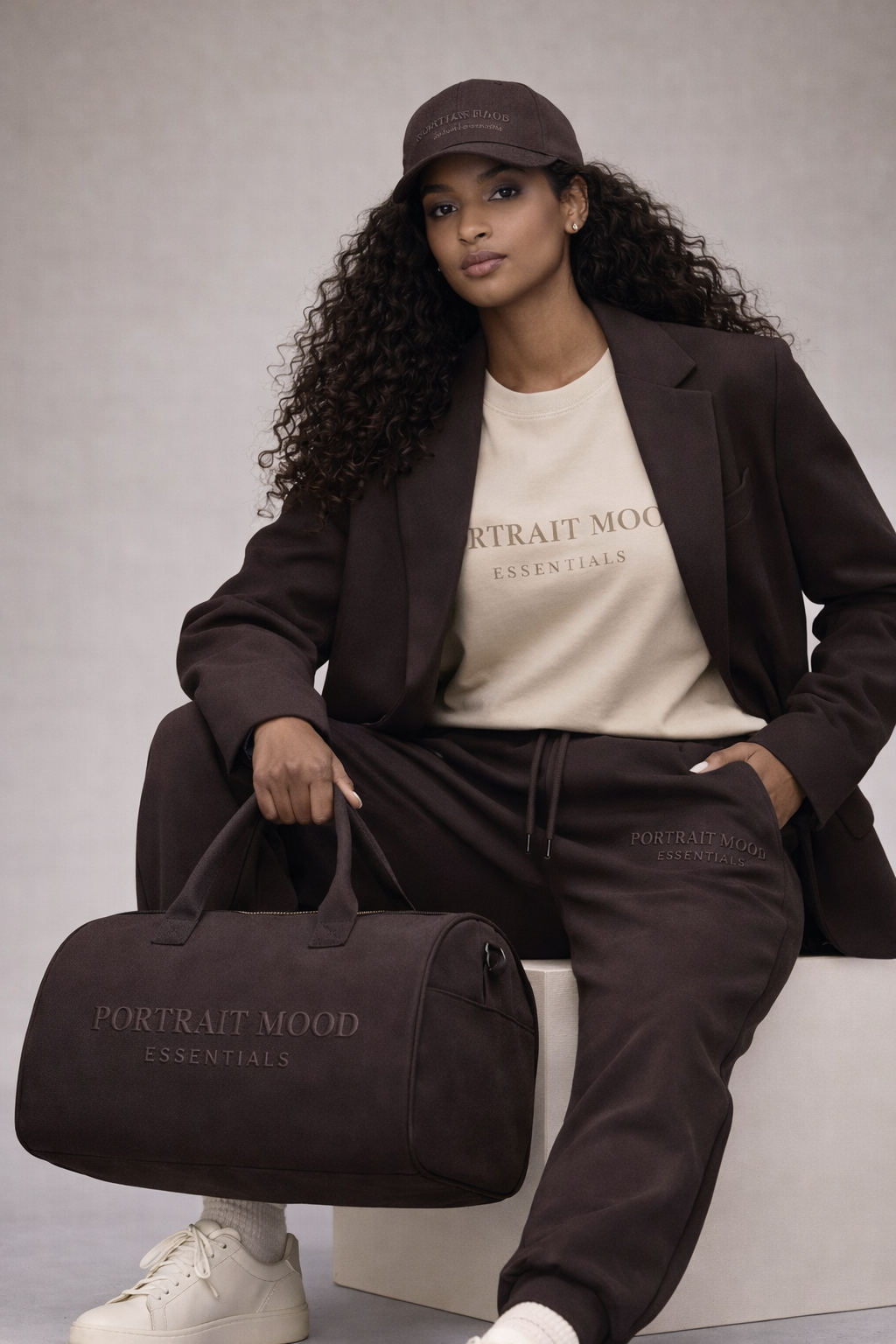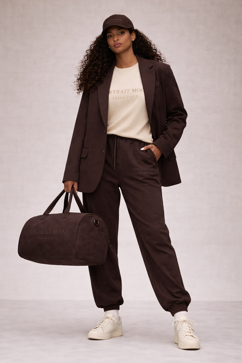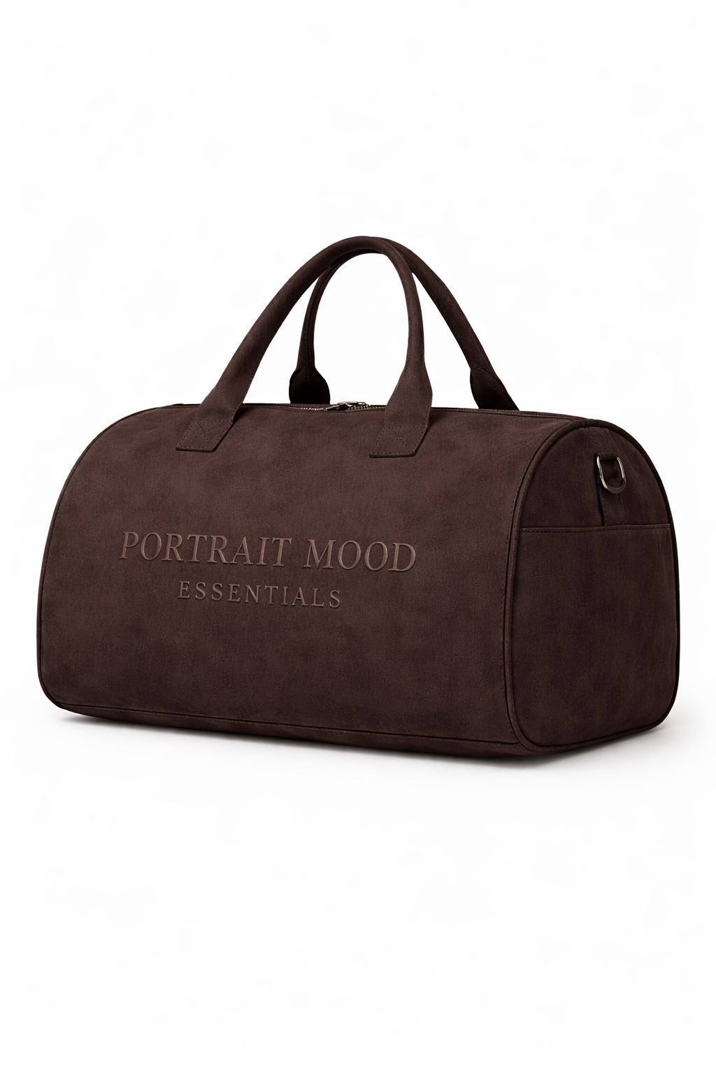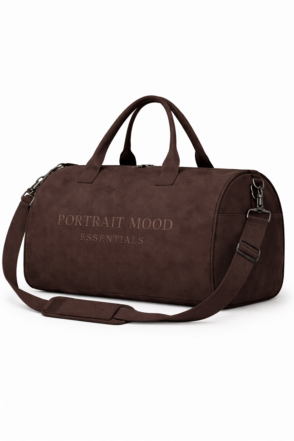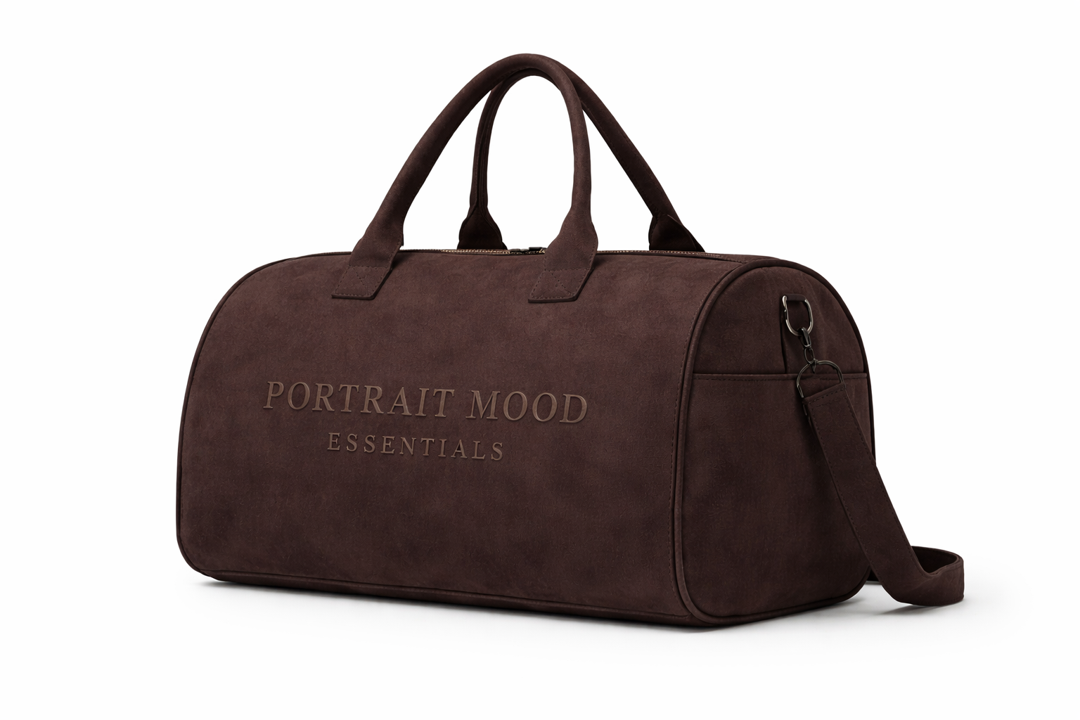The definitive vessel for the modern journey. The PM Espresso Tonal Weekender translates the architectural comfort of our apparel into a piece of high-performance luggage. Expertly crafted from a premium, velvet-touch suede-finish material in deep, saturated espresso, the bag offers a rich, tactile experience while maintaining rigorous durability. The design is anchored by the 'PORTRAIT MOOD' and 'ESSENTIALS' wordmarks embossed directly into the side panel, creating a sophisticated 3D sculpted effect that is both commanding and discreet. Structured to hold its clean barrel shape even when empty, it features dual reinforced top handles and a detachable shoulder strap with matte dark hardware for a seamless, monochromatic finish.