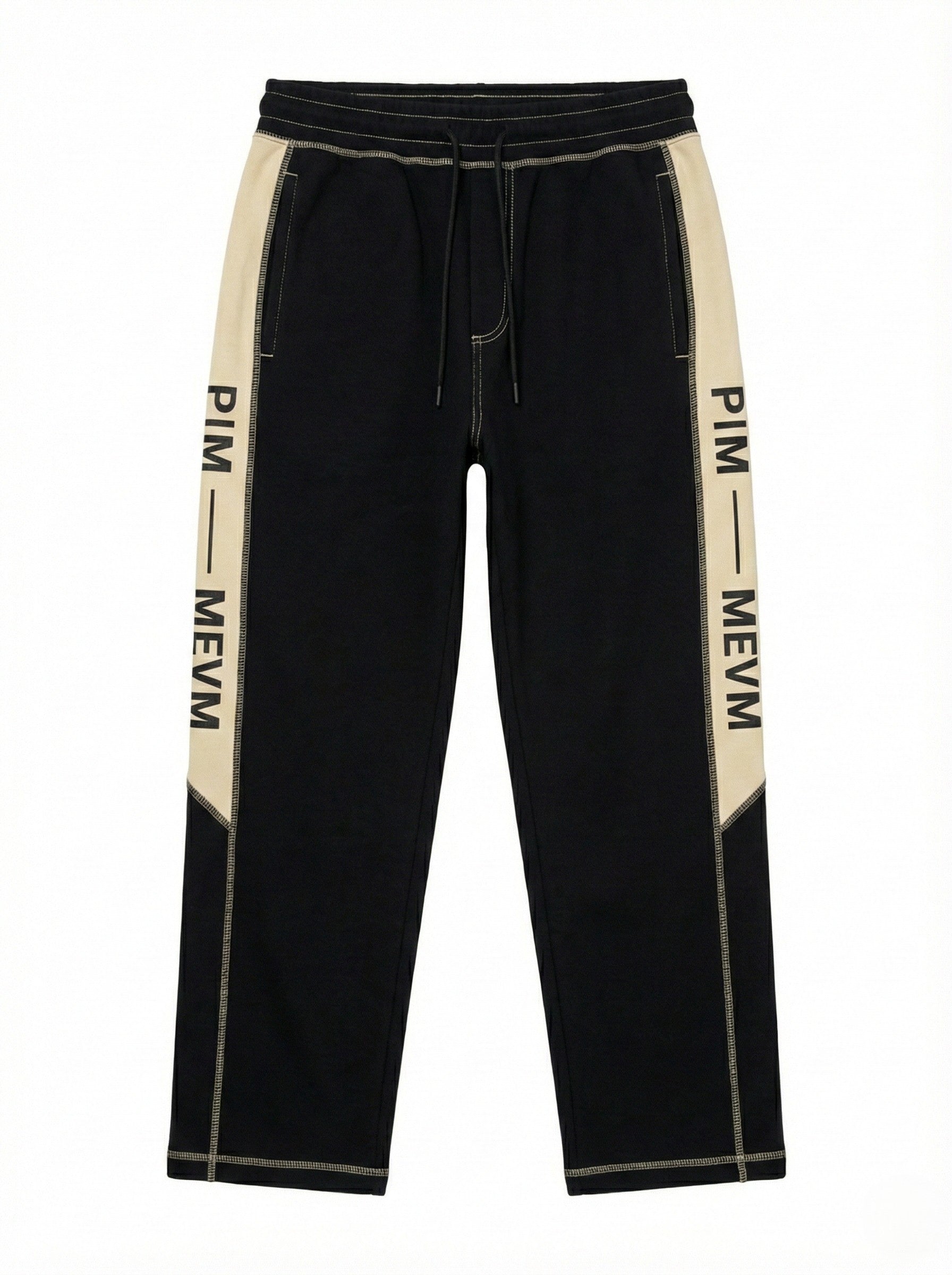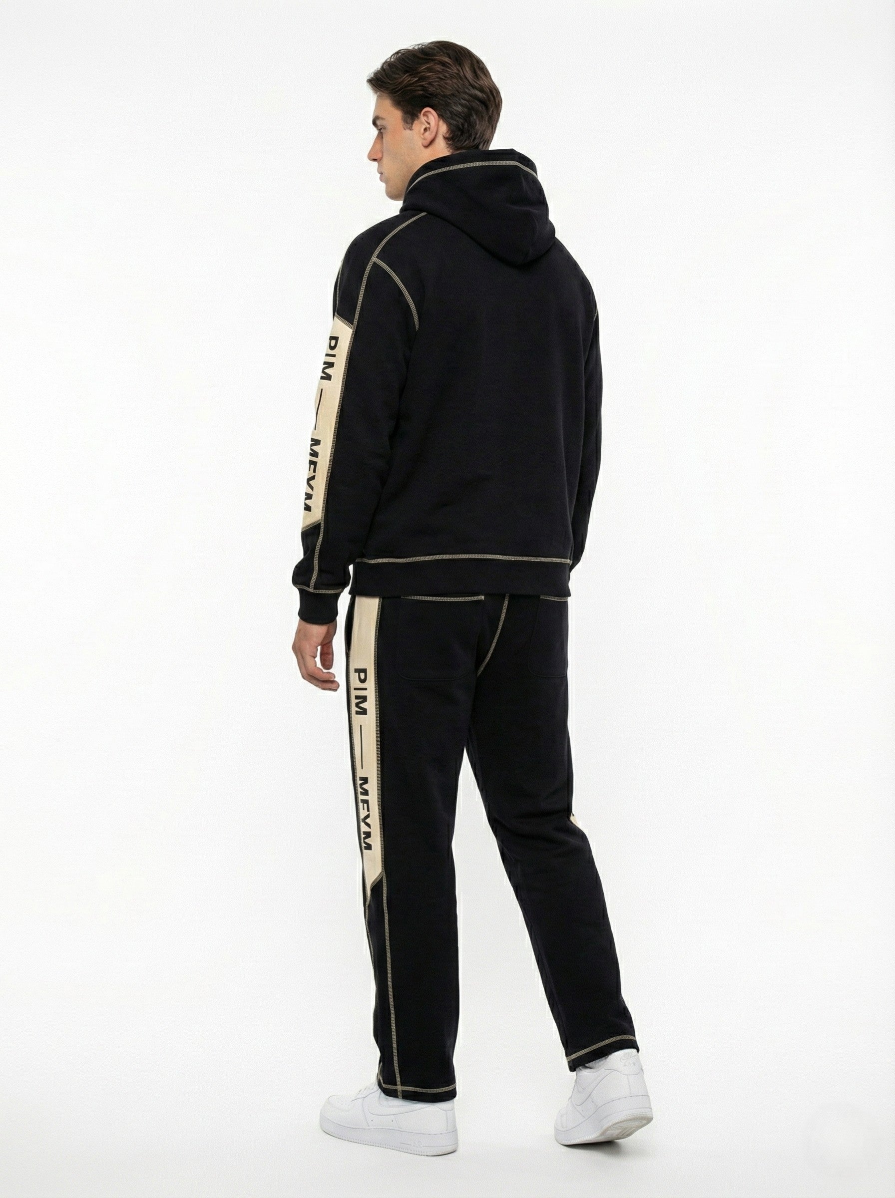 A cohesive statement of architectural precision. The PM Linear Icon Tracksuit merges our structured hoodie and track pant into the ultimate uniform for the modern avant-garde. Constructed from ultra-dense black cotton jersey, the set is defined by a continuous vertical line created by the engineered beige taping that runs from shoulder to hem, bearing the 'P|M — MFYM' mantra. High-contrast beige overlock stitching maps the body’s movement, turning every seam into a deliberate design element. The silhouette is rigorous yet fluid, offering a sharp, elongated profile that commands attention without saying a word.