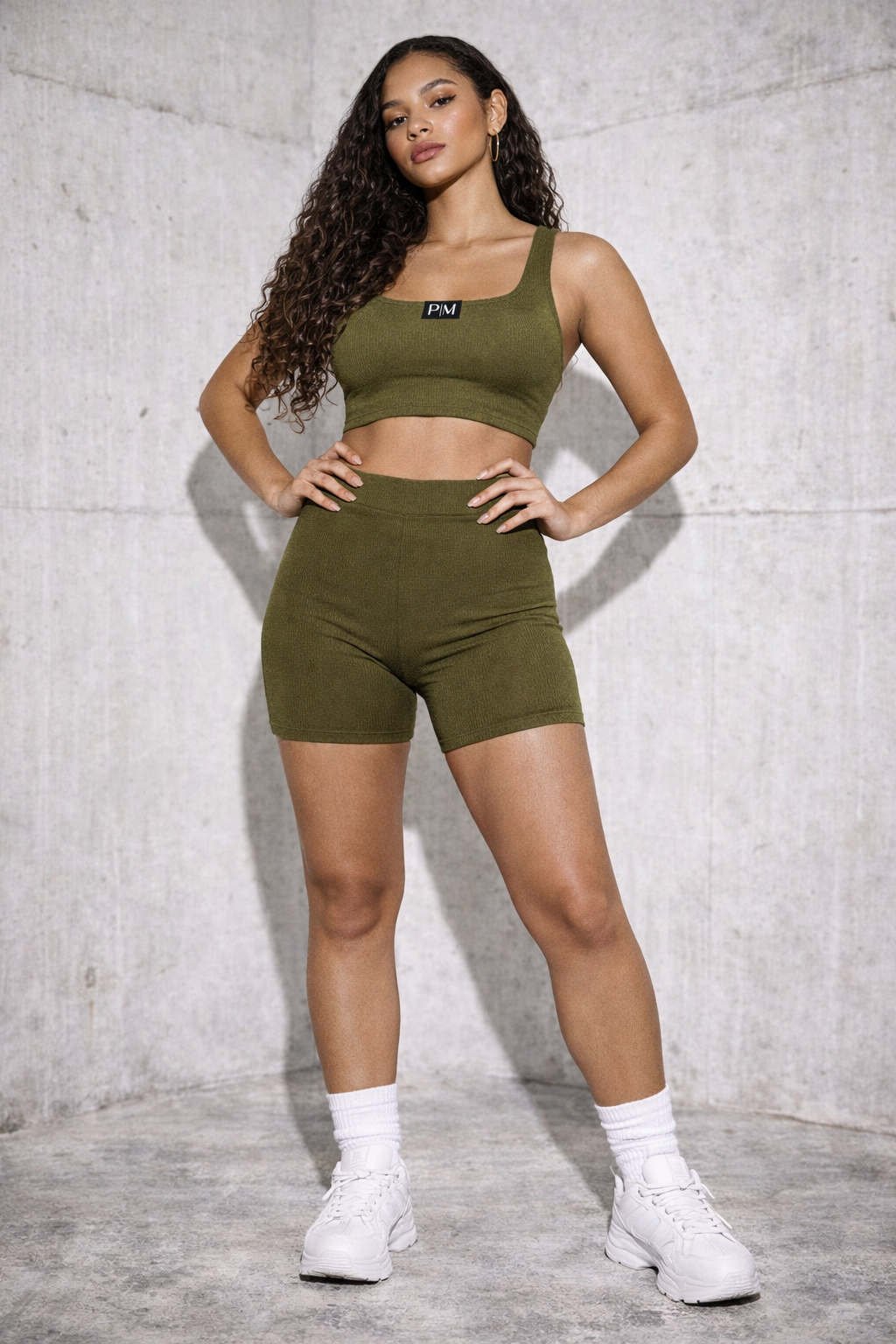The architecture of comfort. The PM Ribbed Utility Square-Neck redefines the essential base layer with a focus on tactile luxury. Expertly crafted from a high-density, premium ribbed knit in a sophisticated 'Tactical Olive' hue, the garment offers a rich, expanding texture that contours to the body without constriction. The silhouette is defined by a rigorous square neckline and wide, supportive straps that frame the collarbones with modern geometric precision. Centered on the chest, a high-definition woven label features the 'P|M' split monogram in stark monochrome, acting as a badge of functional identity. Finished with a wide, seamless underband, it provides a grounded, secure fit for the active life.