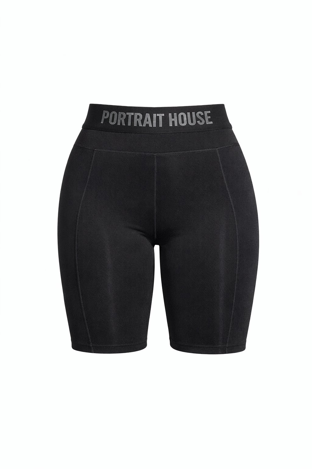 The definitive base layer for the modern sanctuary. The Portrait House Identity Biker merges the support of performance wear with the refined aesthetics of luxury lounge. Expertly crafted from our signature matte compression fabric in deep noir, the garment features architectural vertical seaming down the front legs to elongate the silhouette and provide a structured, sculpting fit. The design is anchored by a substantial high-rise elastic waistband, engineered with the 'PORTRAIT HOUSE' logotype in a sophisticated tonal grey that offers a subtle yet unmistakable stamp of ownership. Finished with flatlock stitching for seamless comfort, it is designed to move with the body while maintaining a sharp, executive profile.