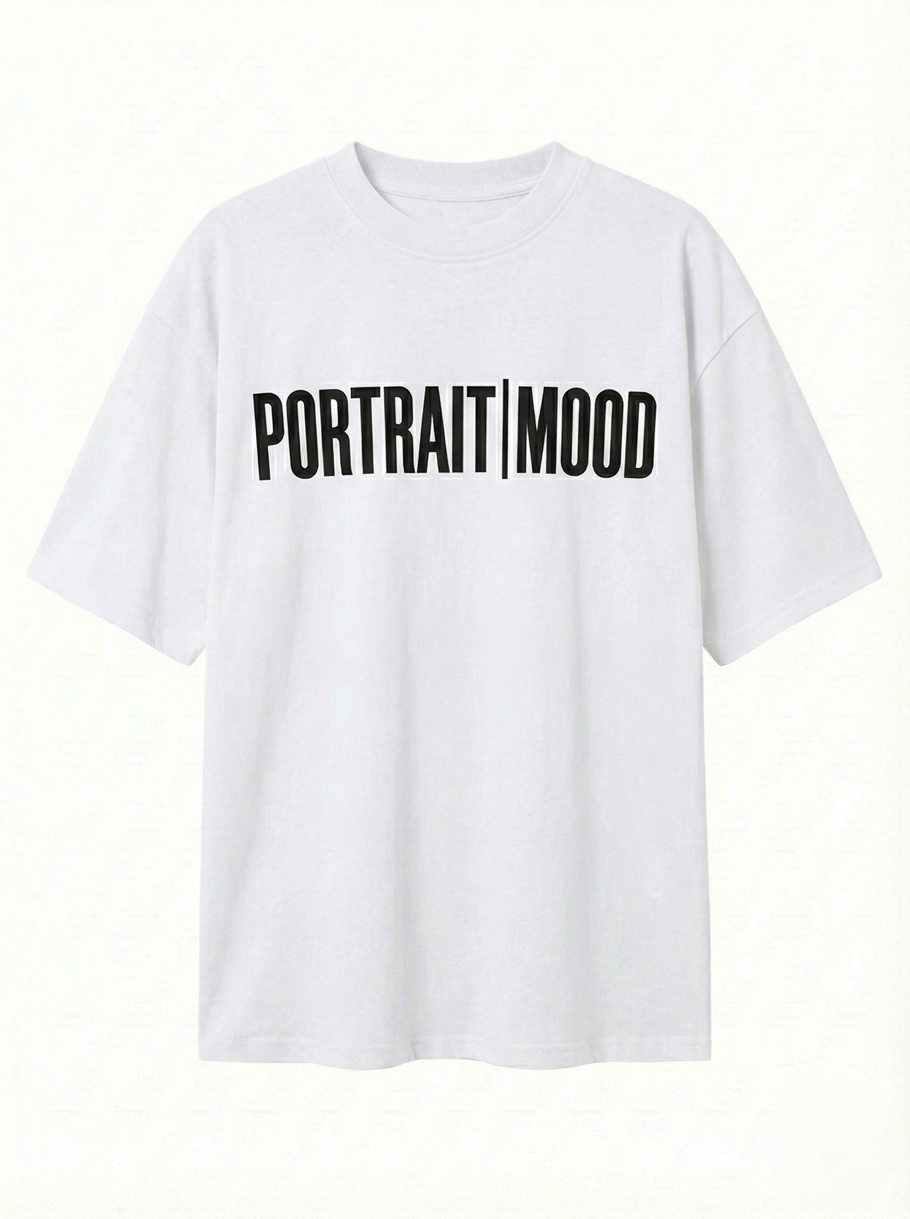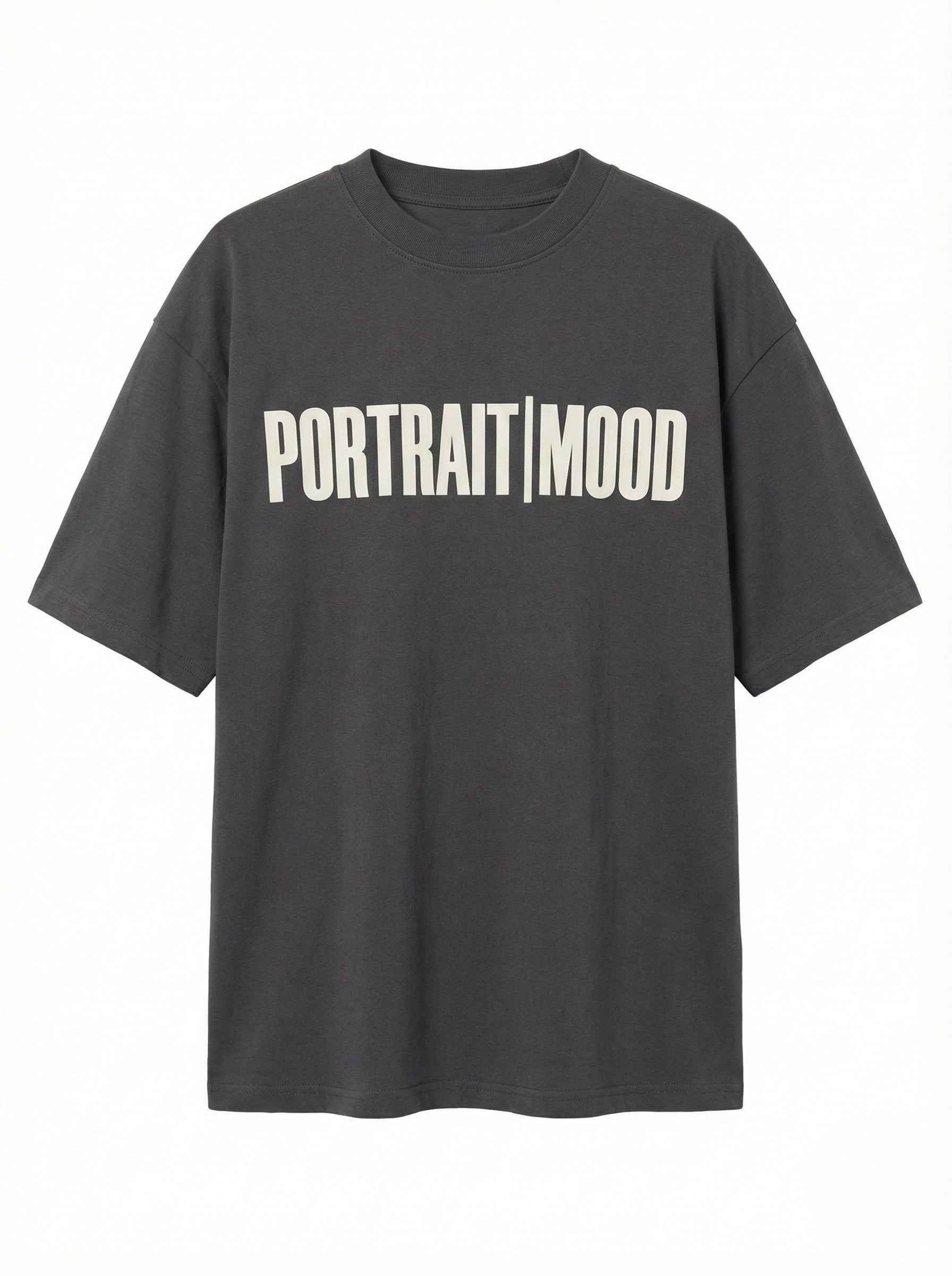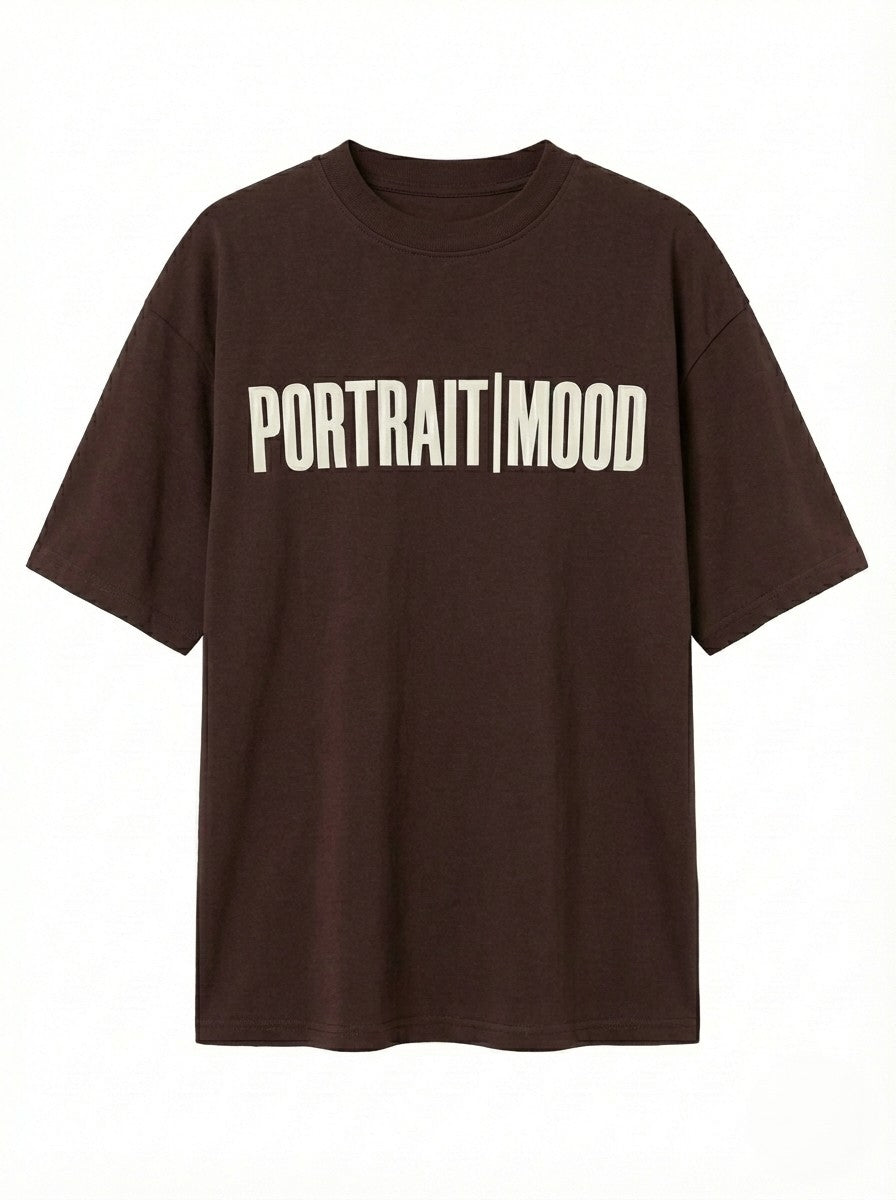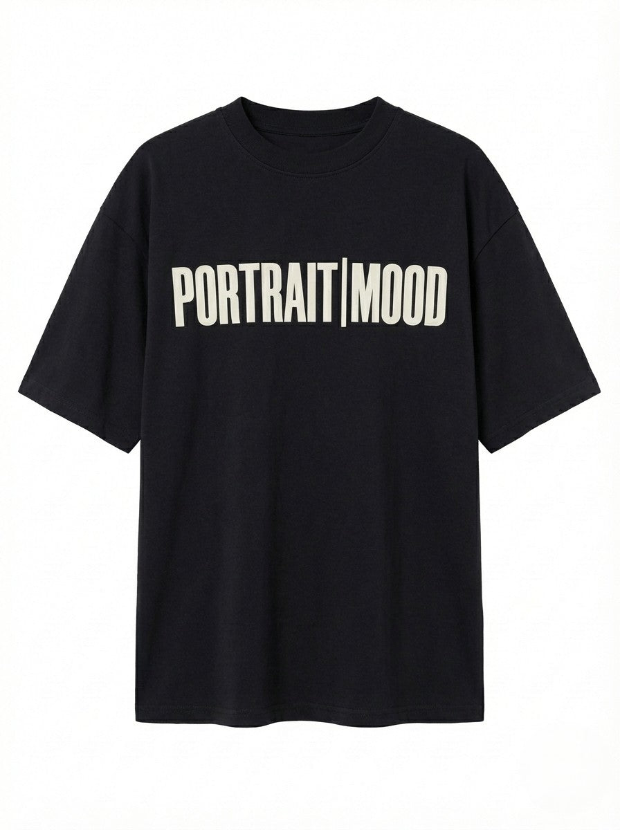 The manifesto of the modern creative. The Portrait Mood Signature Tee turns branding into a bold architectural statement. Expertly cut from our signature heavyweight cotton jersey, the silhouette offers a relaxed, drop-shoulder fit that provides a structured, substantial drape across every colorway. The design is anchored by the definitive 'PORTRAIT|MOOD' wordmark across the chest, executed in crisp, high-contrast typography that commands attention without saying a word. Finished with a clean crew neck and precision tonal stitching, it is the ultimate canvas for self-expression.
