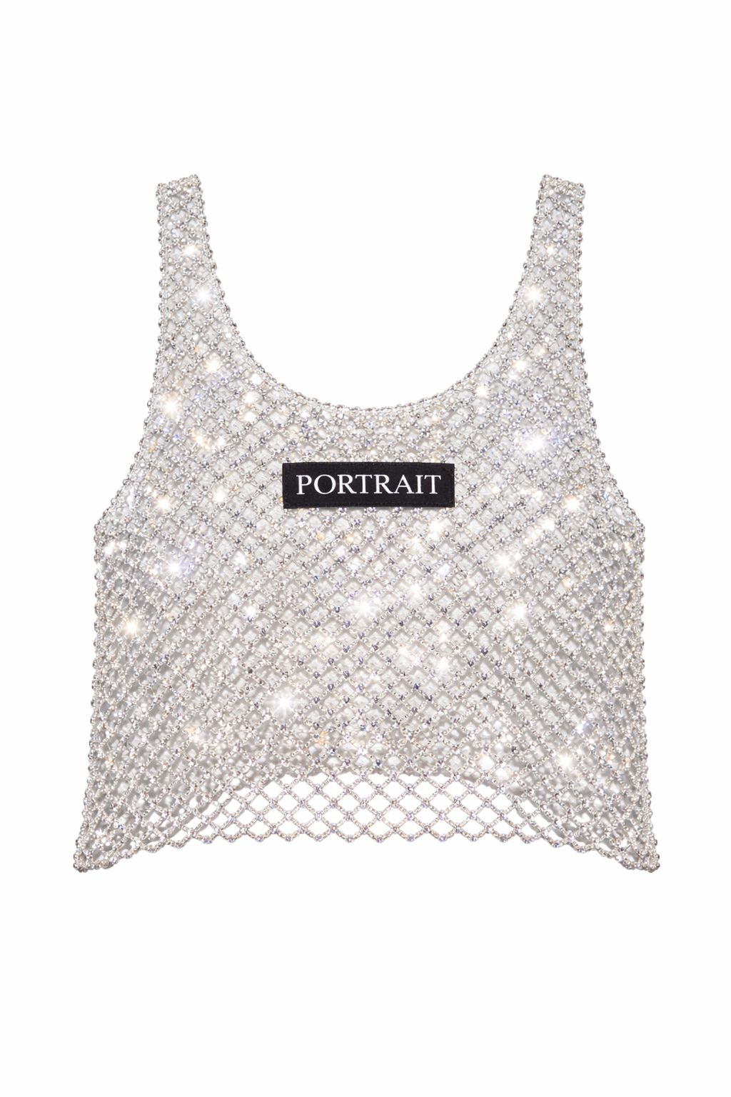 Wearable light. The P|M 'Prism' Crystal Mesh Tank is not merely a top; it is jewelry for the entire torso. Constructed from a fluid, heavyweight lattice of high-clarity crystals, this piece moves like liquid silver, capturing and refracting every photon in the room to create a halo of shine. The delicate, shimmering grid is grounded by a stark, industrial intervention: a structured black rectangular patch on the chest bears the house name 'PORTRAIT' in crisp white capital letters, creating a sharp contrast between opulence and streetwear grit. Designed as the ultimate layering weapon, it transforms a simple grey hoodie into couture when worn over it, or offers pure, unfiltered glamour when styled for the night. It is armor for the woman who refuses to be ignored."