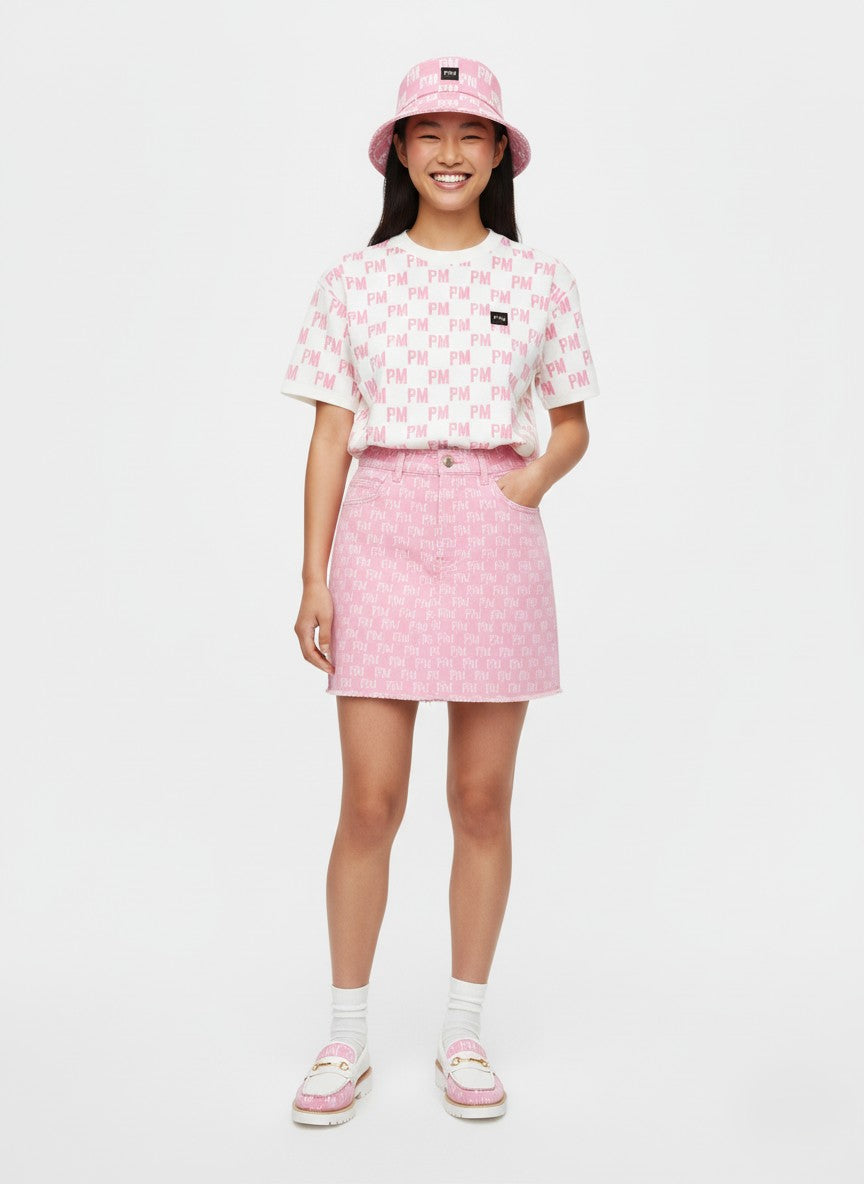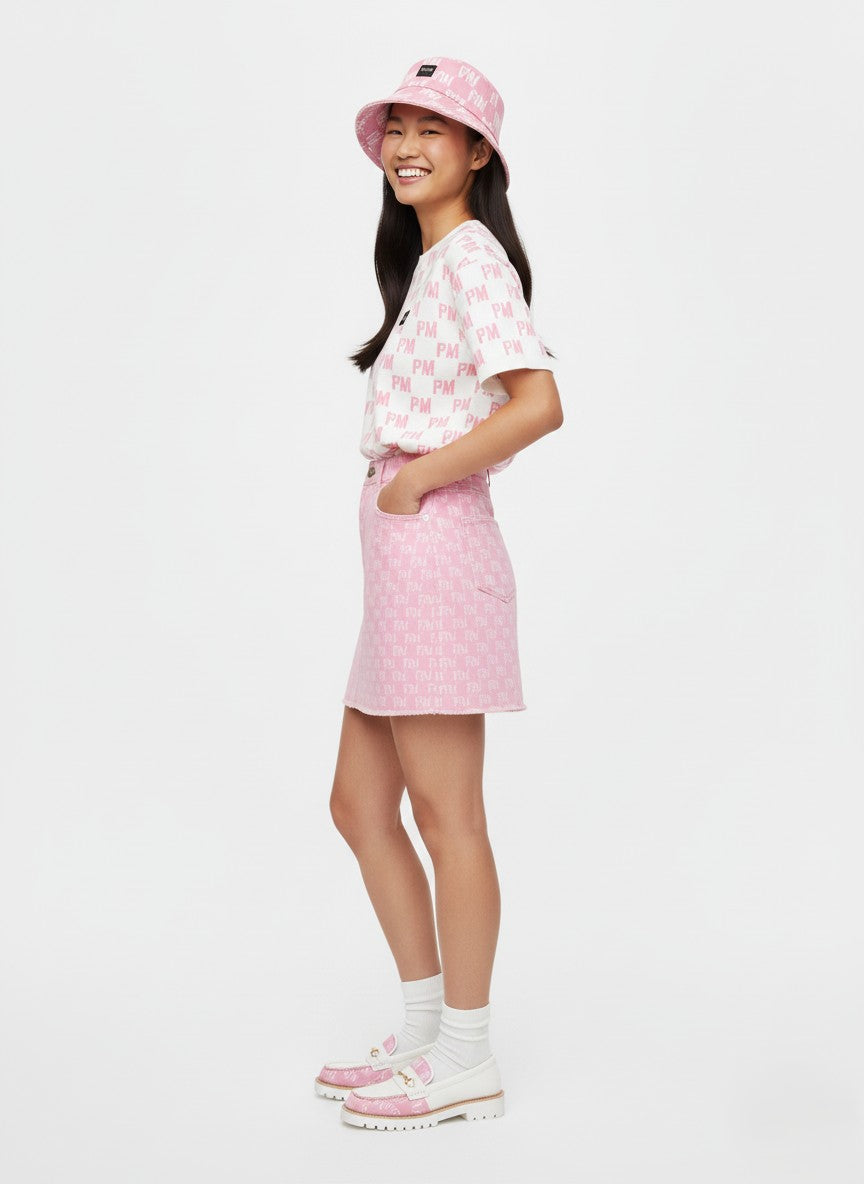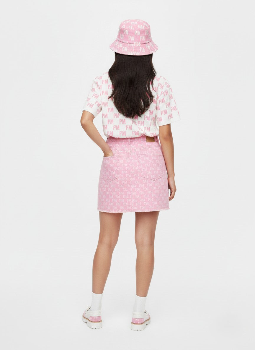 A playful subversion of the classic mini. The PM Bubblegum Monogram Skirt balances youthful energy with high-fashion construction. Crafted from premium, structure-holding denim in our signature bubblegum pink wash, this piece serves as a canvas for the all-over 'P|M' and 'M' monogram in crisp white. The silhouette is defined by a flattering high-rise fit and a rebellious, hand-finished raw hem that adds texture to the clean lines. Finished with a polished gold-tone P|M logo plate at the corner, it is a piece that demands to be the center of attention.