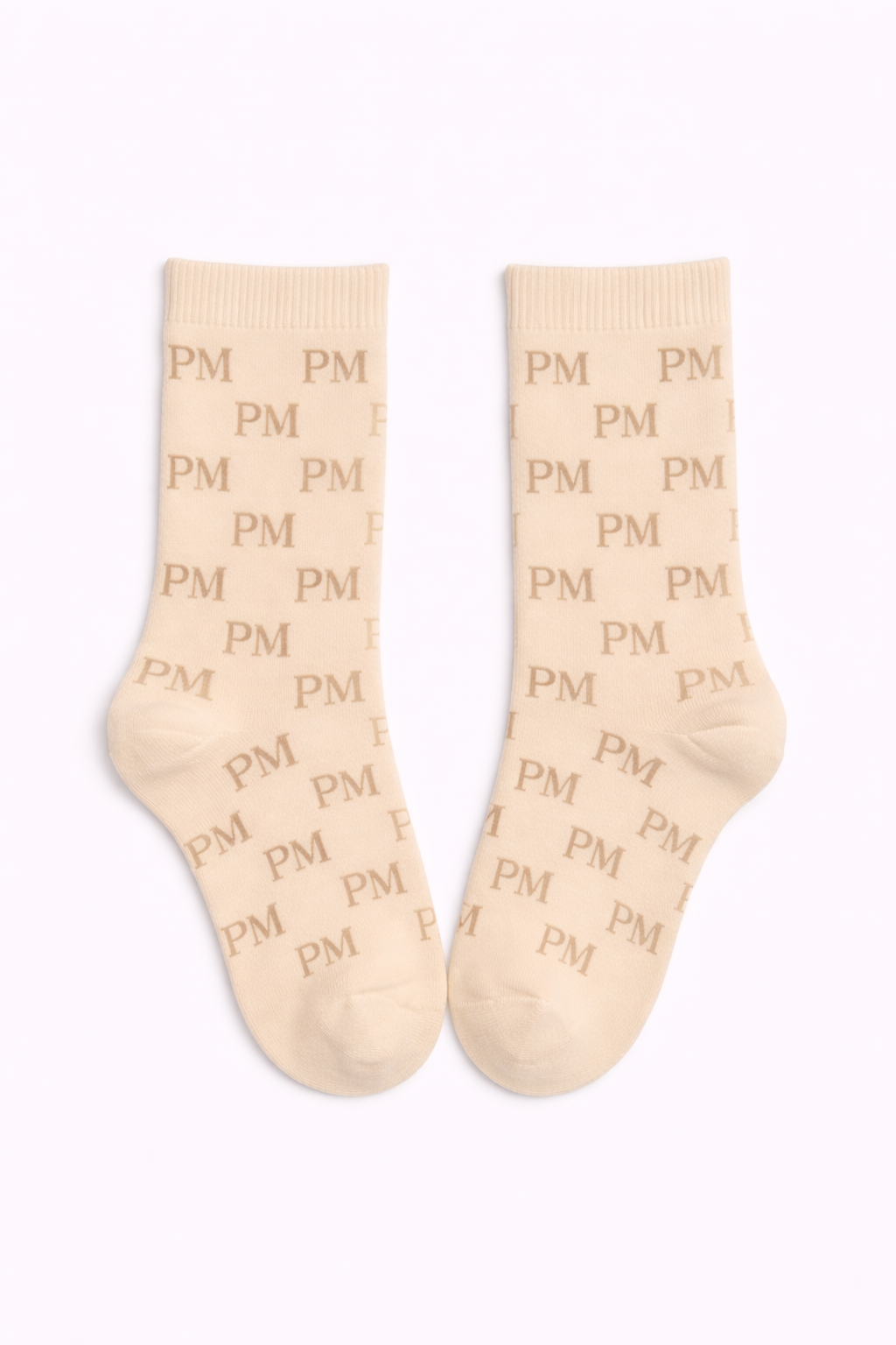 The subtle signifier of a complete wardrobe. The PM Sandstone Monogram Sock brings the Maison’s identity to the most essential layer. Knitted from a premium, soft-touch cotton blend in a refined sandstone cream, this pair features an all-over 'PM' monogram in warm taupe. Designed with a structured ribbed cuff that stays in place and reinforced stress points for longevity, they offer a moment of private luxury with every step.