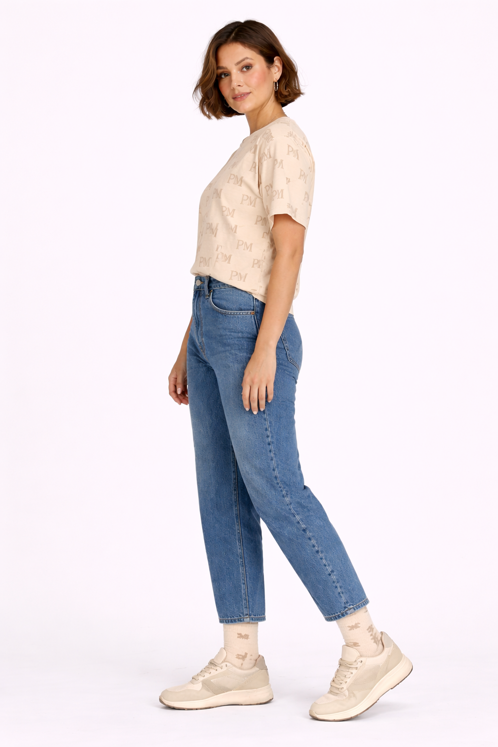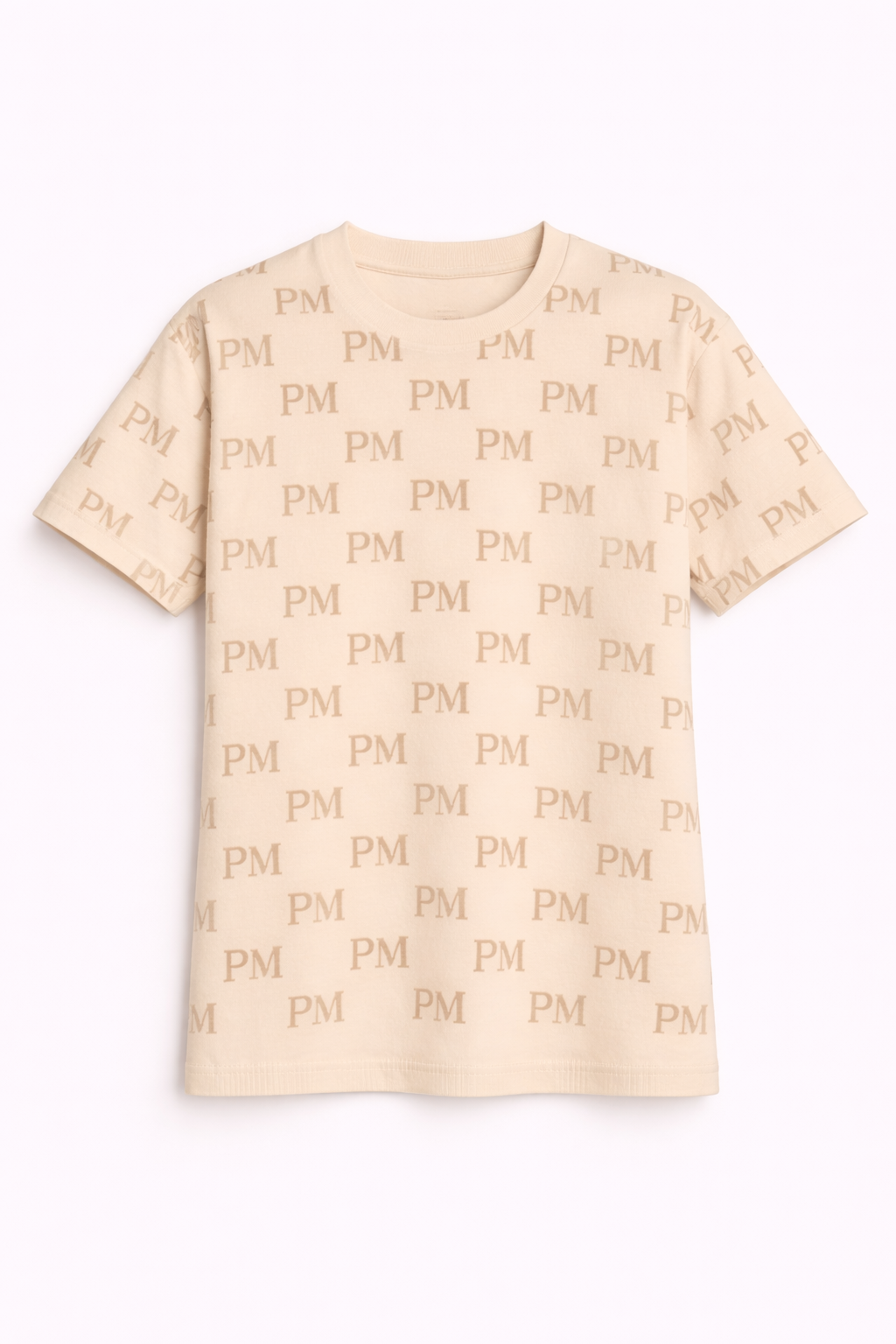 Quiet confidence in a classic silhouette. The PM Sandstone Monogram Cotton Tee transforms the humble t-shirt into a canvas of luxury. Cut from our signature premium-weight cotton jersey in a soft sandstone cream, this piece offers a drape that is both substantial and incredibly soft against the skin. The design is defined by the rhythmic, all-over 'PM' monogram print in warm taupe, creating a sophisticated visual texture that acts as a subtle seal of quality. Finished with a precise ribbed crew neck and clean-finished hems, it is the perfect foundational piece for a layered, tonal look.