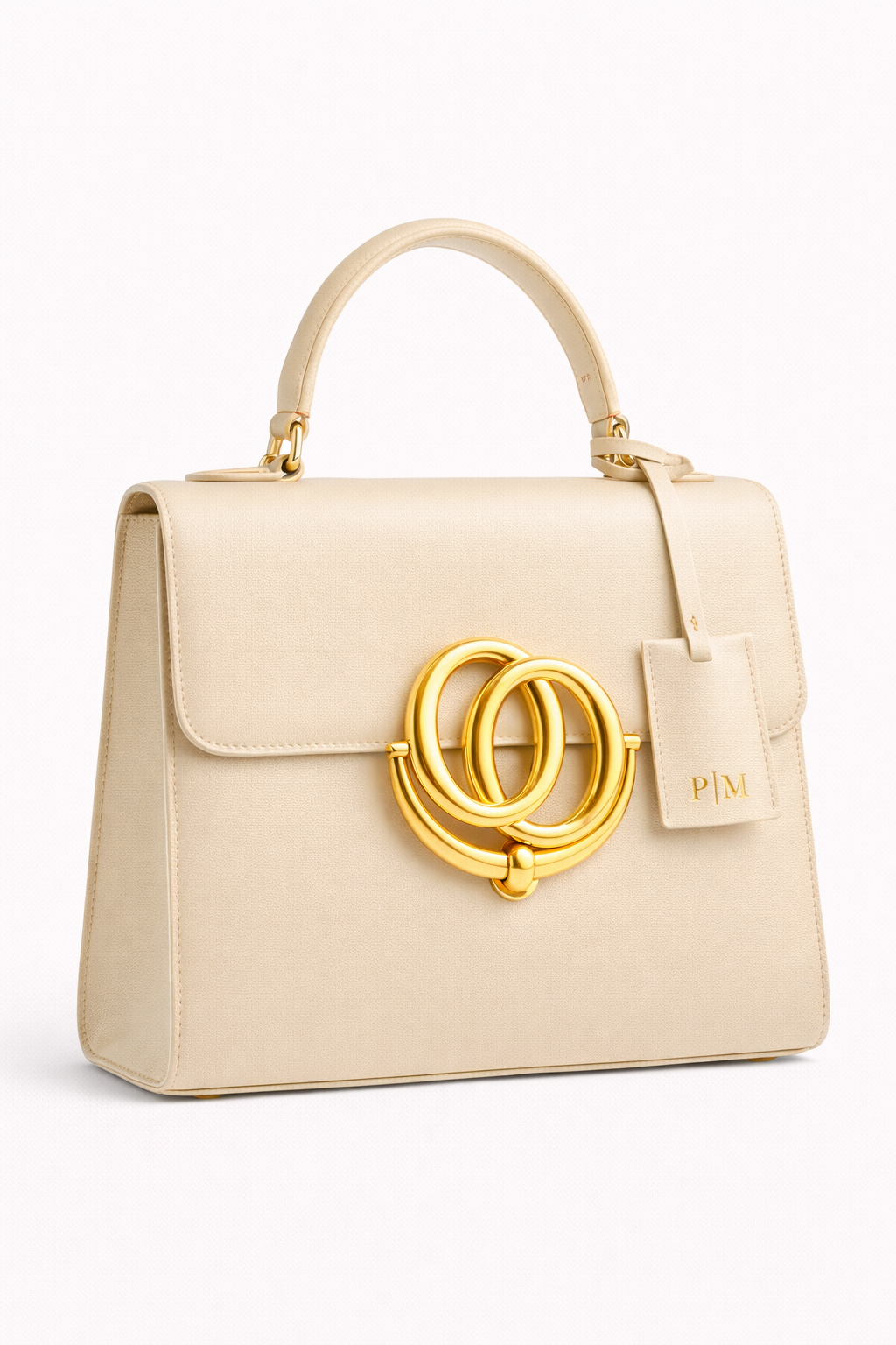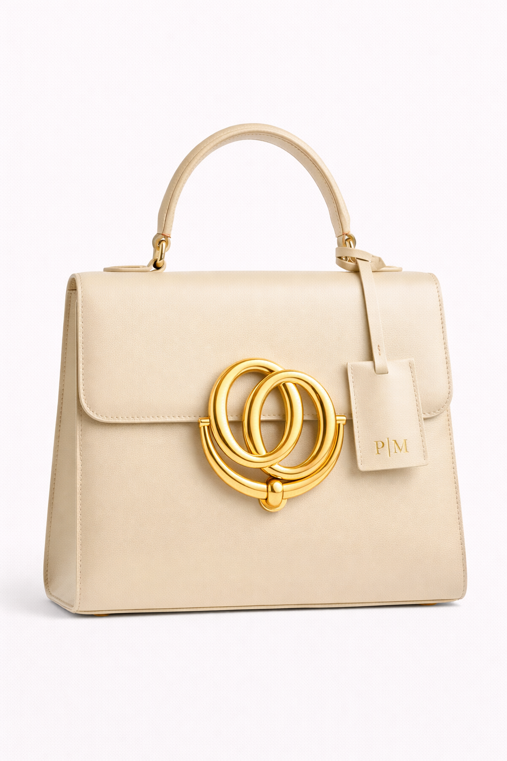 The architecture of light. The P|M Sovereign Top Handle in Alabaster is a masterclass in restraint and radiance. Constructed from pristine Original Box Calfskin, the leather offers a flawlessly smooth, semi-matte finish that feels cool to the touch and holds its rigid, trapezoidal shape indefinitely. The severe geometry is softened by the color—a rich, creamy Alabaster hue that serves as a neutral canvas for the bag’s crown jewel: the massive, sculptural interlocking ring closure, heavily plated in 24k Gold. Every edge is hand-painted and heat-sealed for longevity. Finished with a matching leather hangtag bearing the P|M seal in gold foil, this bag is designed to be the brightest object in the room.
