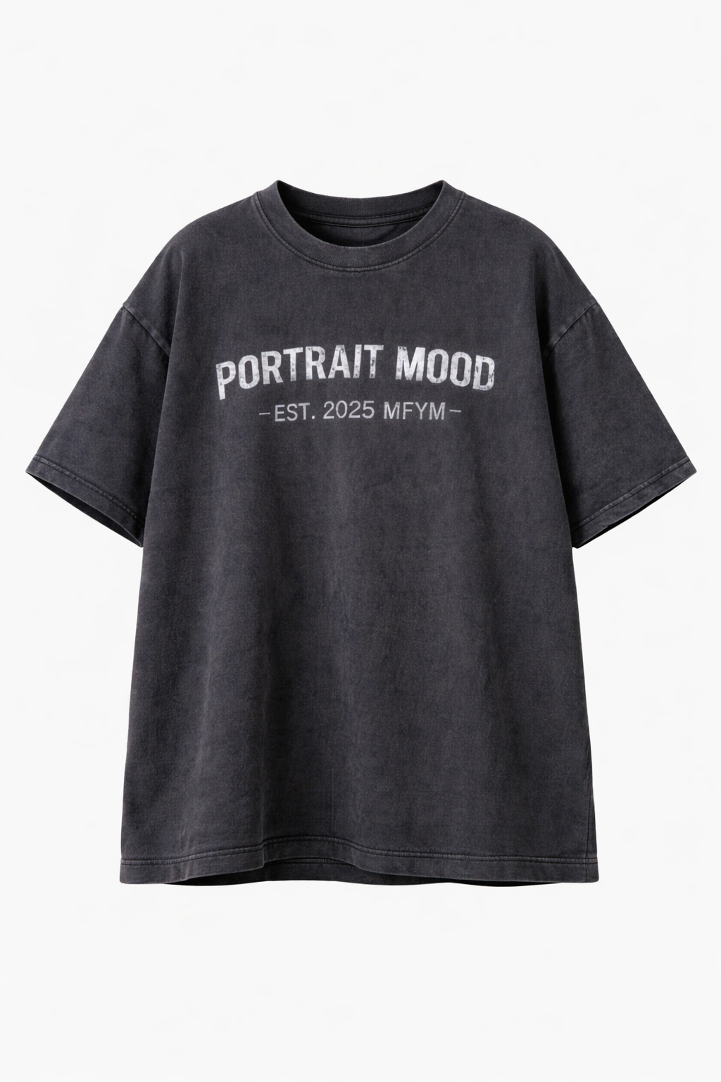 A relic of the future. The PM Vintage Heritage Identity Tee is engineered to carry the weight of a collected icon from the moment it touches the skin. Expertly crafted from premium heavyweight cotton, the garment has undergone a rigorous mineral wash process to achieve a multi-dimensional 'Vintage Charcoal' hue, characterized by authentic fading and a soft, broken-in hand feel. The chest features the 'PORTRAIT MOOD' logotype anchored by the founding mark 'EST. 2025 MFYM', executed in a distressed, cracked-ink finish that appears embedded directly into the fiber. Cut with our signature oversized, drop-shoulder silhouette and finished with a thick, distressed ribbed collar, it masters the art of effortless, lived-in luxury.