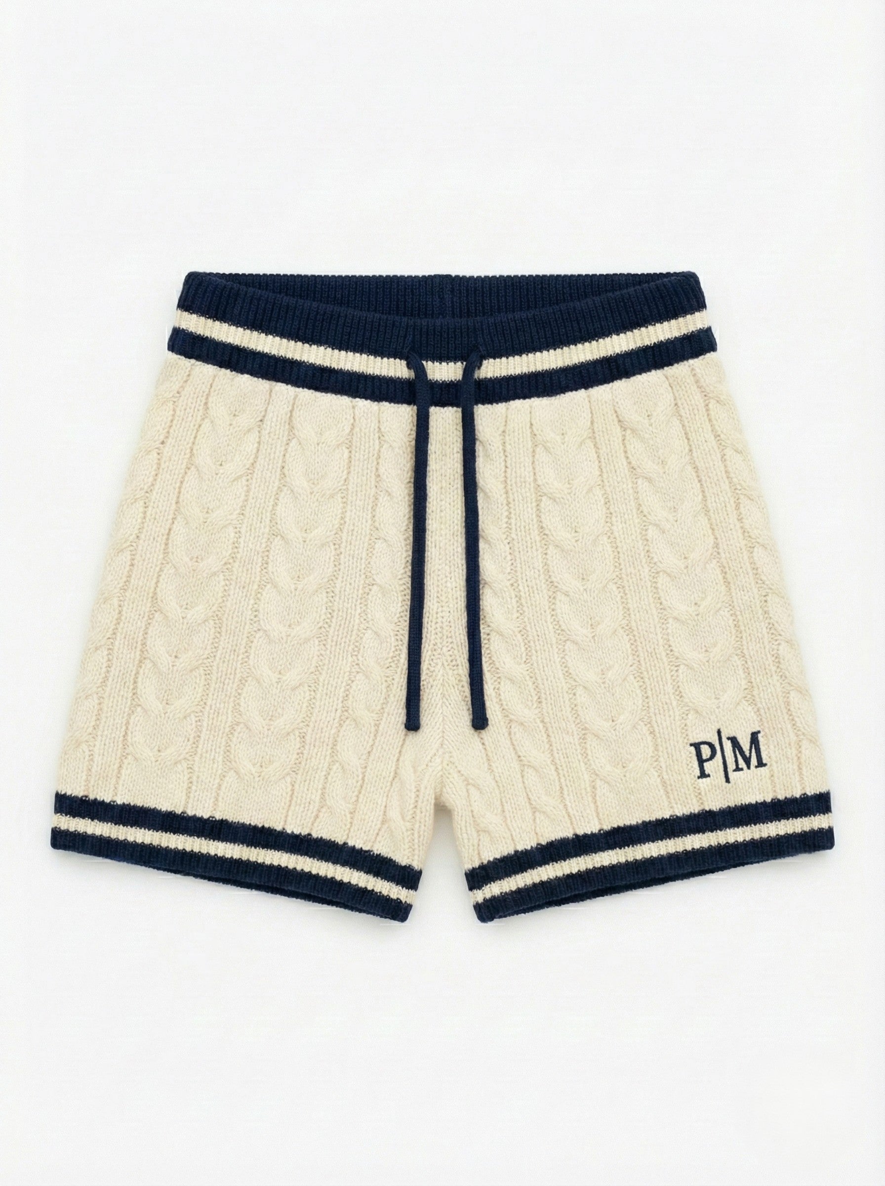 Alpine luxury meets varsity heritage. The PM Heritage Cable Knit Short redefines leisurewear with a focus on artisanal texture and timeless sport. A standout piece in The P|M Essentials House Collection, these shorts are crafted from a decadent, heavyweight wool blend featuring a rich, dimensional cable knit weave that elevates the silhouette beyond the ordinary. The design is framed by a substantial ribbed waistband and hem, both accented with heritage navy tipping that evokes the nostalgia of classic athletic uniforms. Finished with a functional drawstring closure and the signature 'P|M' insignia embroidered on the leg, they offer a look of curated downtime that feels as expensive as it looks.