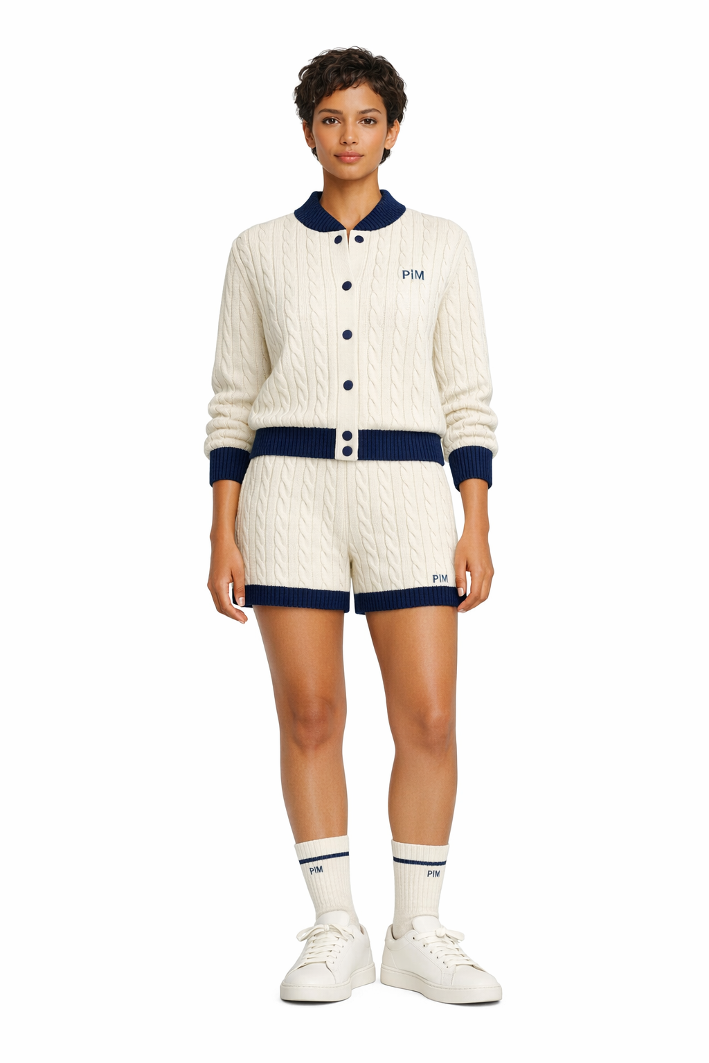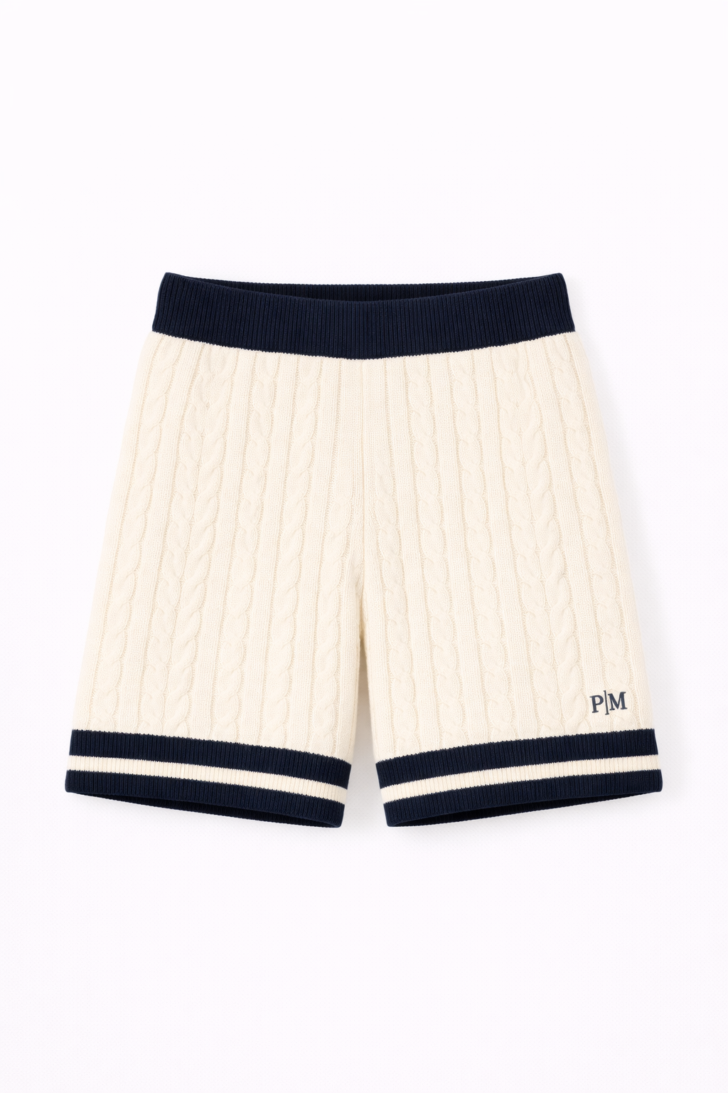 Alpine luxury meets varsity heritage. The PM Heritage Cable Knit Short redefines leisurewear with a focus on artisanal texture and timeless sport. A standout piece in The P|M Essentials House Collection, these shorts are crafted from a decadent, heavyweight wool blend featuring a rich, dimensional cable knit weave that elevates the silhouette beyond the ordinary. The design is framed by a substantial ribbed waistband and hem, both accented with heritage navy tipping that evokes the nostalgia of classic athletic uniforms. Finished with the signature 'P|M' insignia embroidered on the leg, they offer a look of curated downtime that feels as expensive as it looks.