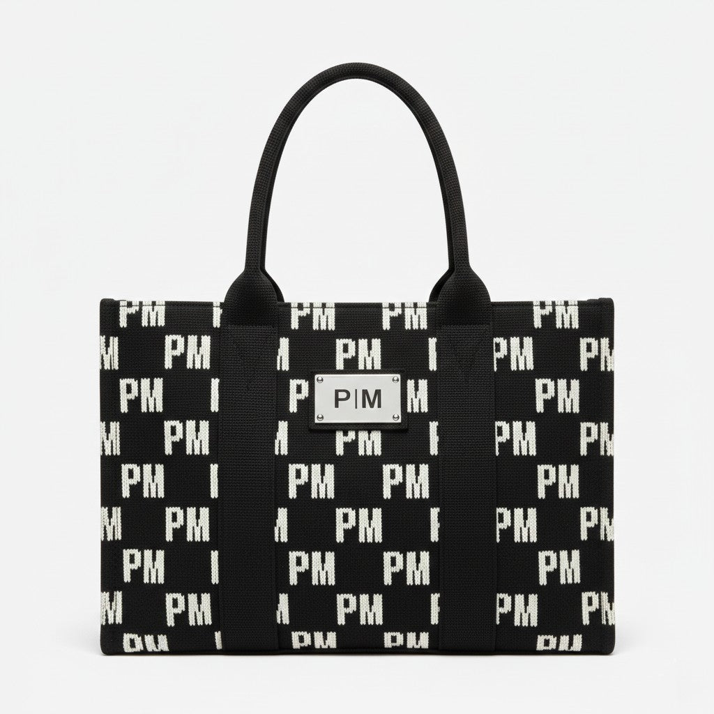 Monochromatic mastery with a tactile edge. The PM Noir Icon Knit Tote reimagines the luxury carryall through the lens of architectural knitwear. Constructed from our signature ultra-dense, engineered jacquard, this tote offers a rigid, boxy silhouette that defies the softness usually associated with textiles. The deep black structure is punctuated by the rhythmic repetition of the 'PM' monogram in stark white, creating a high-contrast visual identity. Elevated by a substantial, polished silver-tone metal logo plate that gleams against the dark canvas, this bag is the ultimate synthesis of utility and high-fashion status.